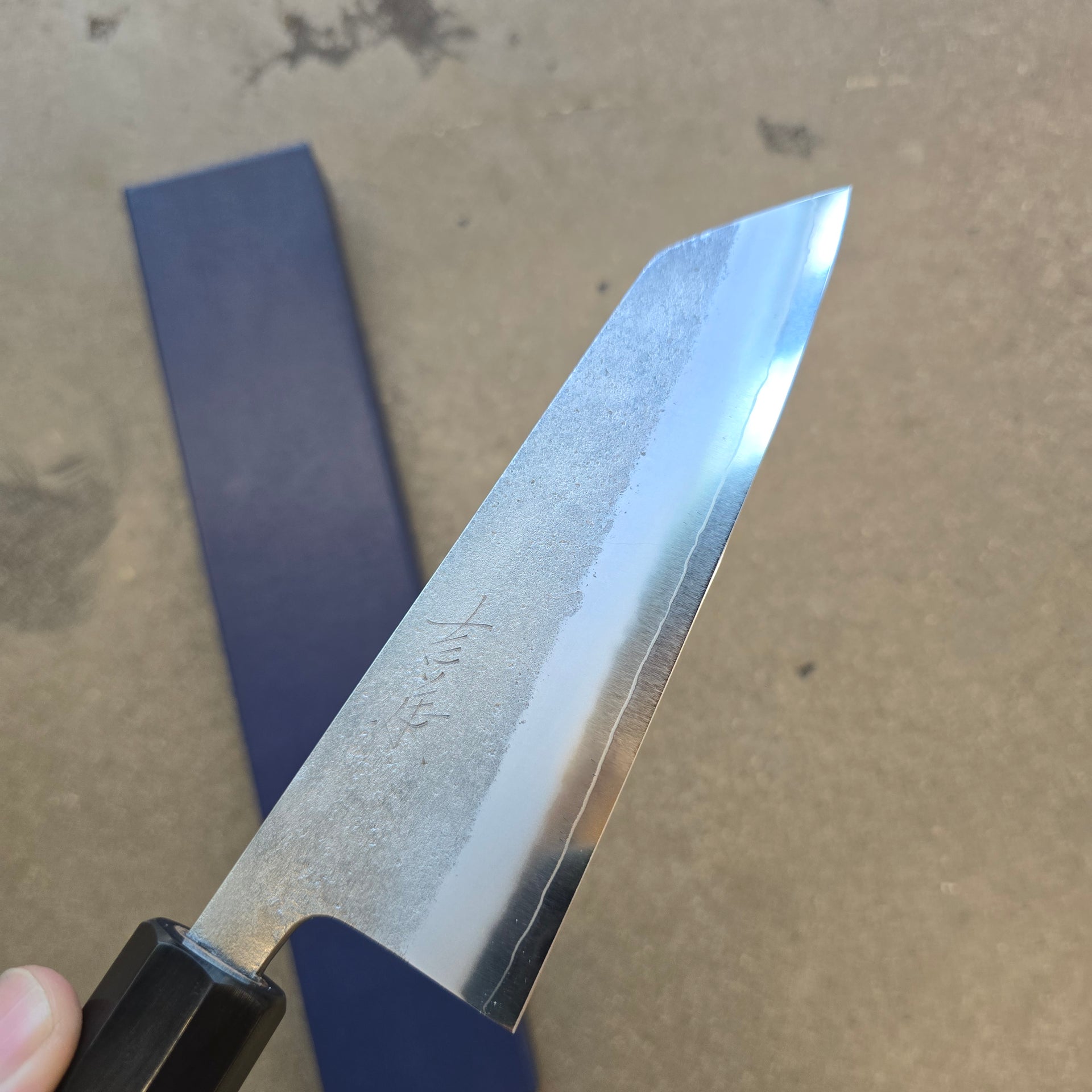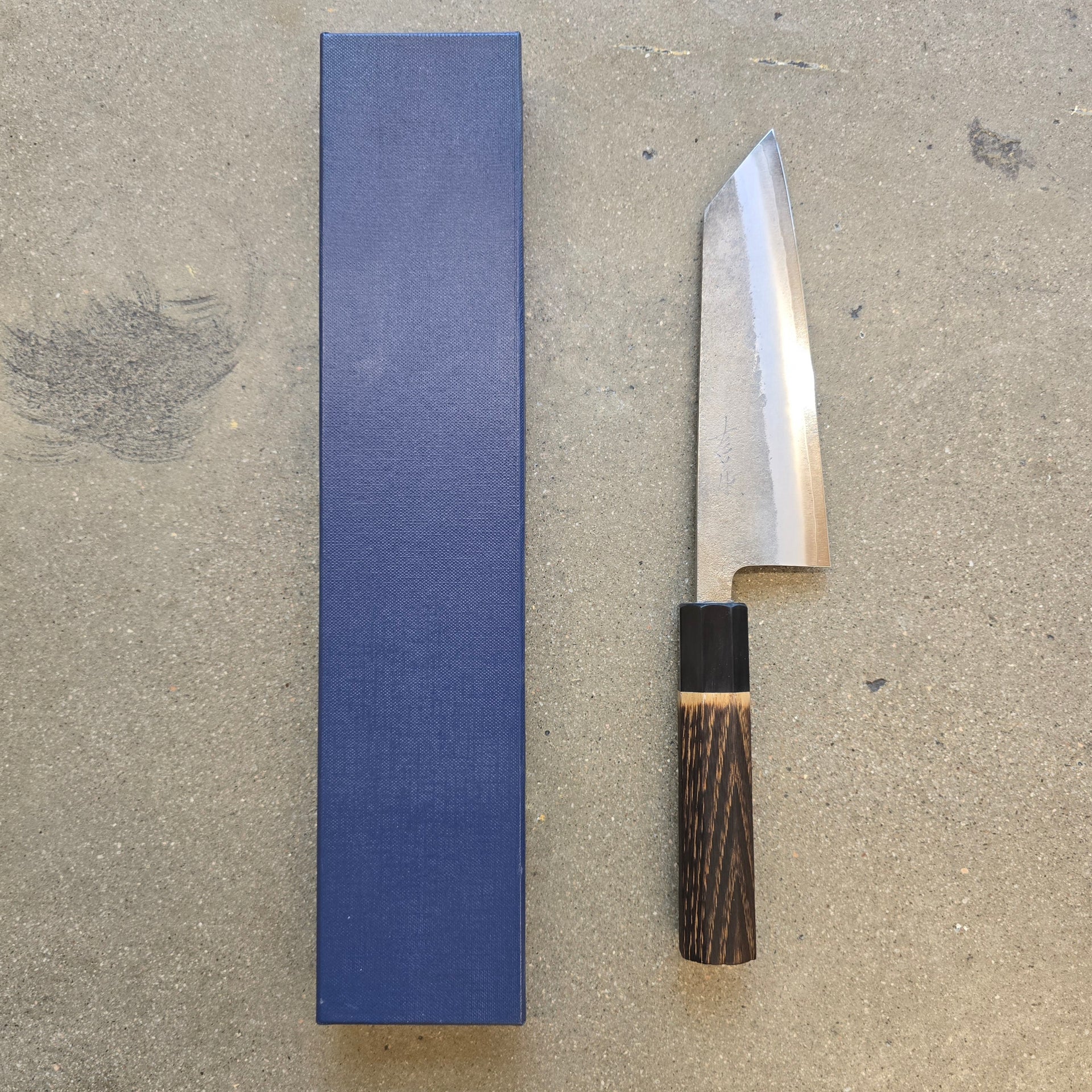 Yoshikane Hamono is located in Sanjo, Niigata and founded in 1919. It is lead by Mr. Kazuomi Yoshida who continues to excel and evolve in making high grade kitchen knives. This series is forged from SKD tool steel and cladded in stainless steel. SKD is considered a semi stainless and will form a patina slowly over time. SKD has very good edge holding ability, toughness, and sharpens very easily. Extremely even grinds that are very thin behind the edge. Thicker spine out of the handle with forged distal taper and very thin tips. These knives in our opinion are among the top in terms of cutting ability and overall quality. Fitted with an octagonal burnt chestnut wood and buffalo ferrule handle.