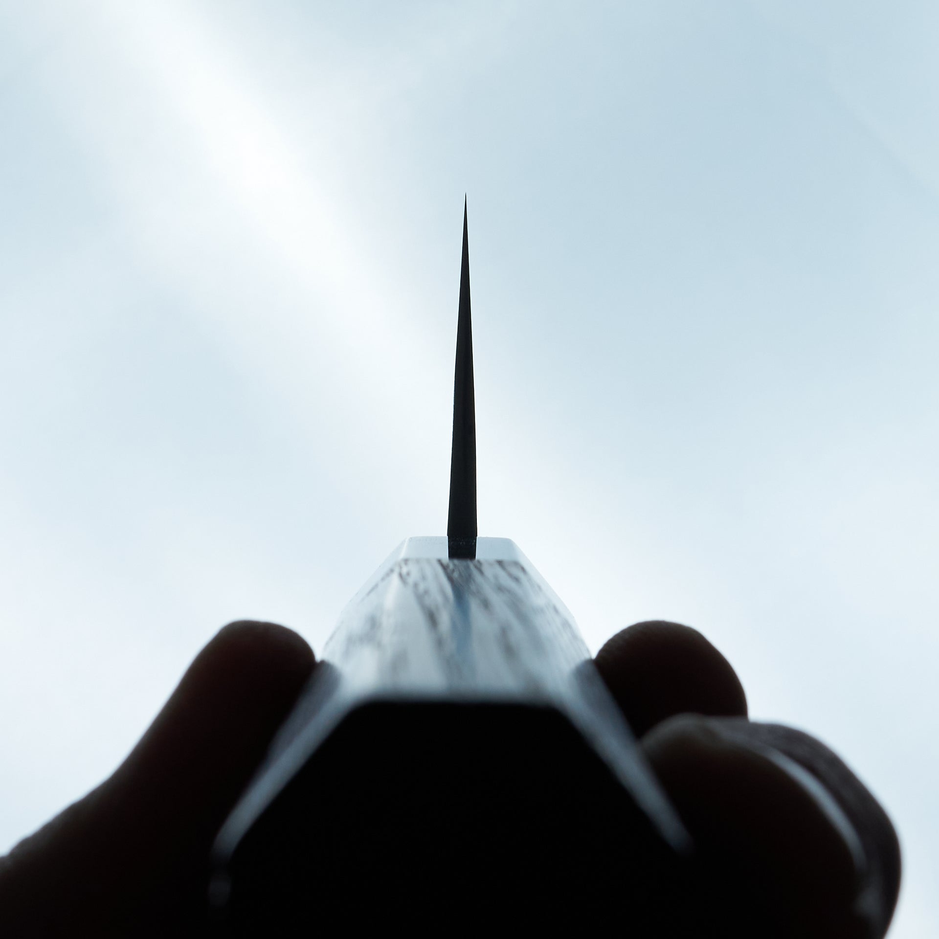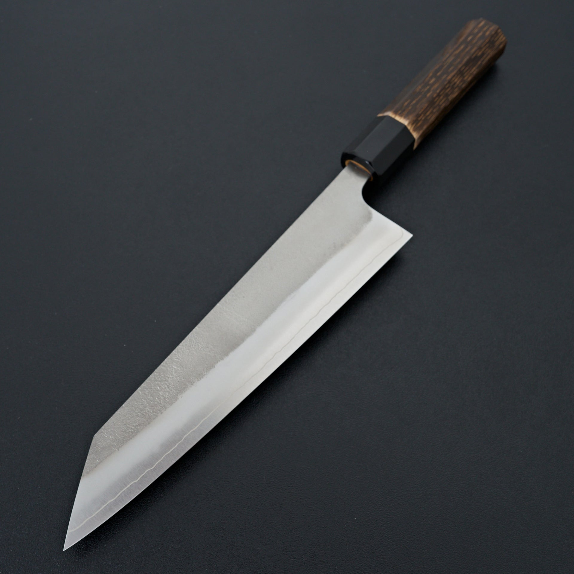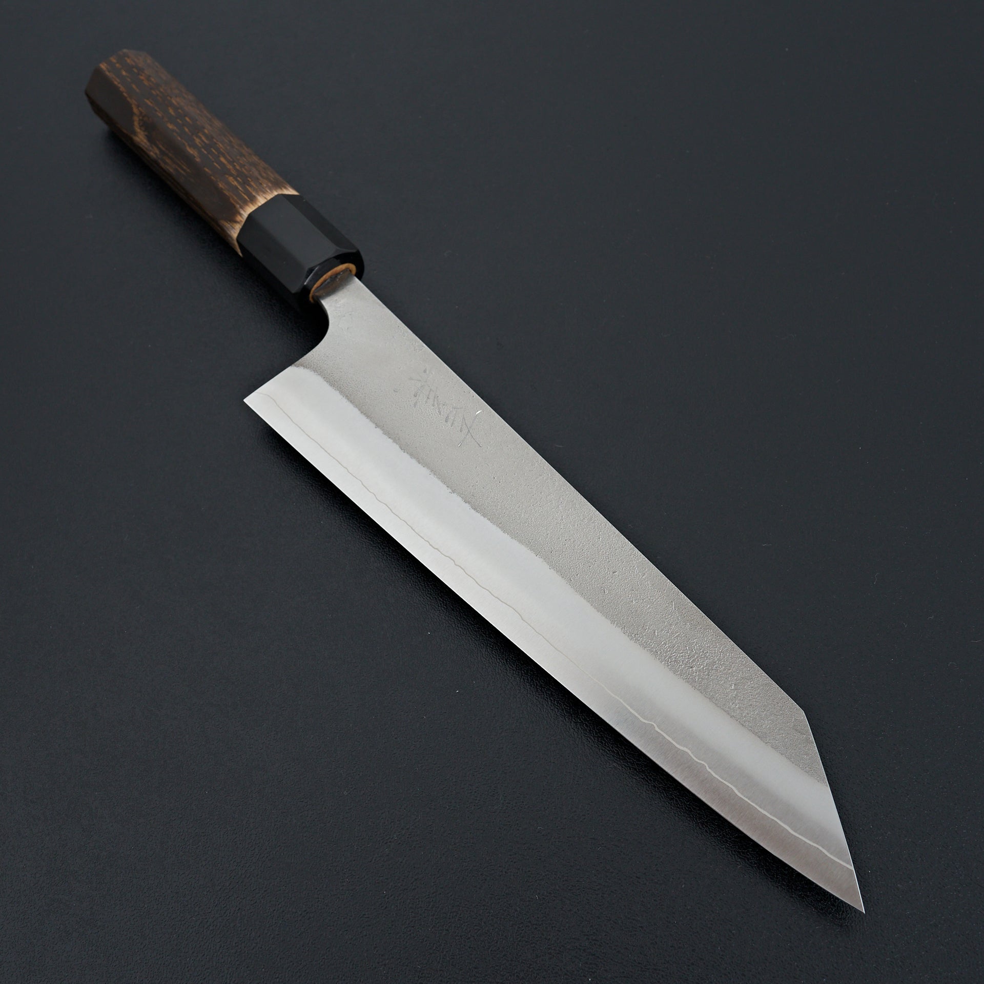 This series is forged from SKD tool steel and cladded in stainless steel. SKD is considered a semi stainless and will form a patina slowly over time. SKD has great edge life, toughness, and sharpens very easily. Extremely even grinds that are very thin behind the edge. Thicker spine out of the handle with forged distal taper and very thin tips. These knives in our opinion are among the top in terms of cutting ability and overall quality. Fitted with an octagonal burnt chestnut handle and buffalo ferrule.