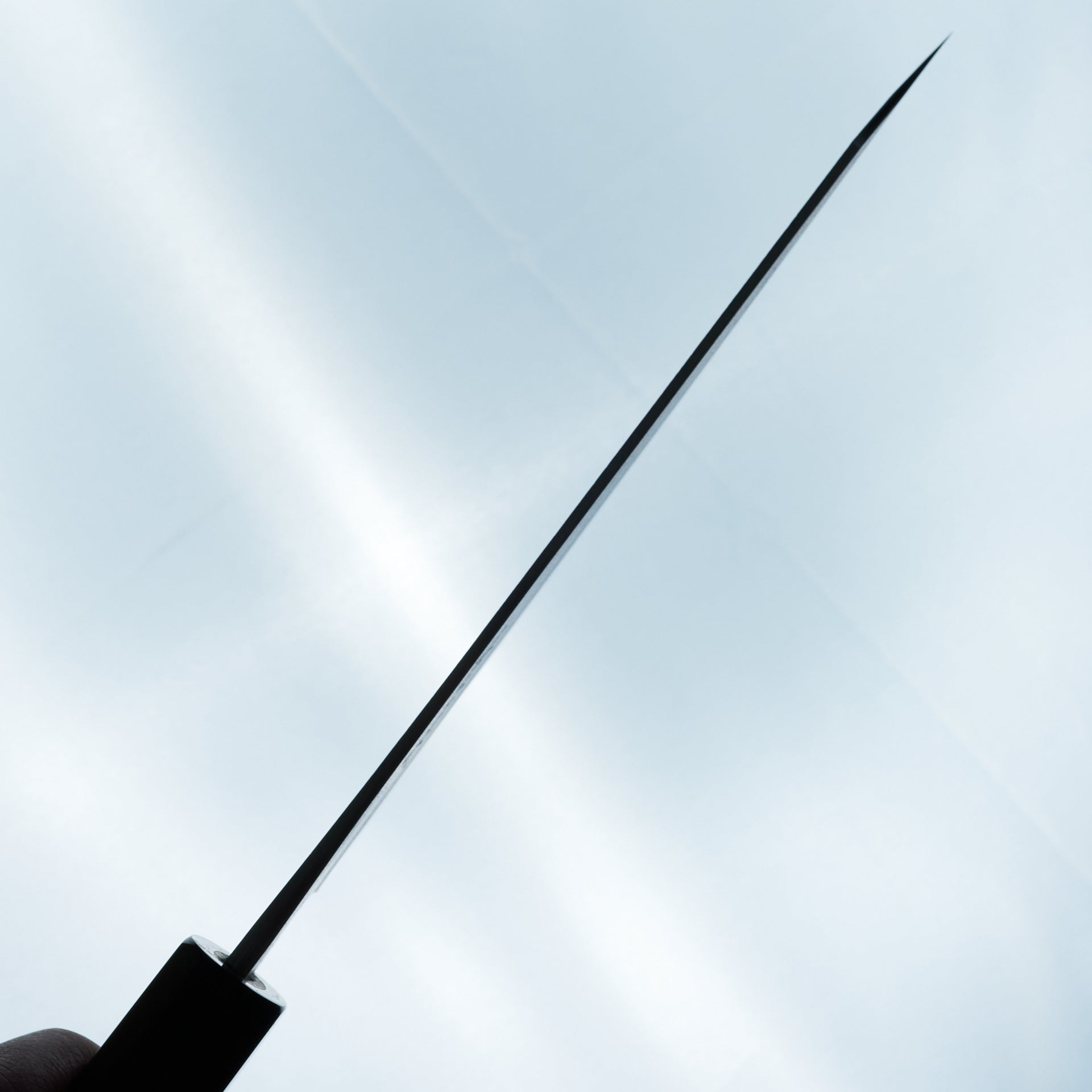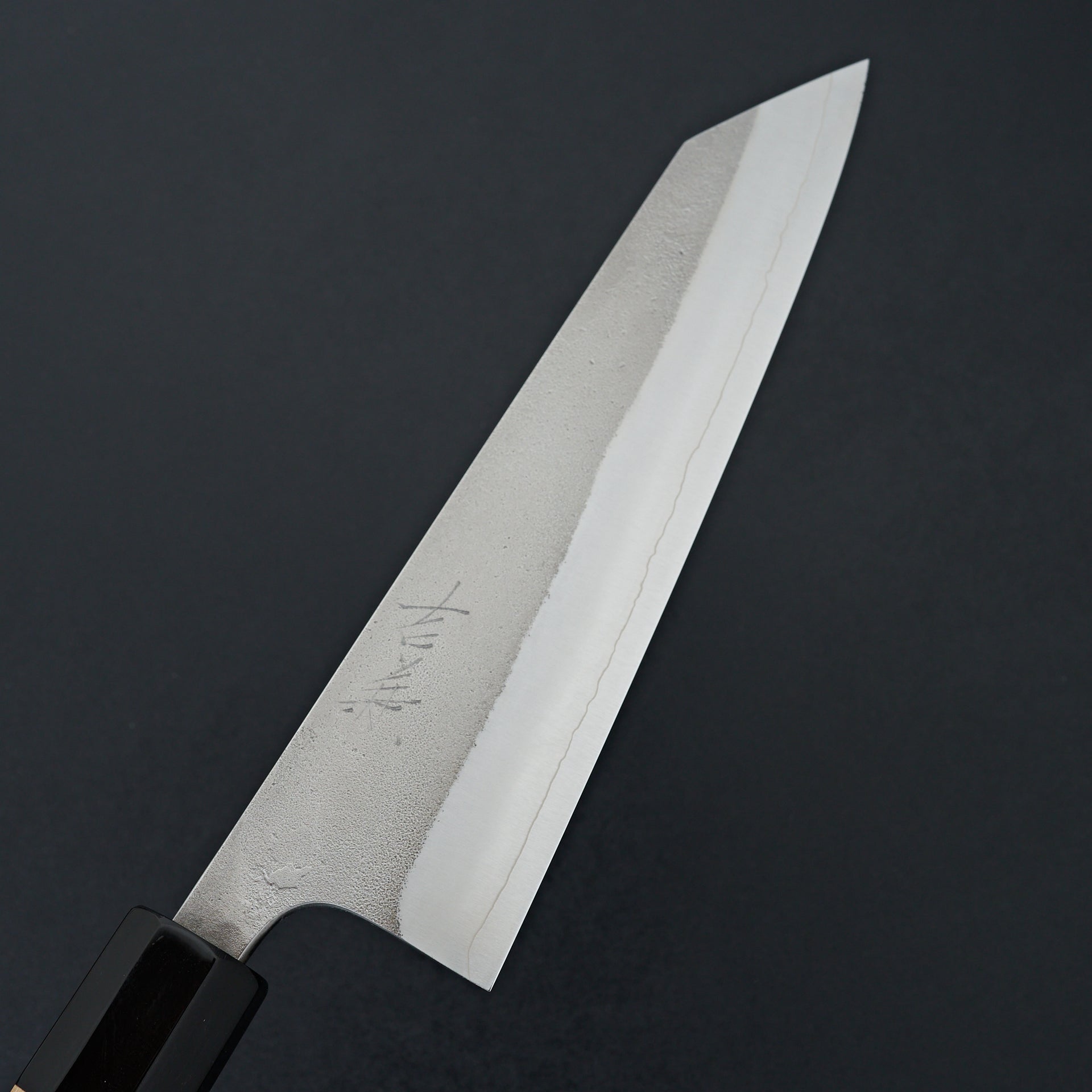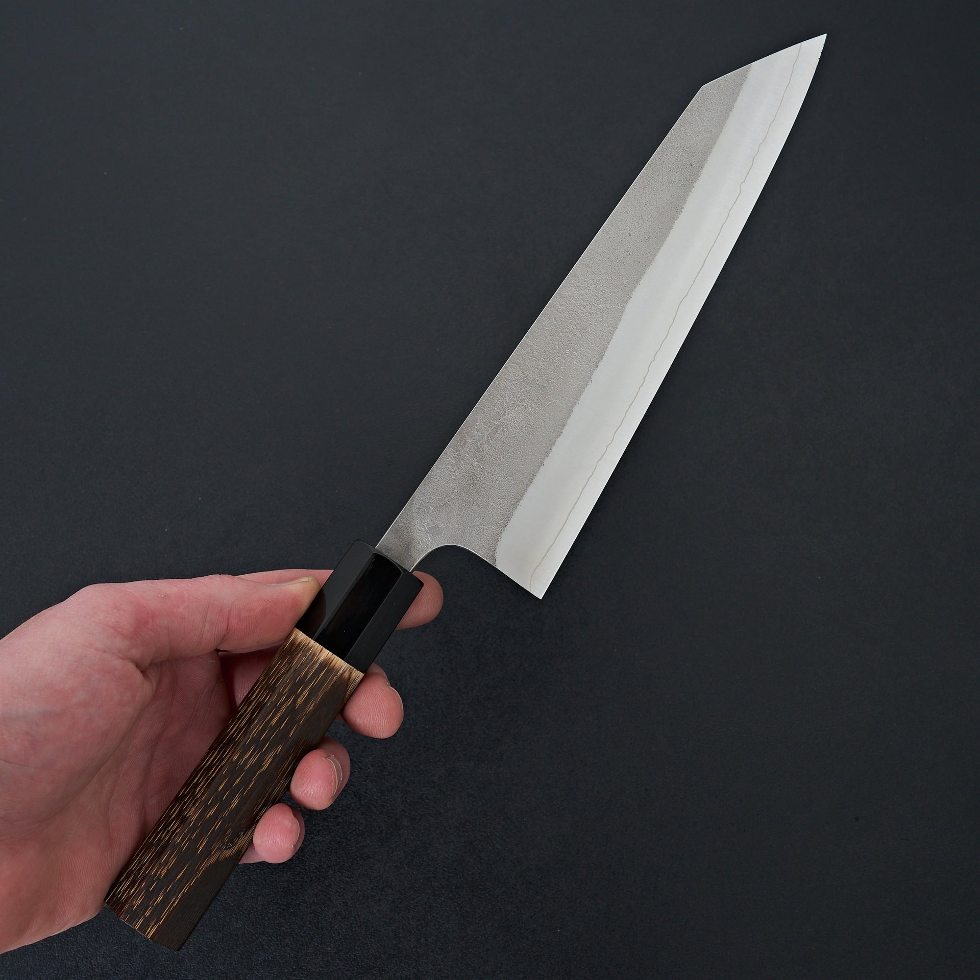 This series is forged from SKD tool steel and cladded in stainless steel. SKD is considered a semi stainless and will form a patina slowly over time. SKD has great edge life, toughness, and sharpens very easily. Extremely even grinds that are very thin behind the edge. Thicker spine out of the handle with forged distal taper and very thin tips. These knives in our opinion are among the top in terms of cutting ability and overall quality. Fitted with an octagonal burnt chestnut handle and buffalo ferrule.