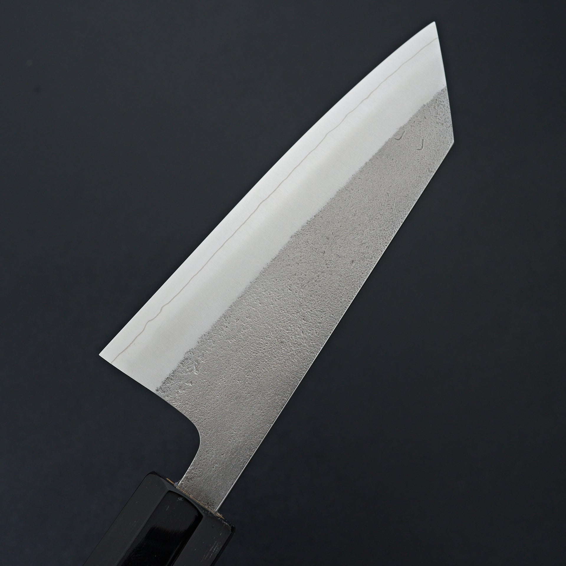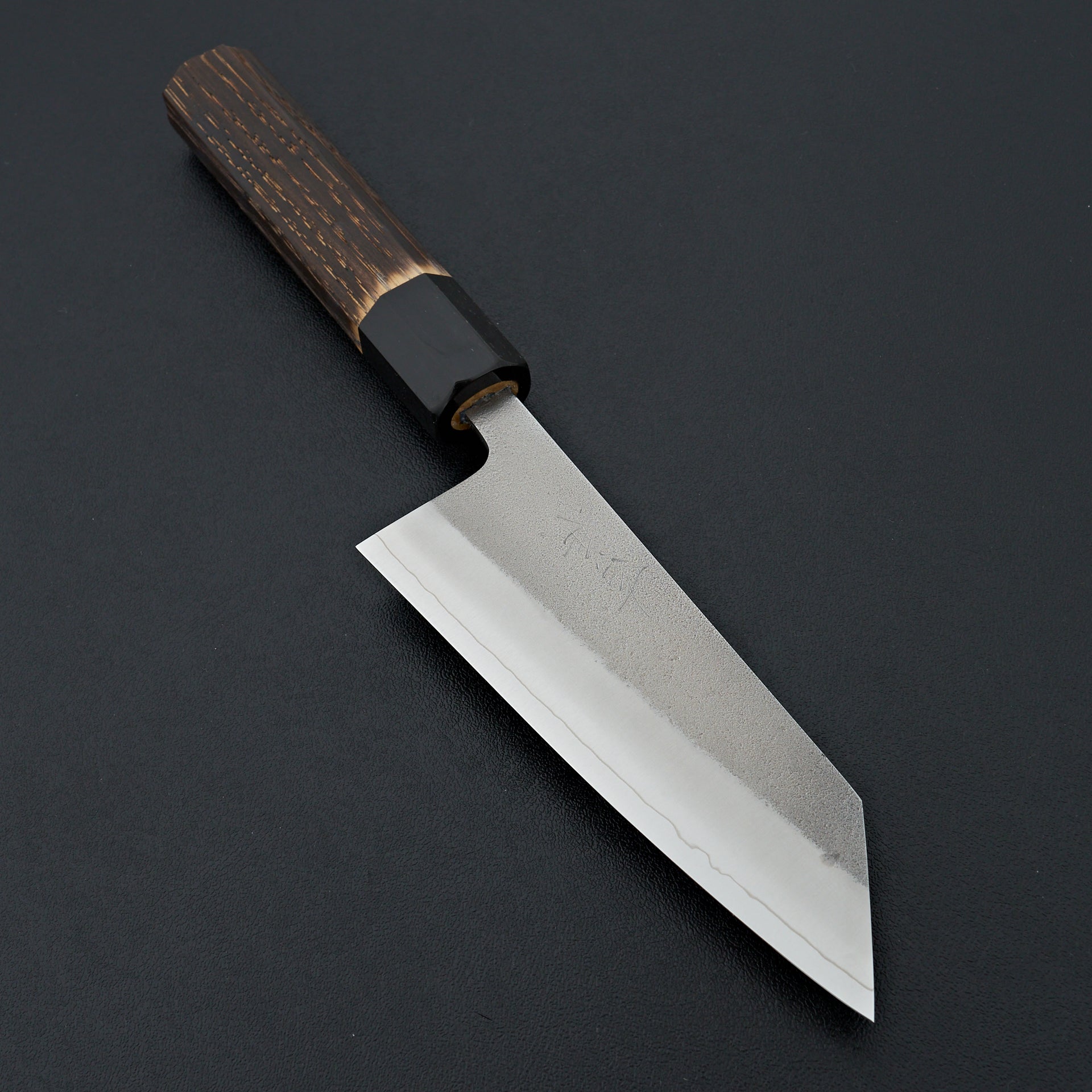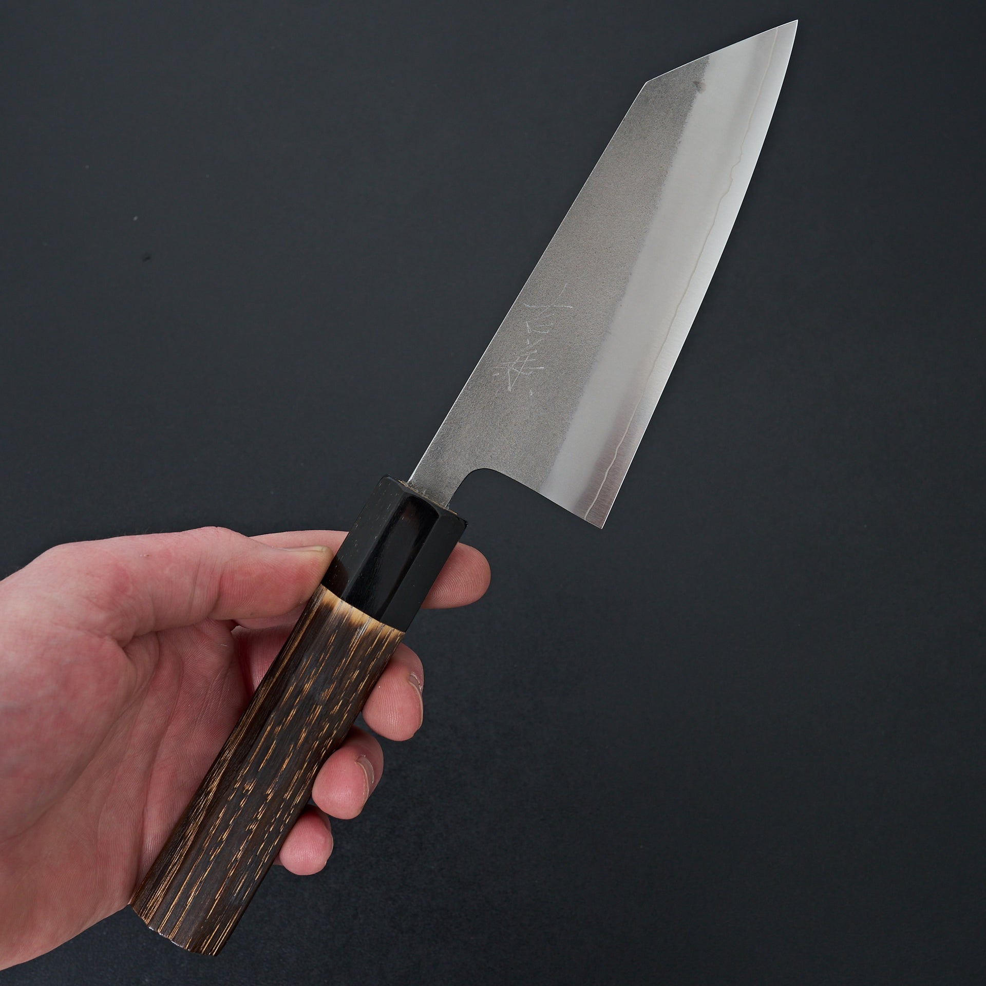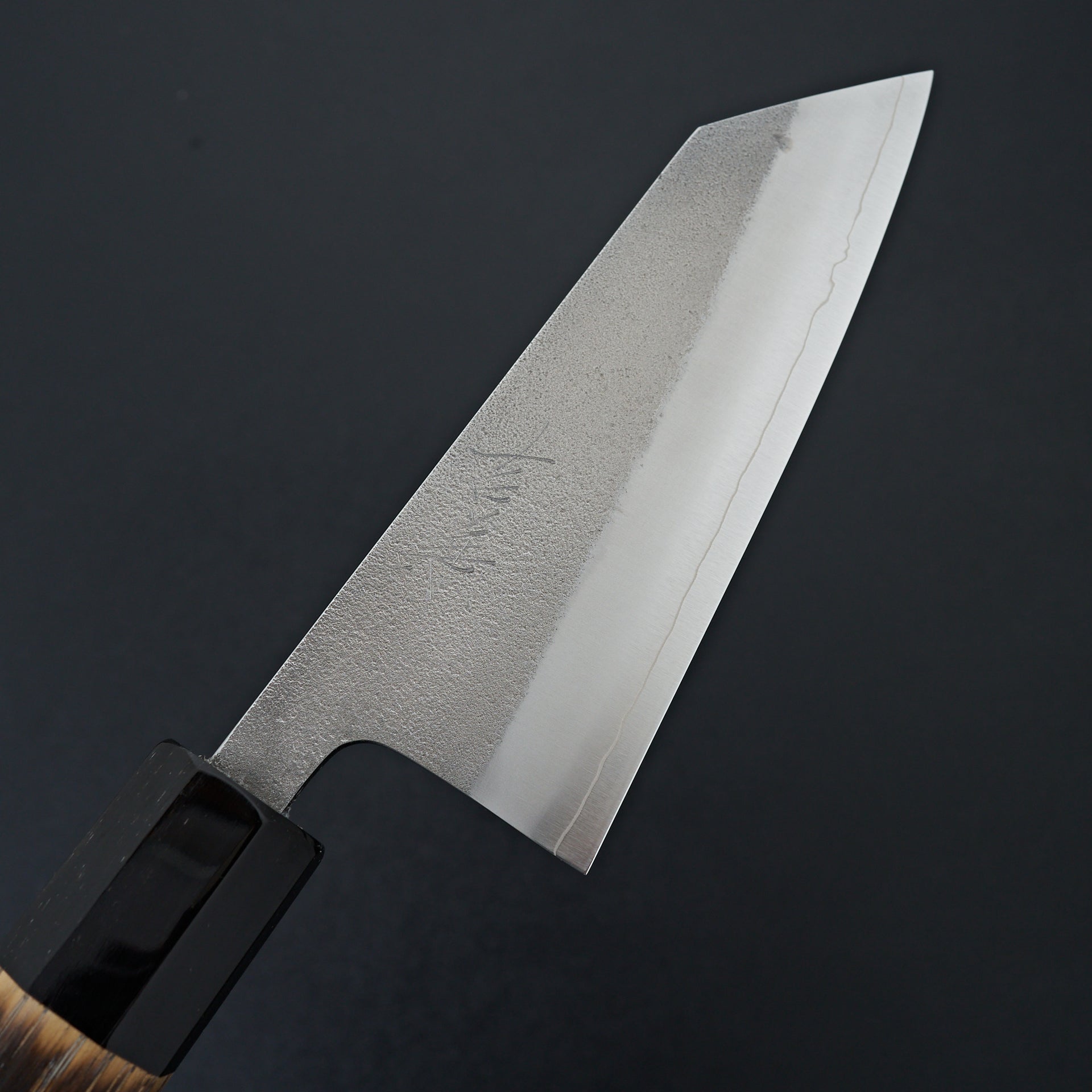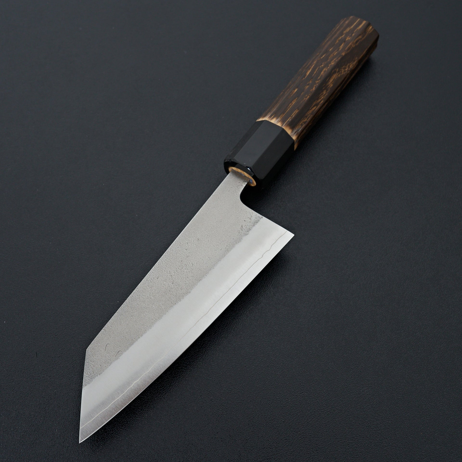 This series is forged from SKD tool steel and cladded in stainless steel. SKD is considered a semi stainless and will form a patina slowly over time. SKD has very good edge holding ability, toughness, and sharpens very easily. Extremely even grinds that are very thin behind the edge. Thicker spine out of the handle with forged distal taper and very thin tips. These knives in our opinion are among the top in terms of cutting ability and overall quality. Fitted with an octagonal burnt chestnut wood and buffalo ferrule handle.