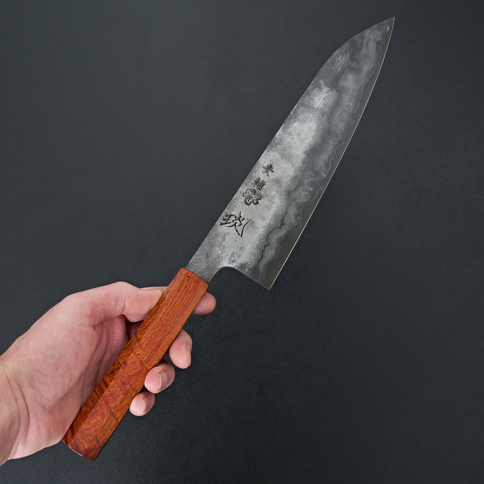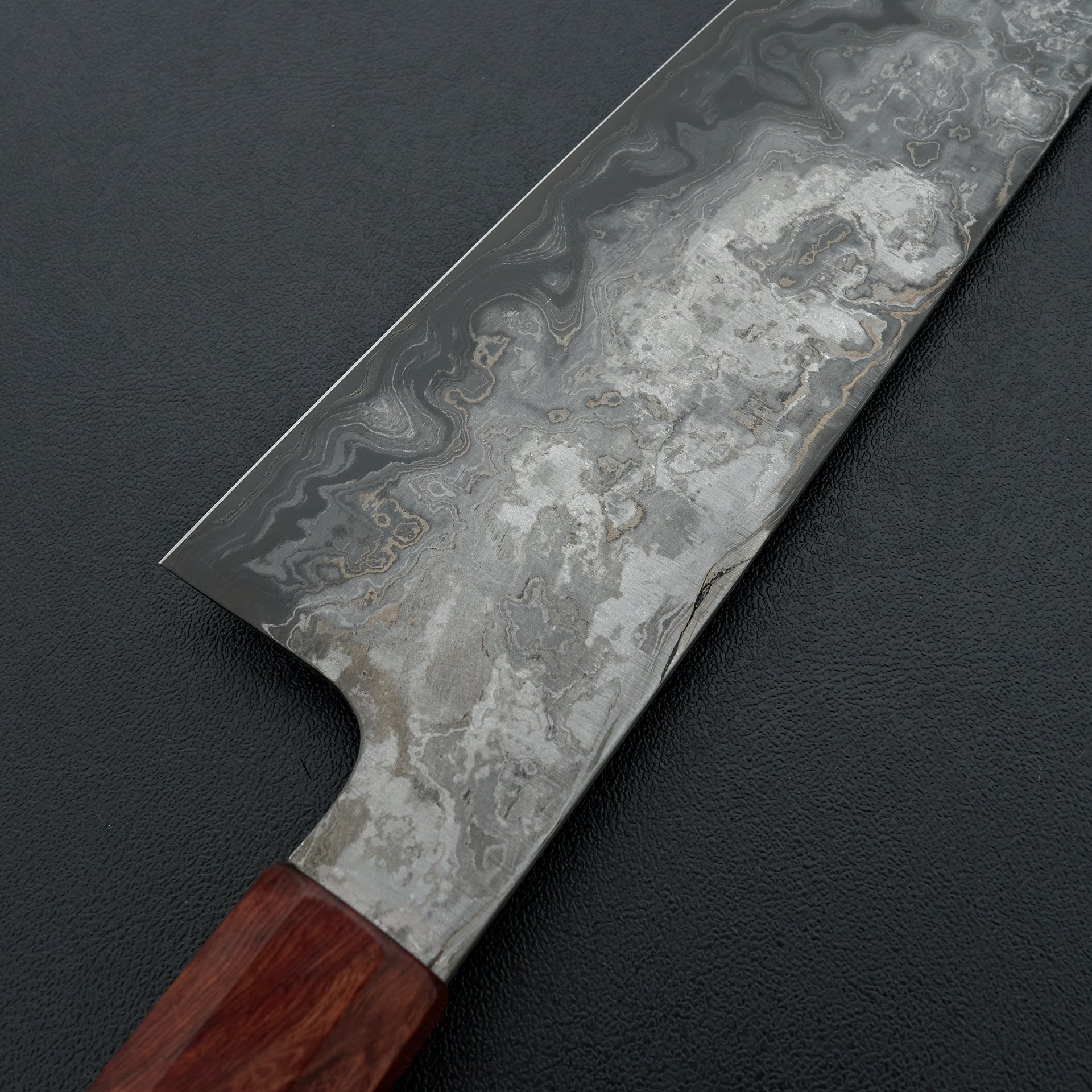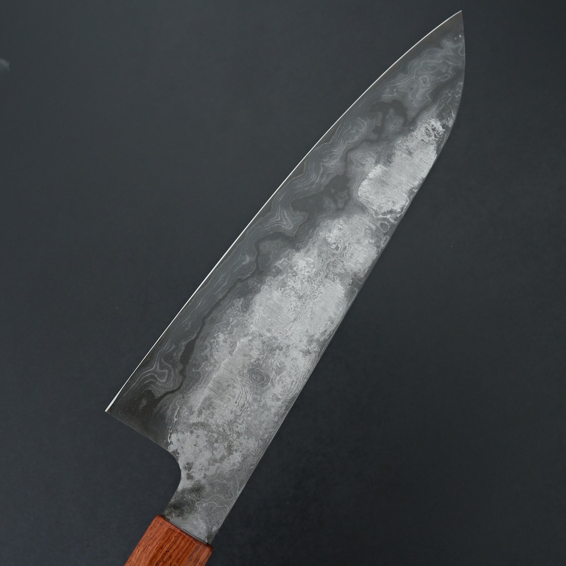The KOKUENN series is one of his highest offerings. The blade is hand forged using Aogami #1 core, hand laminated with a housemade high layer damascus made from Aogami #2 and soft iron. The blade is fully ground and etched deeply to reveal the damascus patterning, finished with Kisuke engraving and stamps. Comes fitted with an octagonal figured rosewood handle that plays well with the waves in the damascus steel.