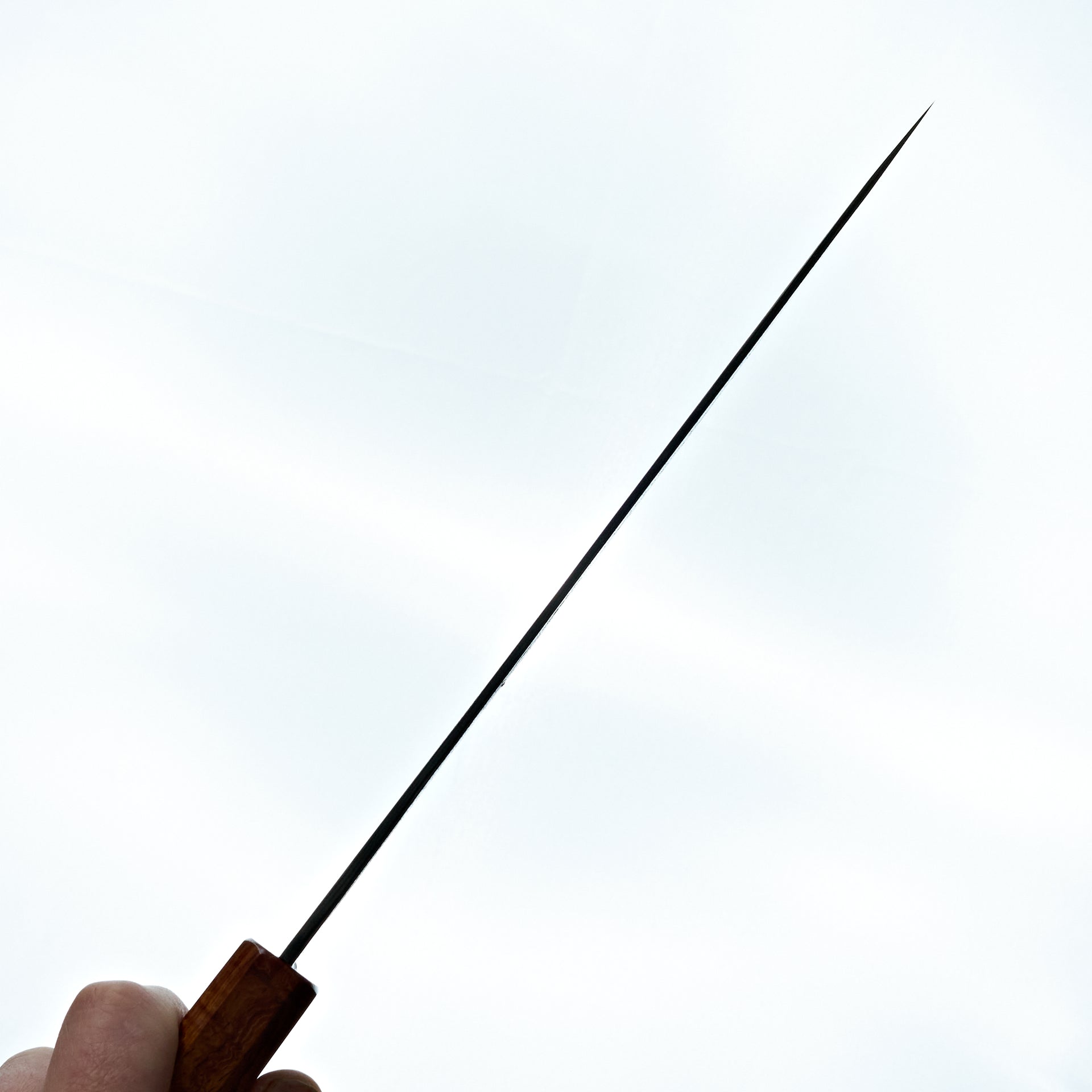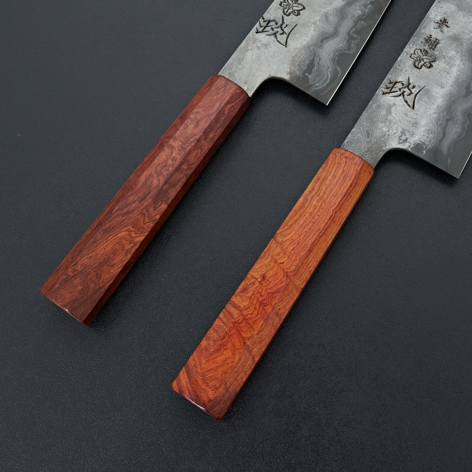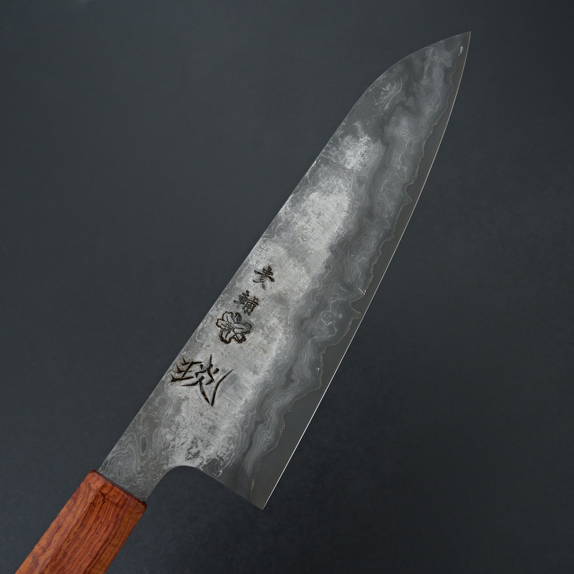 The KOKUENN series is one of his highest offerings. The blade is hand forged using Aogami #1 core, hand laminated with a housemade high layer damascus made from Aogami #2 and soft iron. The blade is fully ground and etched deeply to reveal the damascus patterning, finished with Kisuke engraving and stamps. Comes fitted with an octagonal figured rosewood handle that plays well with the waves in the damascus steel.
