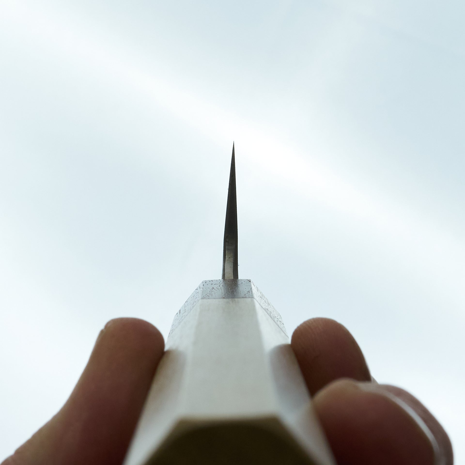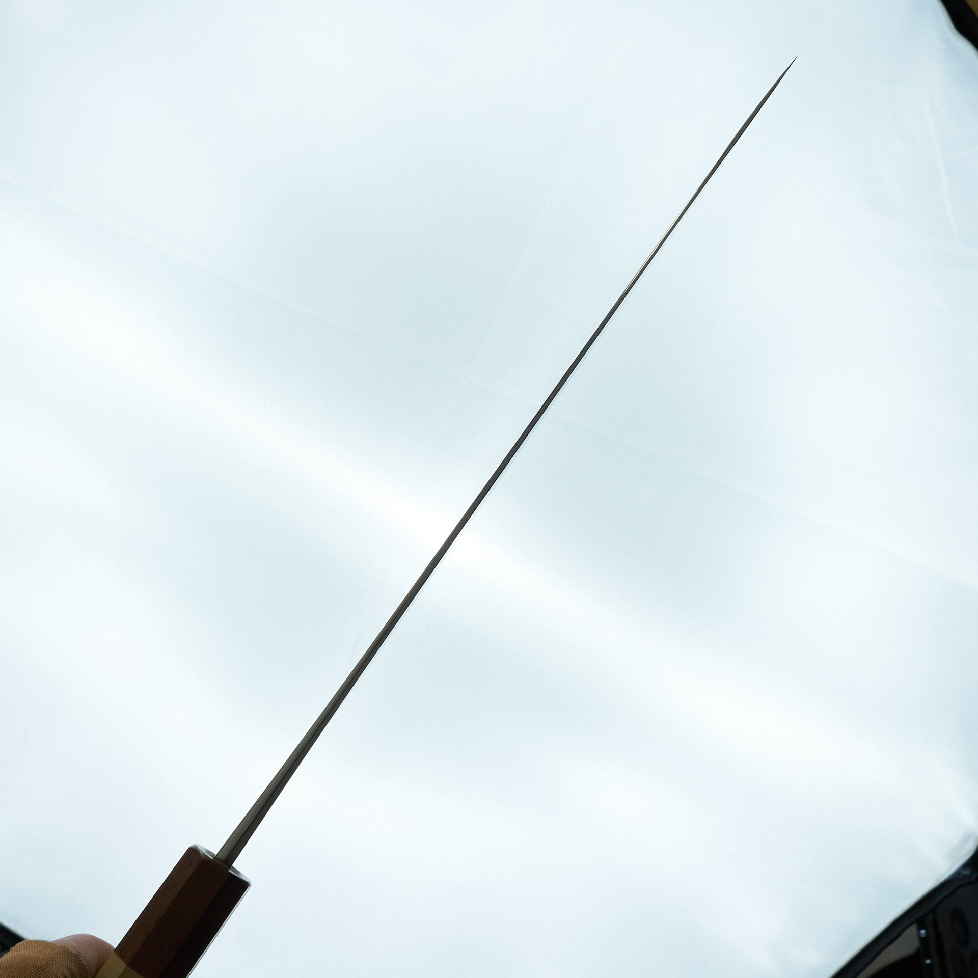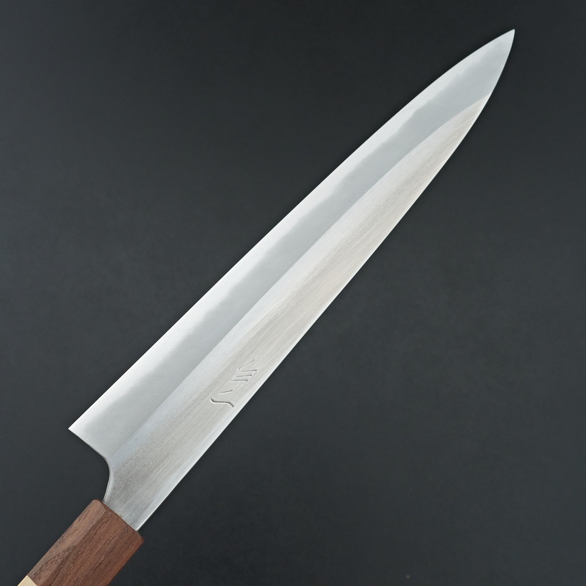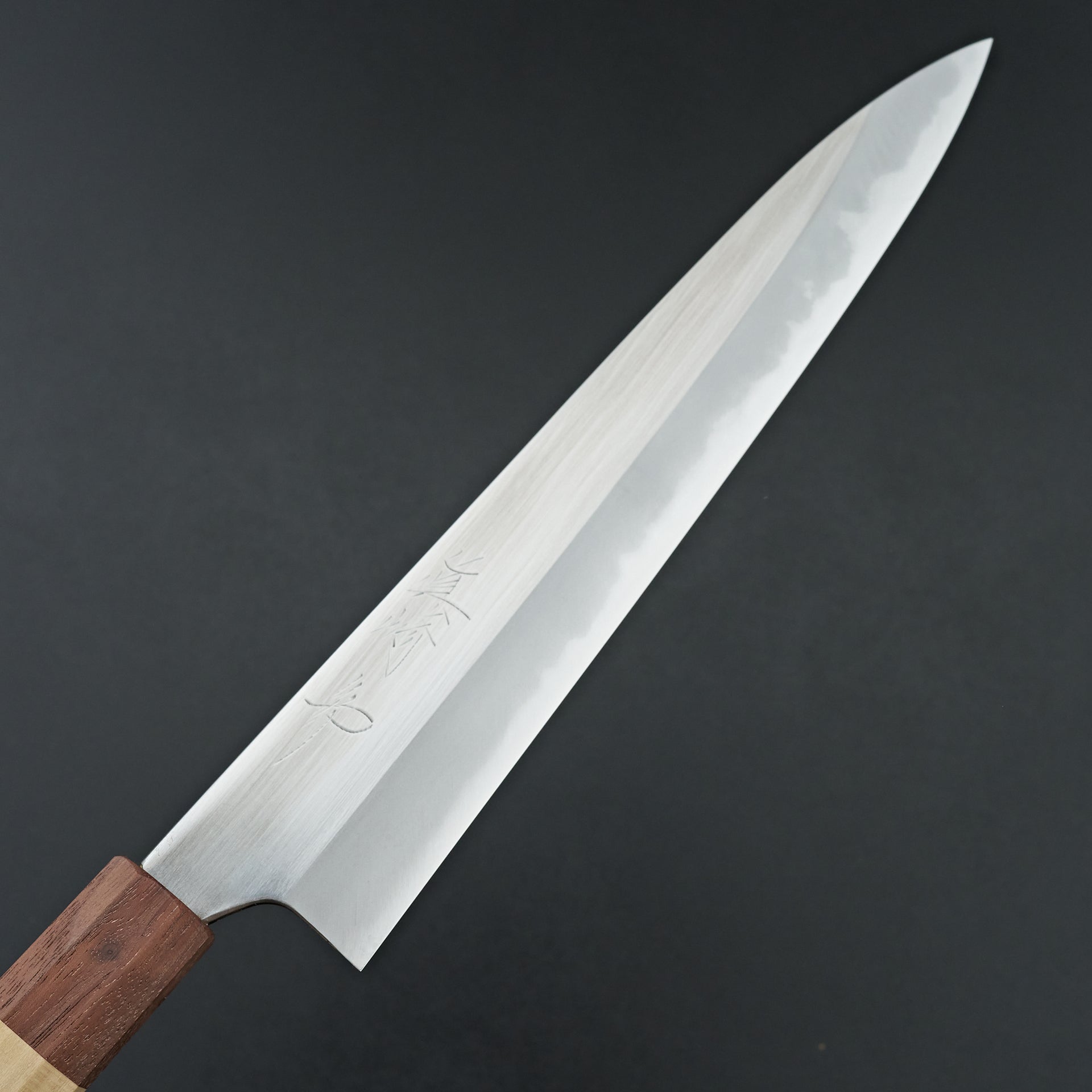 He focuses primarily on forging Shirogami (White) #2 carbon steel cladded in iron. The blade is migaki polished for ease of maintenance and cleaning in future. The bevels are finished by hand on Japanese whetstones to ensure an even grind and geometry. The forged distal taper is quite impressive and has a nice progressive thinness towards the tip. Lightly convexed bevels and very thin behind the cutting edge. The octagonal handle is made from keyaki and horn ferrule.
