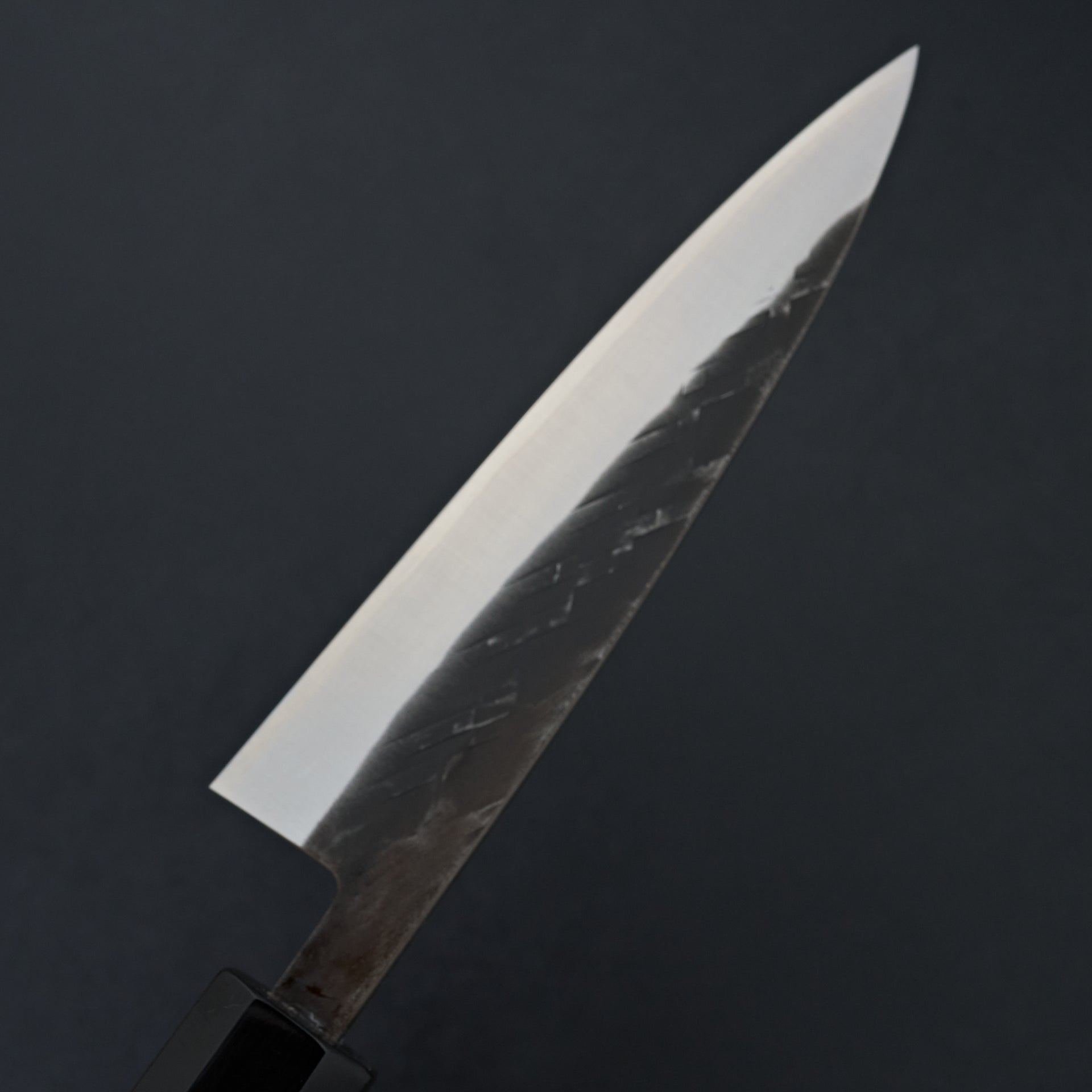 This series is hand forged from SLD semi stainless tool steel, laminated in a soft stainless cladding. SLD, though considered semi stainless, is quite easy to care for and very comparable to stainless in terms of upkeep. It has a high carbon content and high hardness (~64hrc) comparable to that of purer carbon steels. SLD is praised for great edge retention and good durability despite its hardness. The blade face is finished black with hammered tsuchime patterns. These come fitted with octagonal bocote and horn ferrule handles.