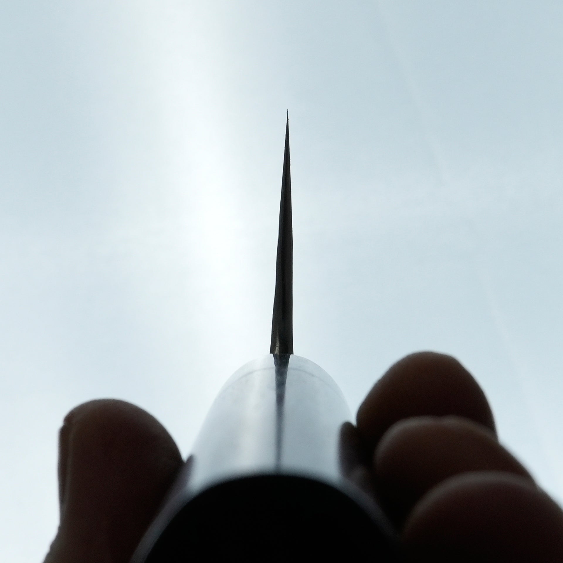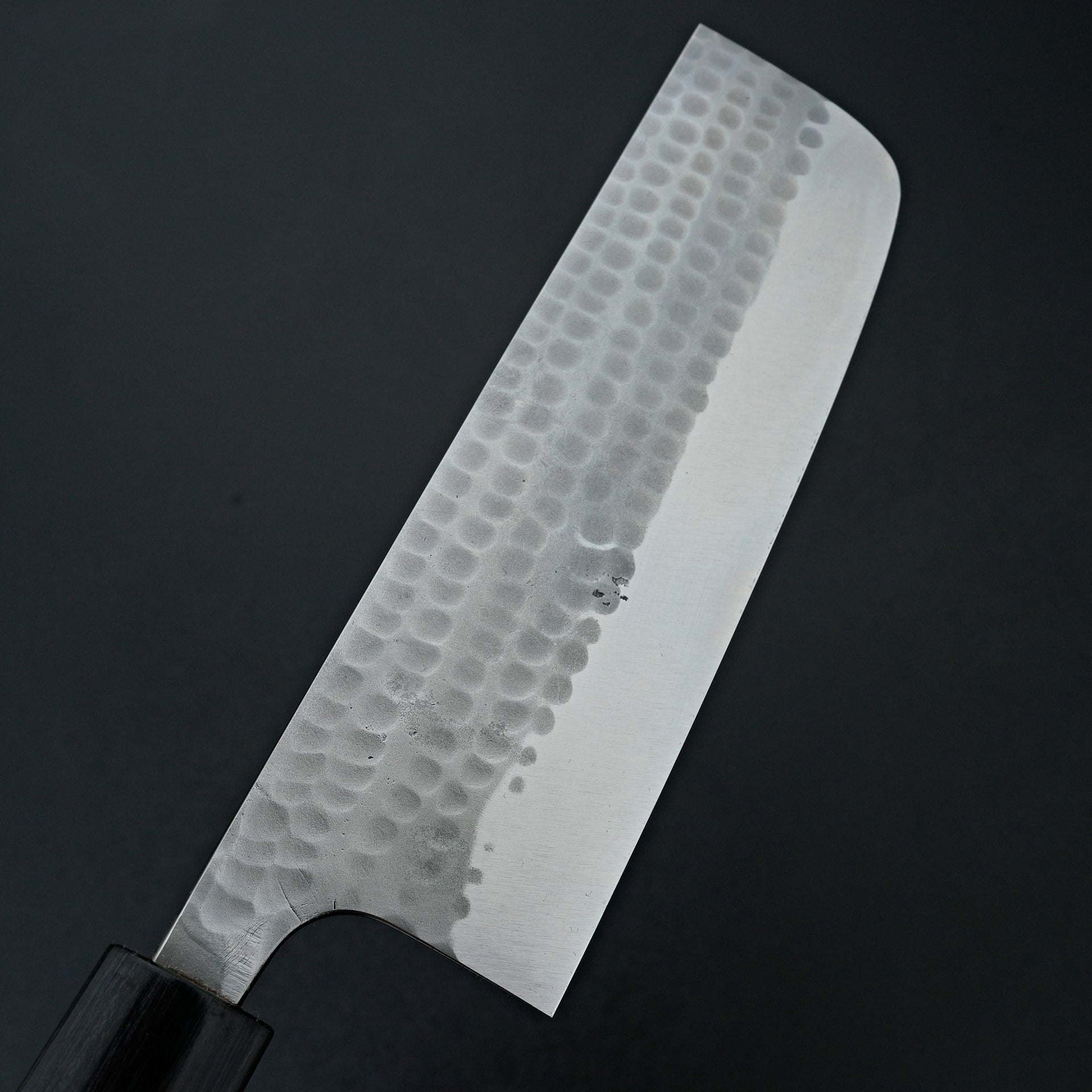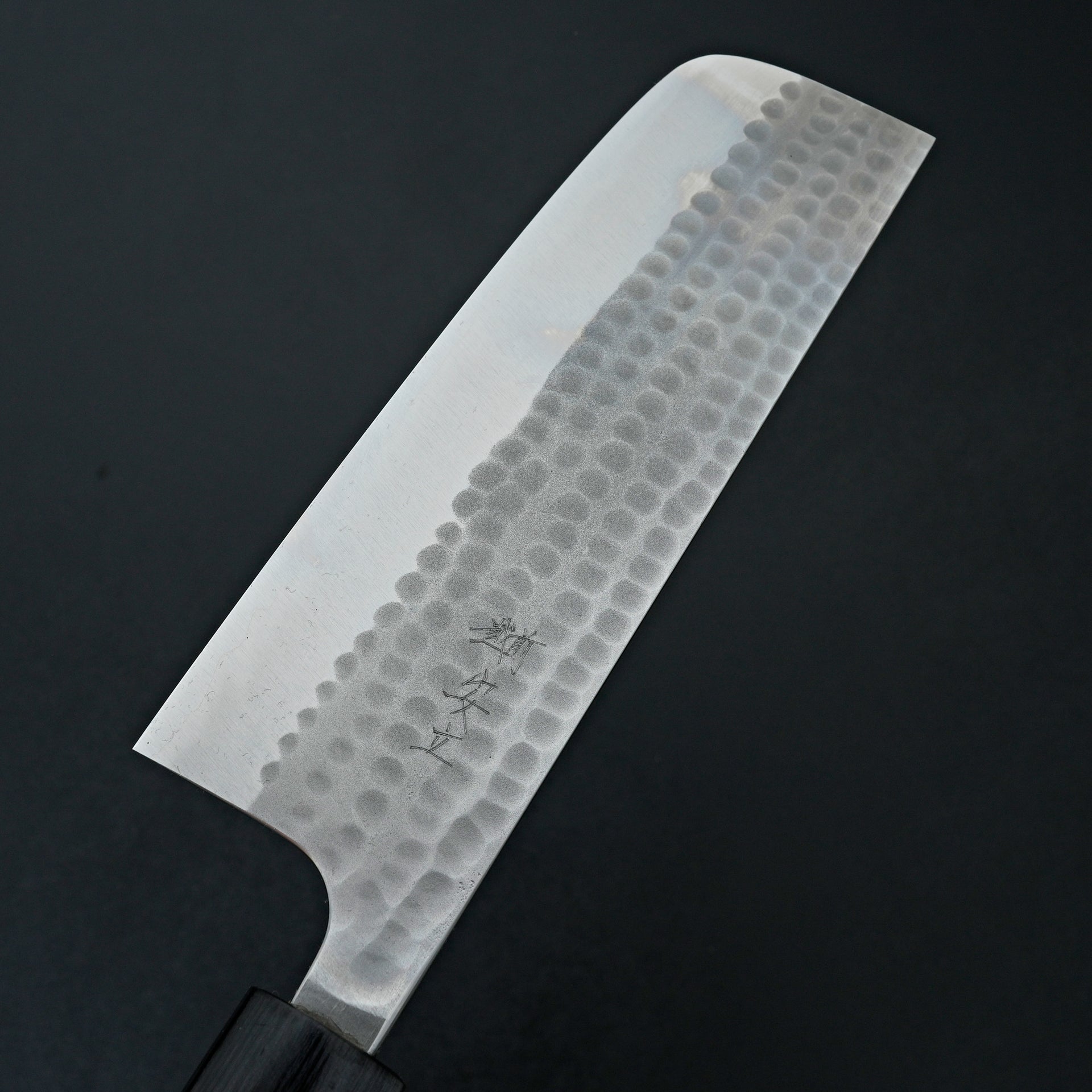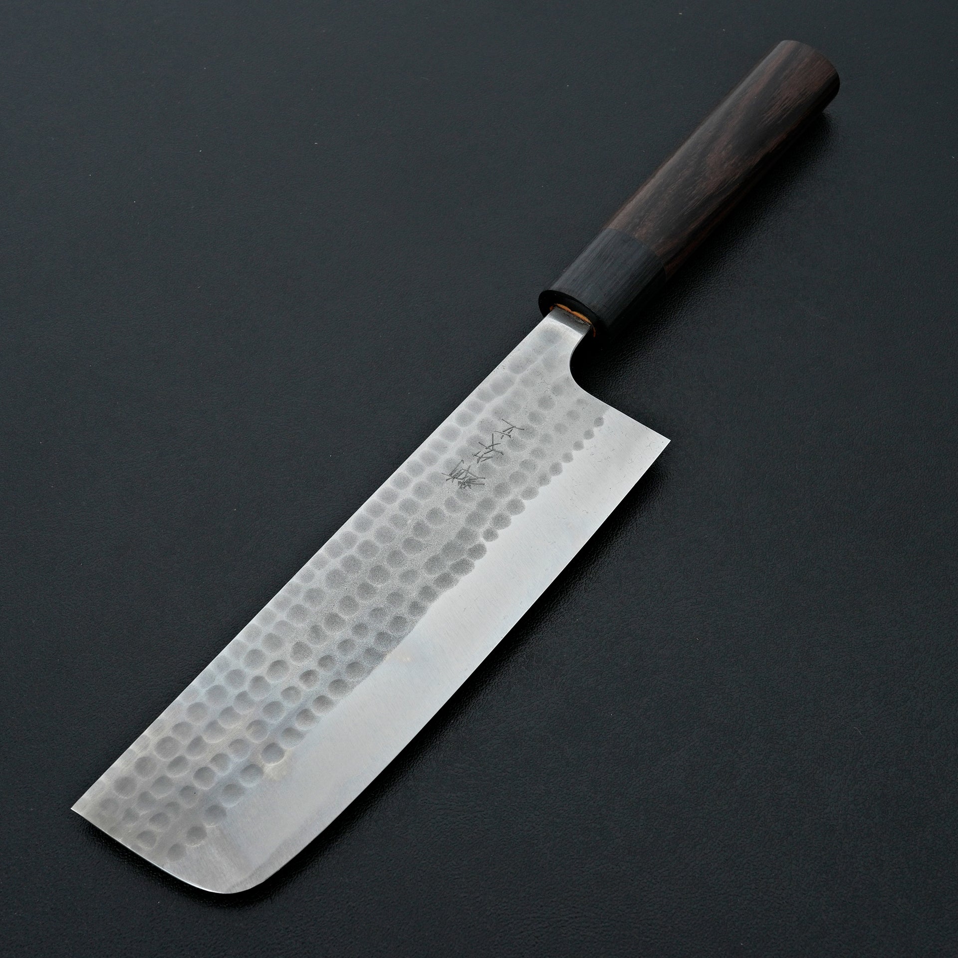 His Hammered or "tsuchime" line is forged from aogami (blue) #2 steel, wrapped in a stainless cladding. These knives sharpen very easily and have superb edge retention. I have found that these knives have very consistent grinds and great fit and finish. Fitted with a rosewood oval handle.
