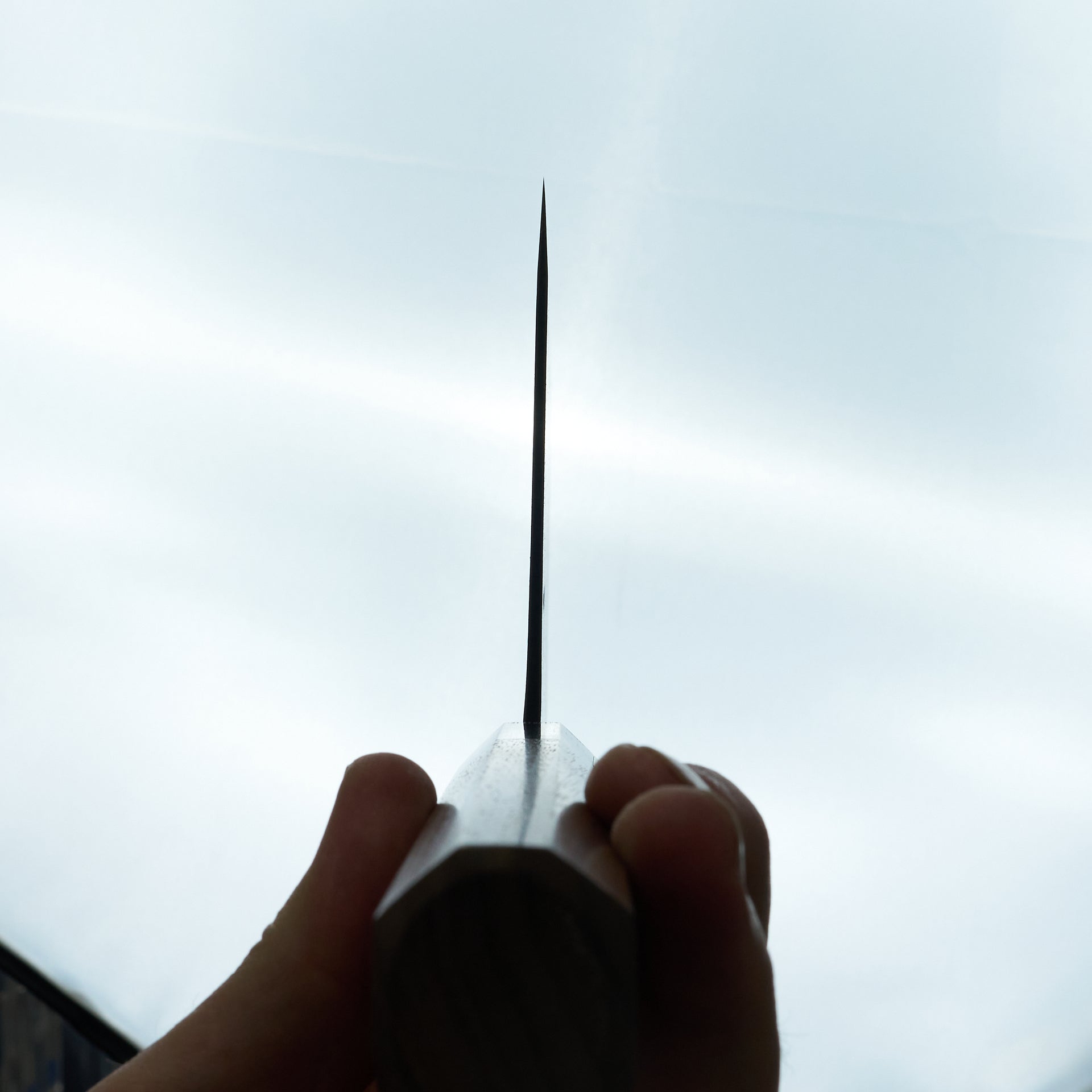 Ground convex and thin behind the edge these knives have a beautiful cutting feel and food release. The hardness is rated at 64-65 HRC, with amazing edge retention. These knives have a nice feel in the hand, not too light but still feel very precise.
