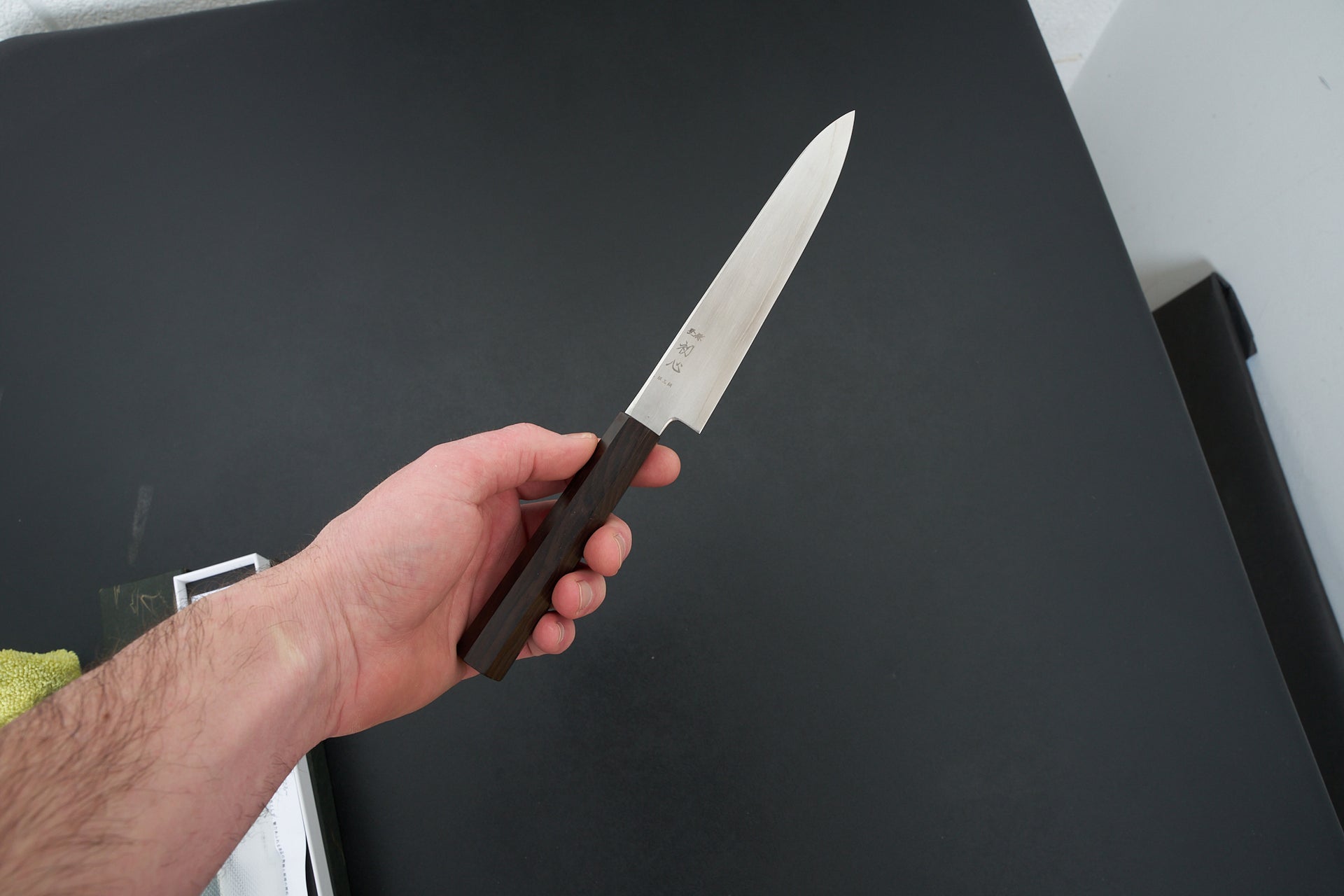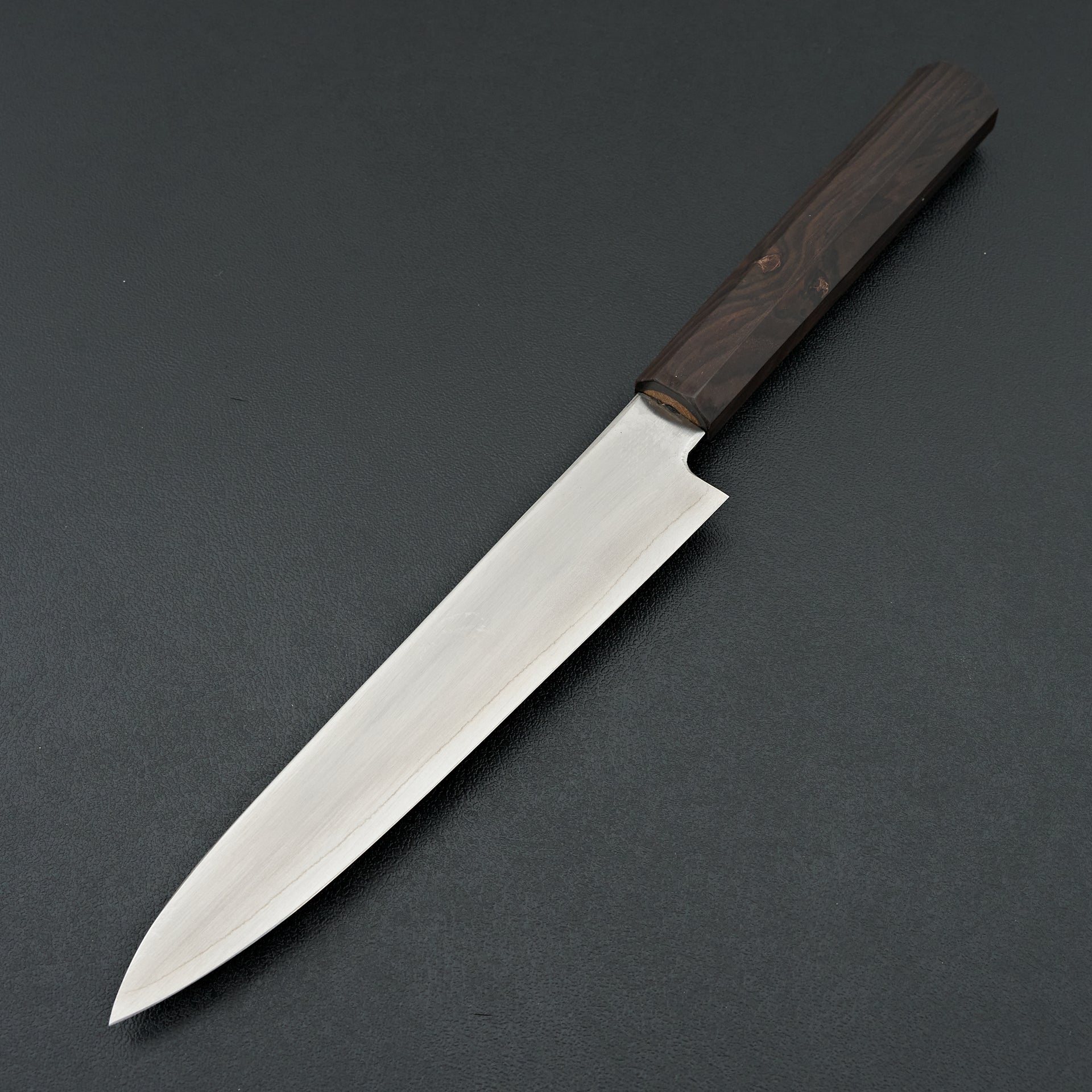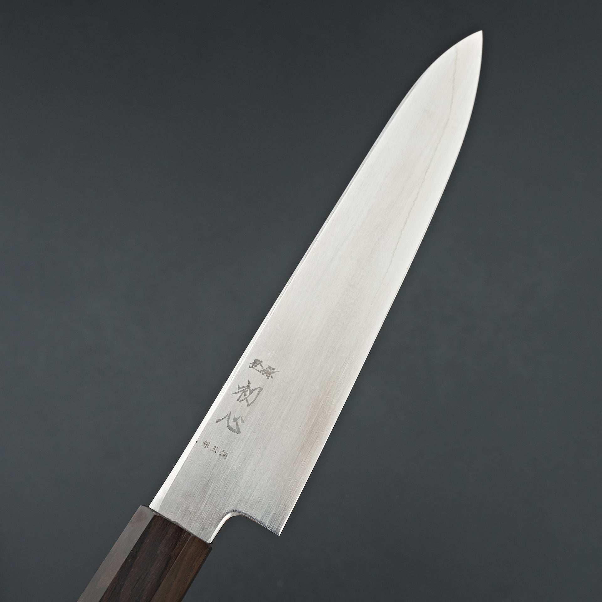 The Hatsukokuro Ginsou series is made from Ginsan (Silver #3) Stainless Steel laminated in soft stainless cladding. The blade is satin finished.These are ground very thin at the edge but have a more medium weight feel. Fitted with an octagonal mono ebony wood handle.