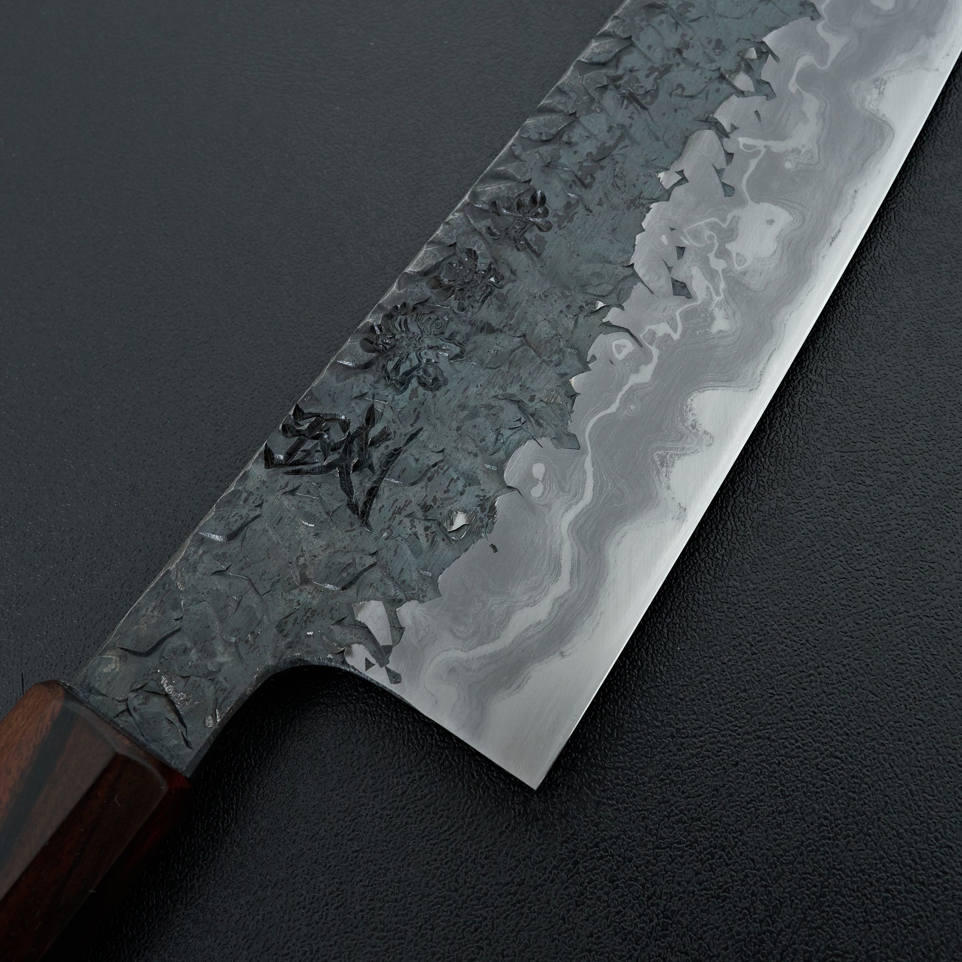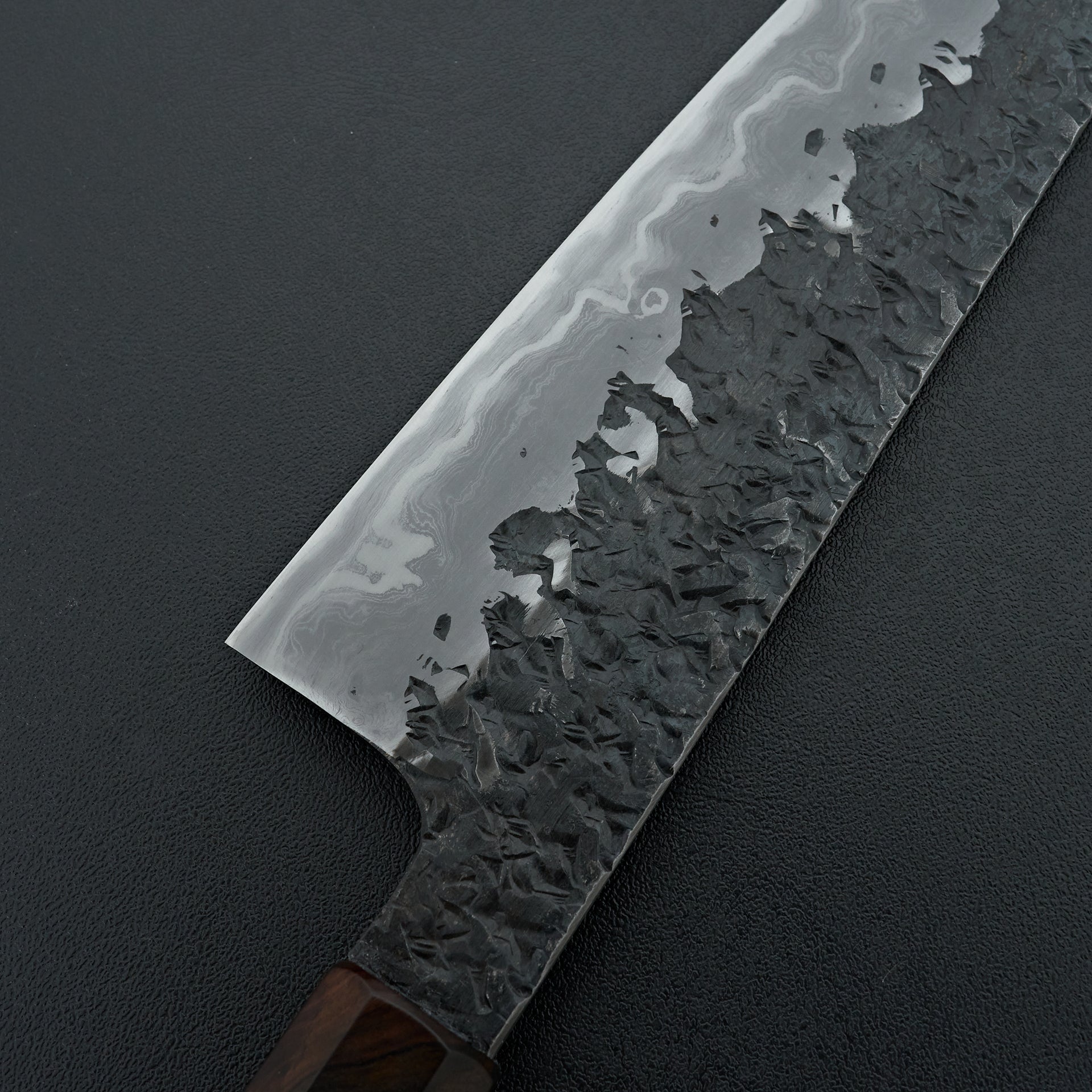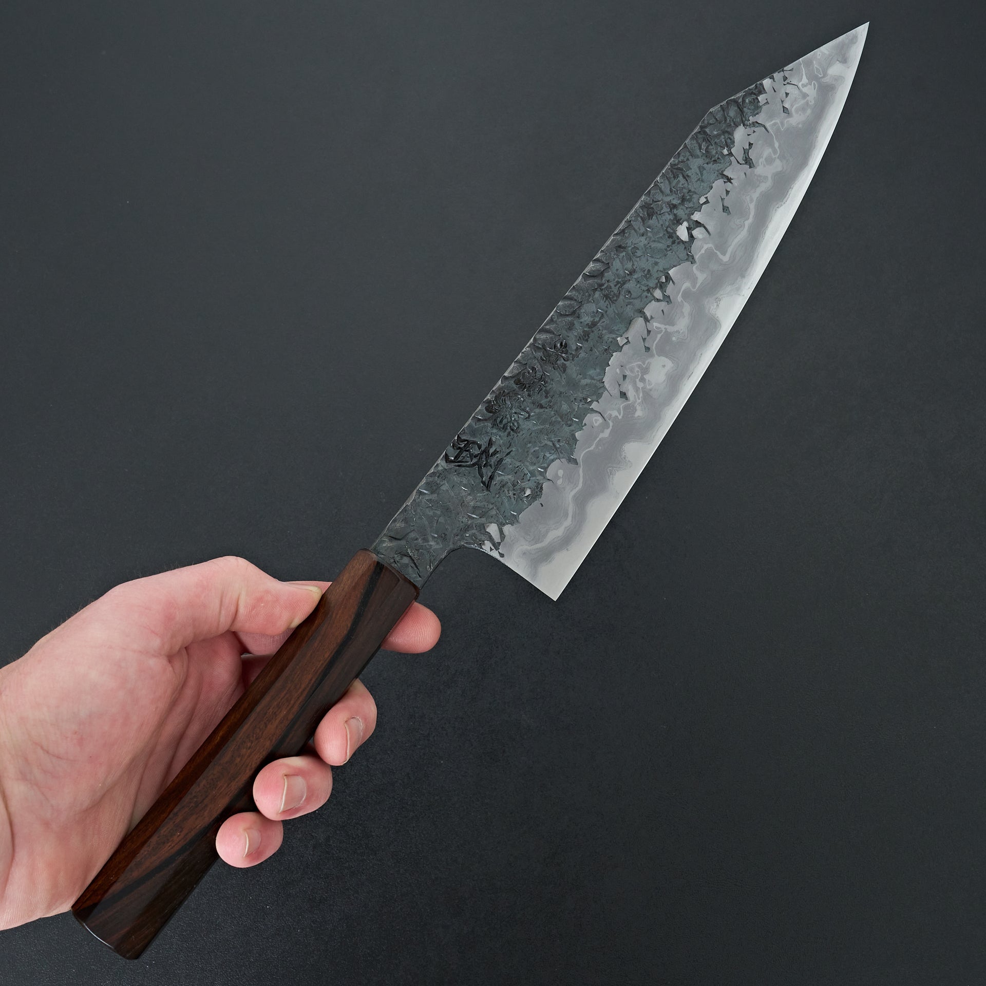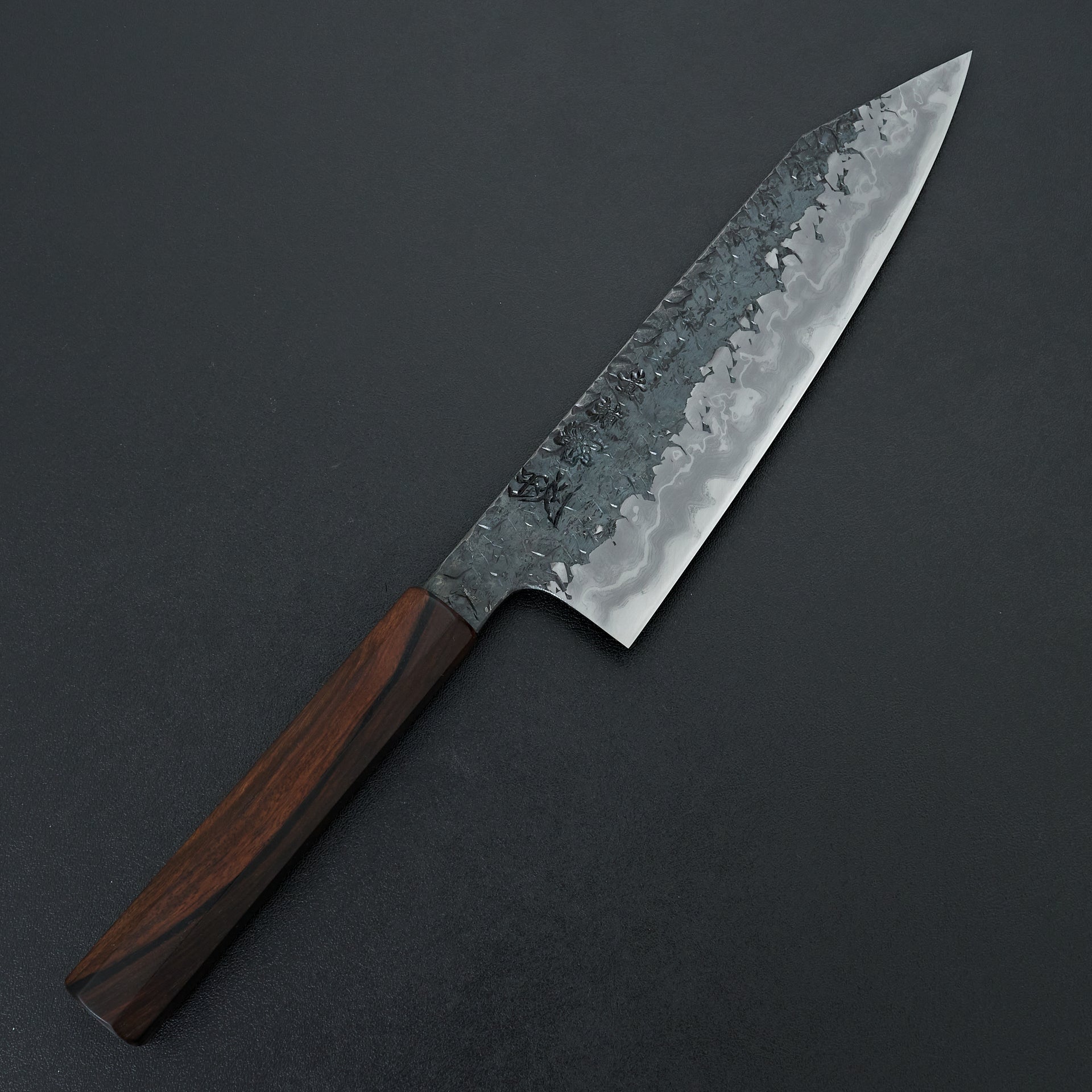 The ENN series is one of his highest offerings. The blade is hand forged using Aogami #1 core, hand laminated with a housemade high layer damascus made from Aogami #2 and soft iron. The bevels are hon-kasumi finished on a progression of Japanese whetstones which refines the geometry and makes for easy maintenance moving forward. The blade is kurouchi finished with a striking hammered pattern and Kisuke engraving and stamps. Comes fitted with an octagonal ebony handle.