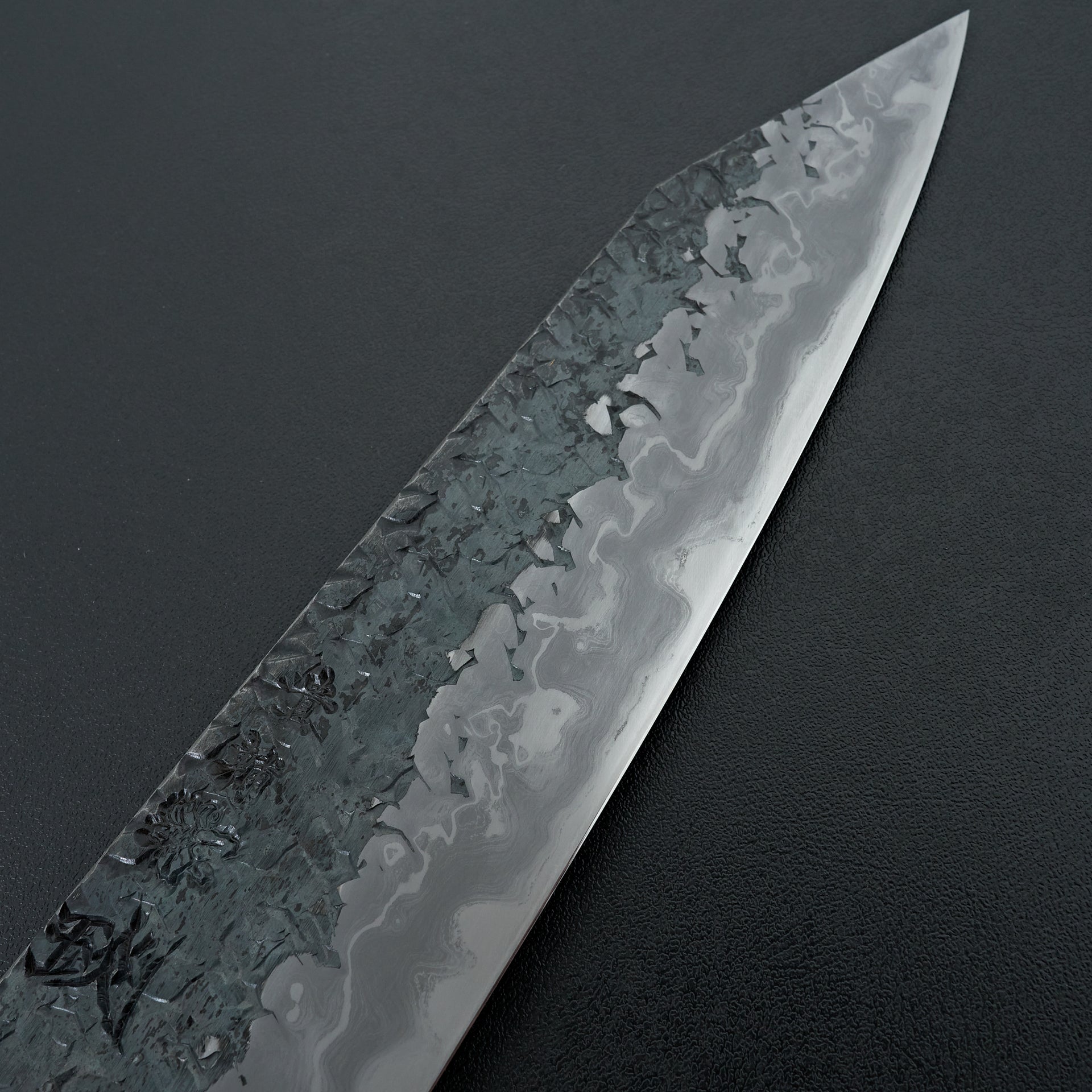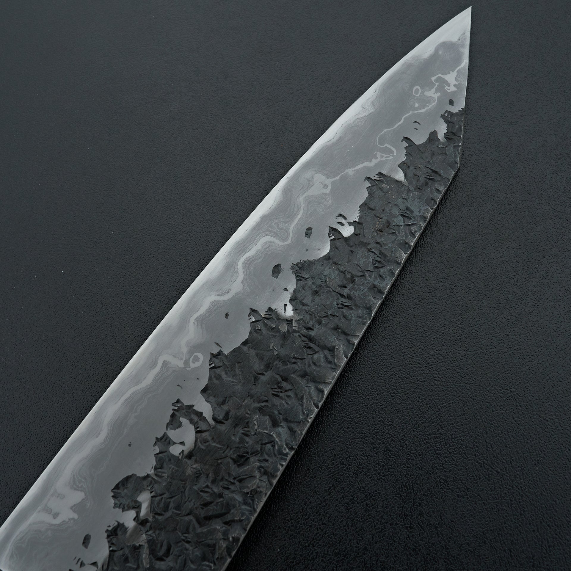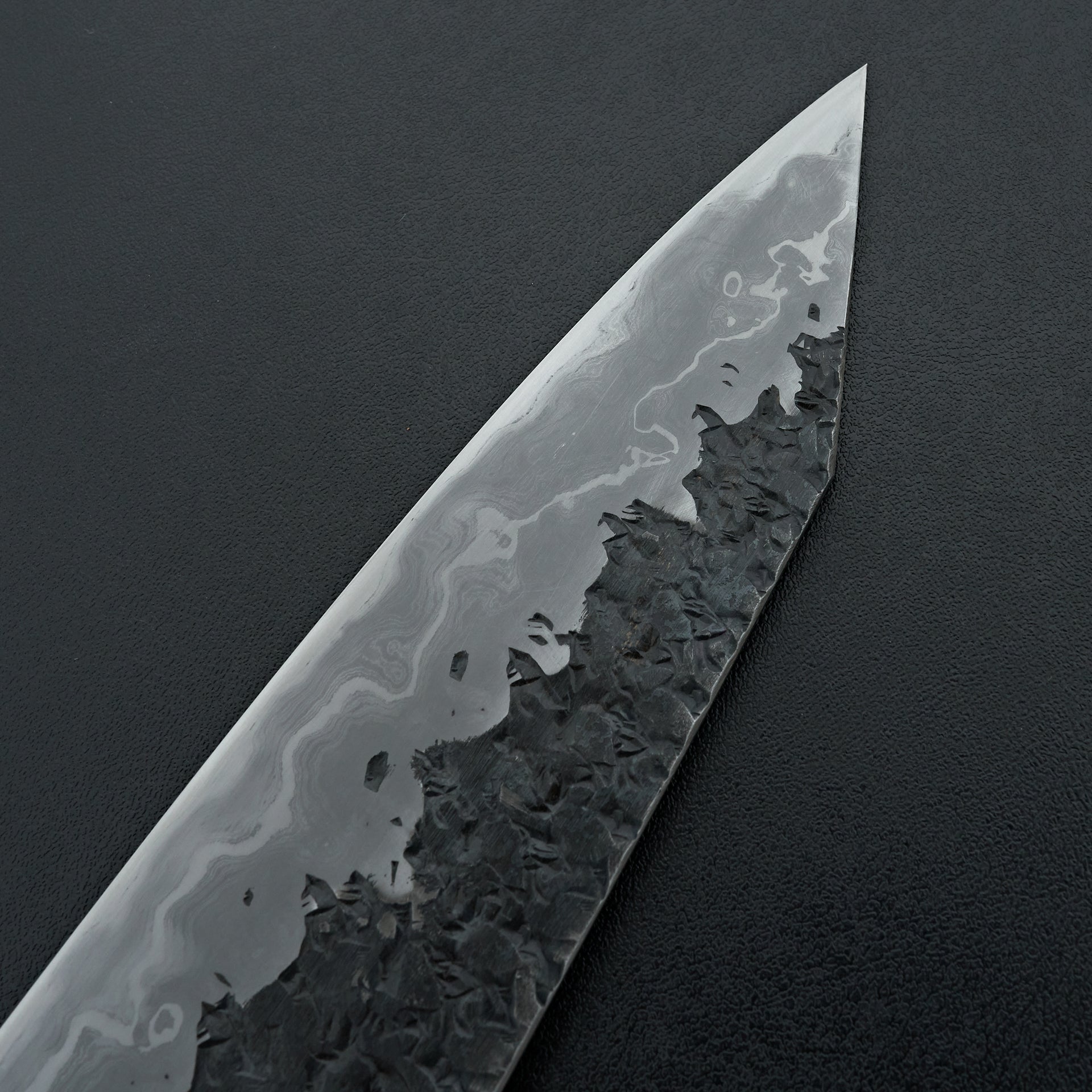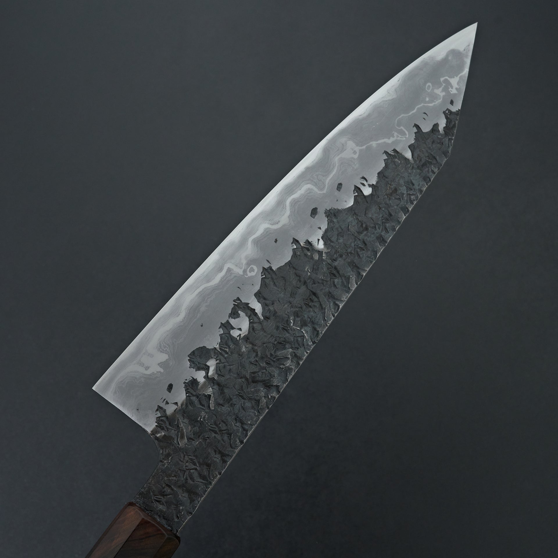 The ENN series is one of his highest offerings. The blade is hand forged using Aogami #1 core, hand laminated with a housemade high layer damascus made from Aogami #2 and soft iron. The bevels are hon-kasumi finished on a progression of Japanese whetstones which refines the geometry and makes for easy maintenance moving forward. The blade is kurouchi finished with a striking hammered pattern and Kisuke engraving and stamps. Comes fitted with an octagonal ebony handle.