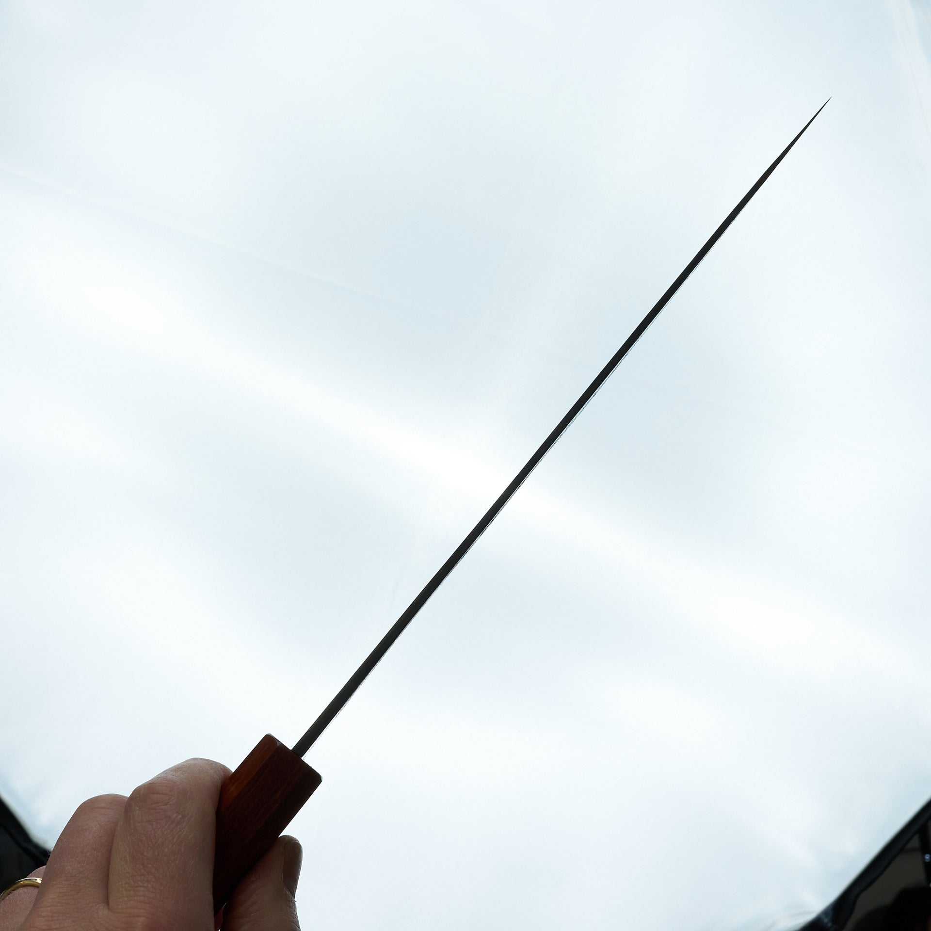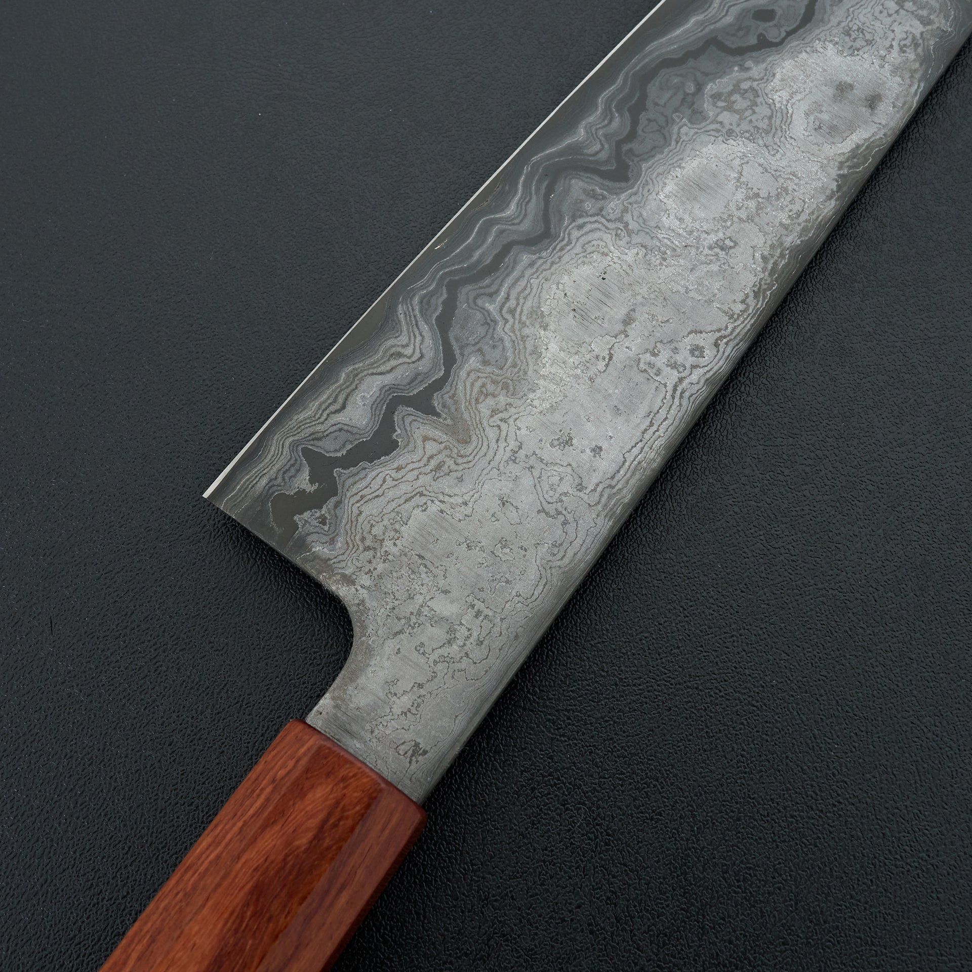 The KOKUENN series is one of his highest offerings. The blade is hand forged using Aogami #1 core, hand laminated with a housemade high layer damascus made from Aogami #2 and soft iron. The blade is fully ground and etched deeply to reveal the damascus patterning, finished with Kisuke engraving and stamps. Comes fitted with an octagonal figured rosewood handle that plays well with the waves in the damascus steel.