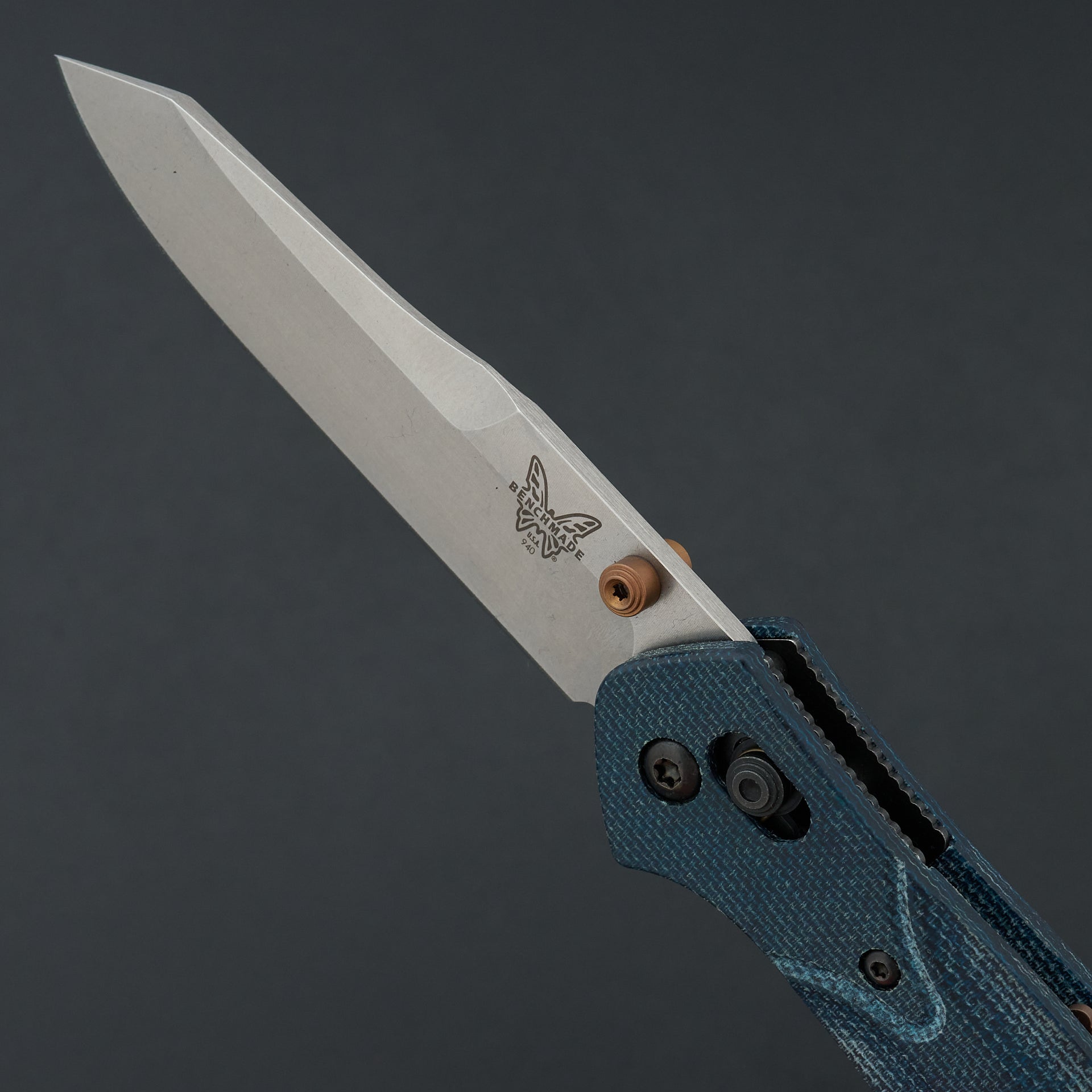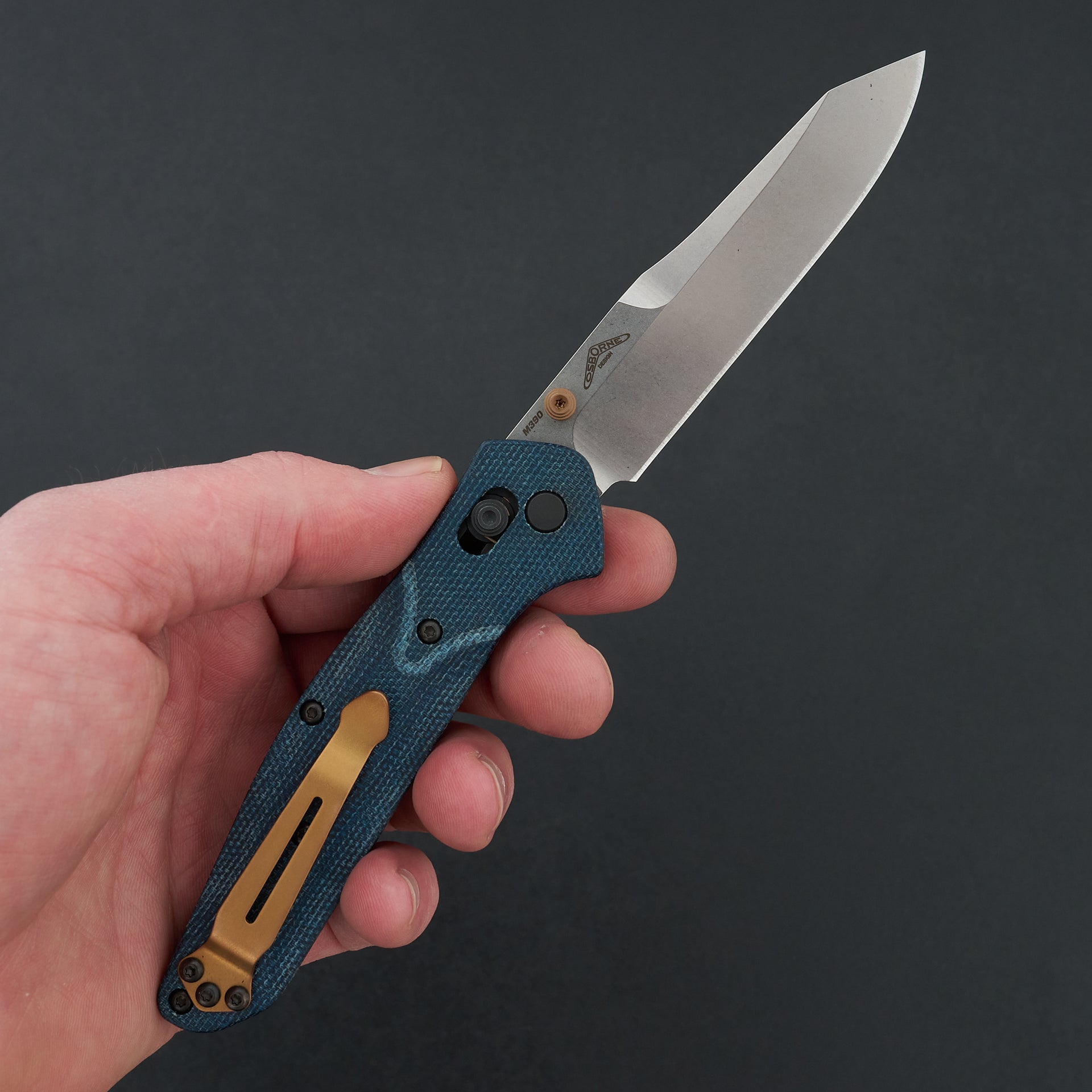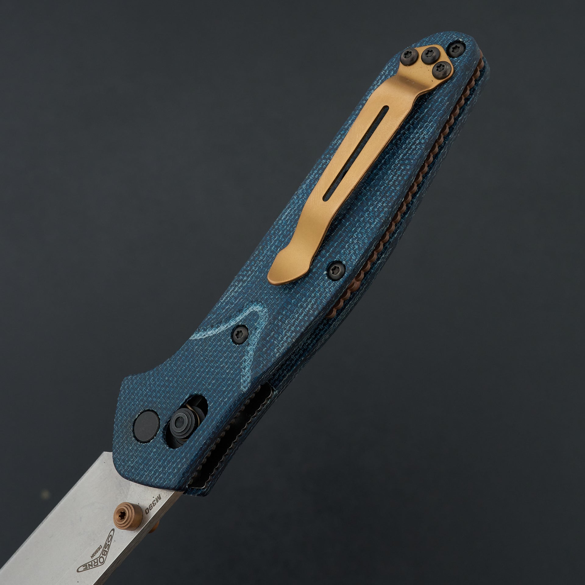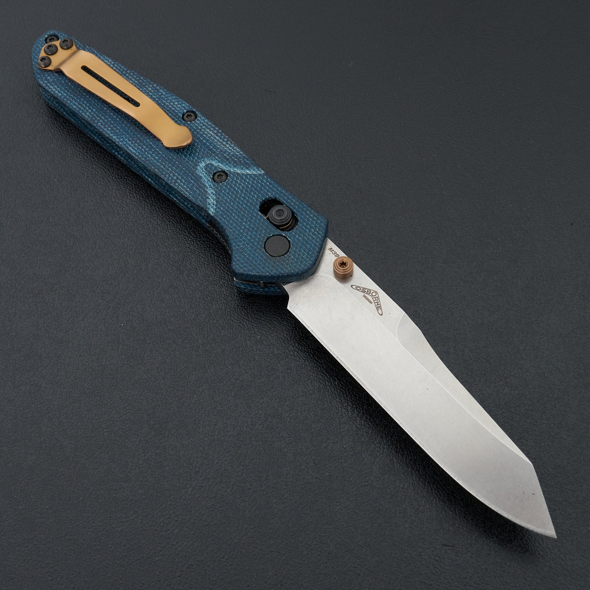 "As hardworking and ruggedly handsome as a pair of blue jeans, the new 940-04 Osborne is our nod to the blue-collar folks that don’t mind getting their those who like to get their hands dirty and boots dusty, just like us. Evolved from the iconic folder that first began as a versatile ranch knife — and seamlessly doubles as the ultimate EDC — the new 940-04 Osborne features an M390 reverse tanto blade with a satin finish. Topped off with blue denim micarta handle scales and dark copper PVD accents, the 940-04 is a hard-use, working-class hero."