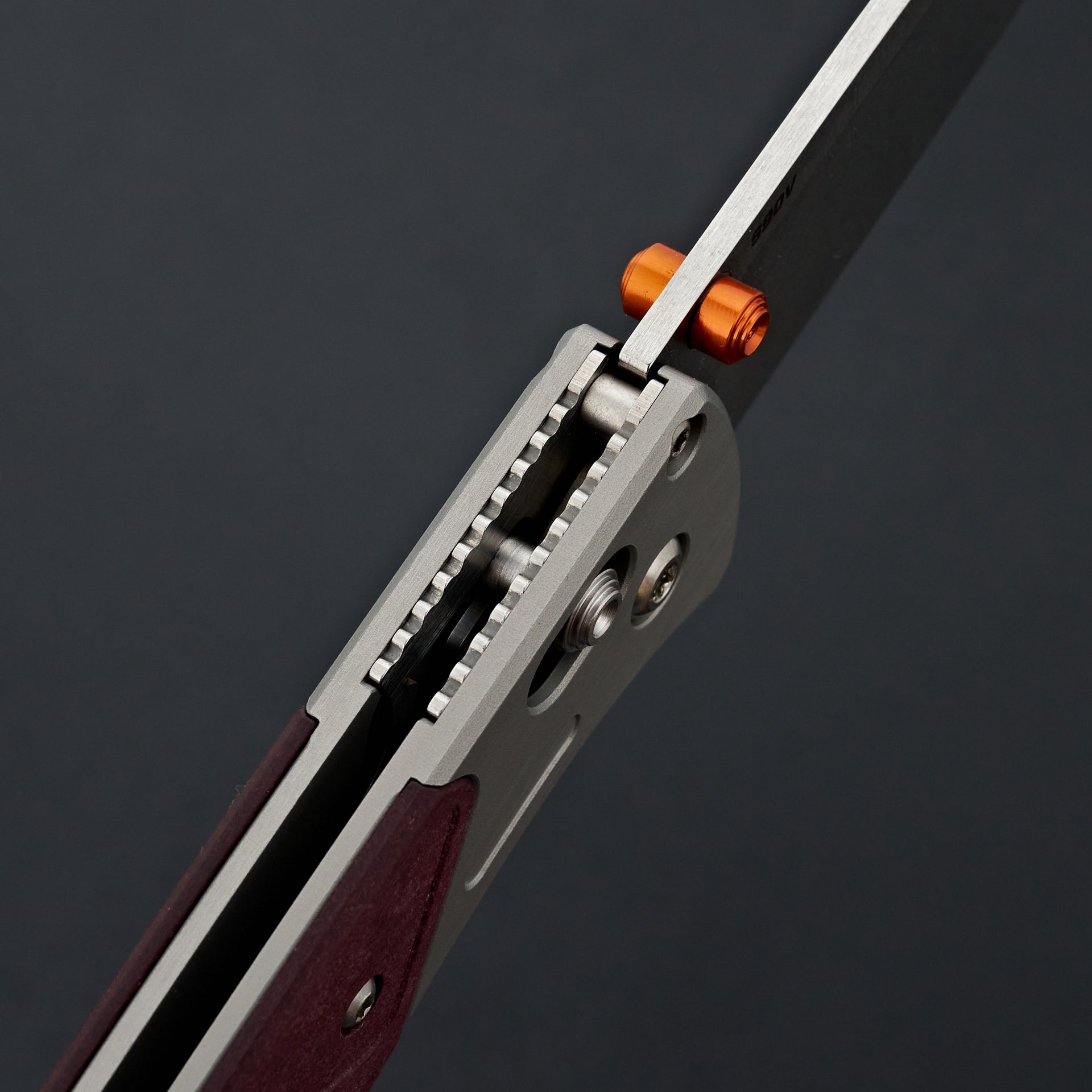 "We decided to mix it up a little bit with this premium Bugout® and, like, literally mix some materials. Inspired by the earthy tones found in our outdoor gear, backpacking kits, and accessories around the campsite, the new 535-09 Bugout® sets itself apart from others we’ve built thanks to handle scales that contrast a gray anodized 6061-T6 aluminum bolster with a Redstone Richlite onlay, plus a few other added pops of color found in the orange anodized thumb stud and backspacer. Featuring a premium CPM-S90V stainless steel stonewash polished blade, this unique 535-09 Bugout® has the same stunningly lightweight and compact feel as its predecessors and remains the ideal EDC on any outdoor adventure from the mountain trail to tasks around town. Over time, Richlite®, a paper composite material, will develop a natural patina over time, altering the original color of the material. "Patina” is a natural occurrence in the product that can either darken or lighten depending on exposure to light."