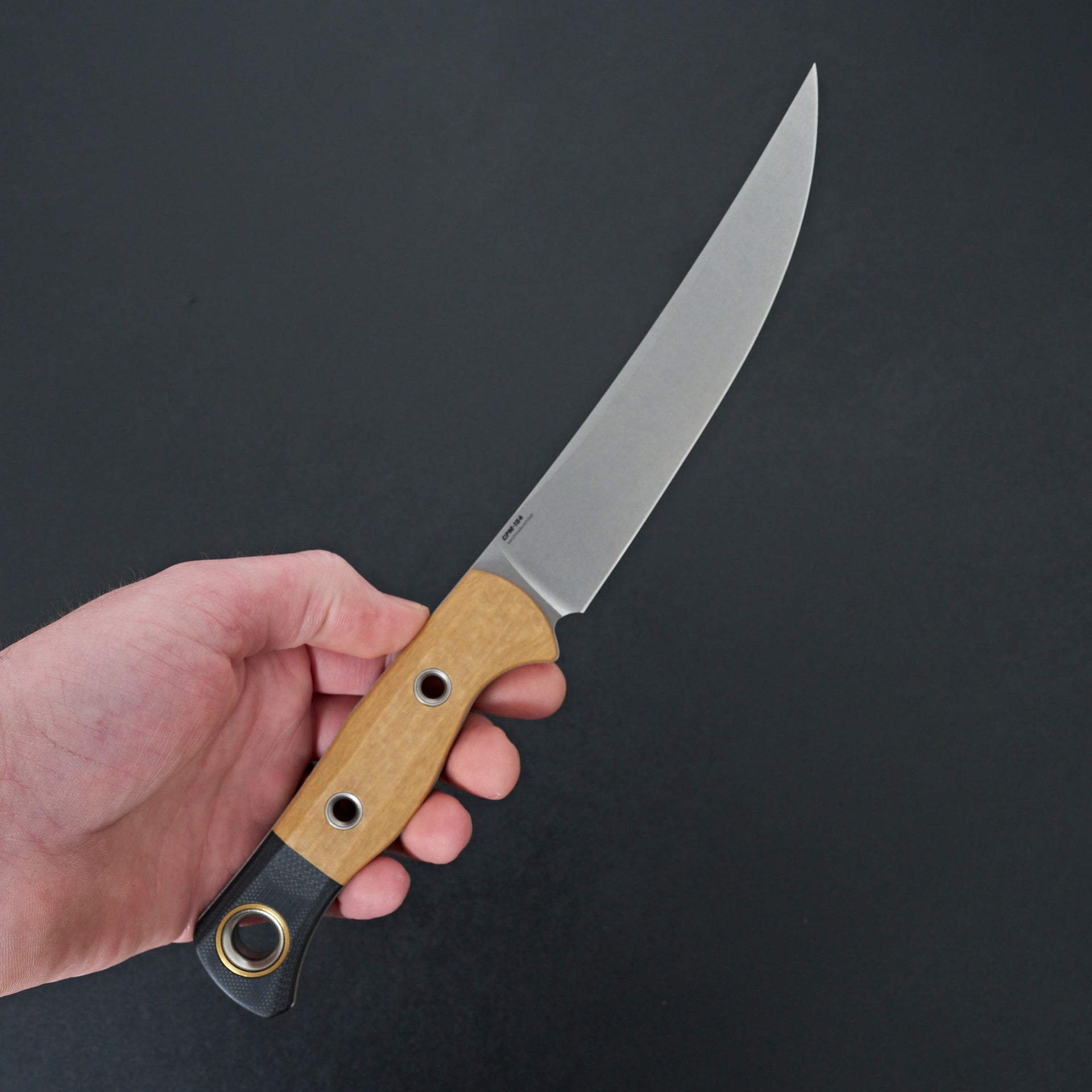 "For clean, effortless cuts, the 4050-02 Meatcrafter® is your go-to knife for precision processing in the field and portioning, deboning, and trimming your favorite cuts in the kitchen. Thanks to our proprietary SelectEdge® technology, the upswept 6” trailing point blade delivers exceptional push-cut performance, while its engineered blade flex allows for greater control while deboning or filleting. The 4050-02 Meatcrafter® variant features a CPM-154 blade with a stonewash finish, a maple valley Richlite handle, and a black G10 bolster accented with a gold ring. Over time, Richlite®, a paper composite material, will develop a natural patina over time, altering the original color of the material. "Patina” is a natural occurrence in the product that can either darken or lighten depending on exposure to light."