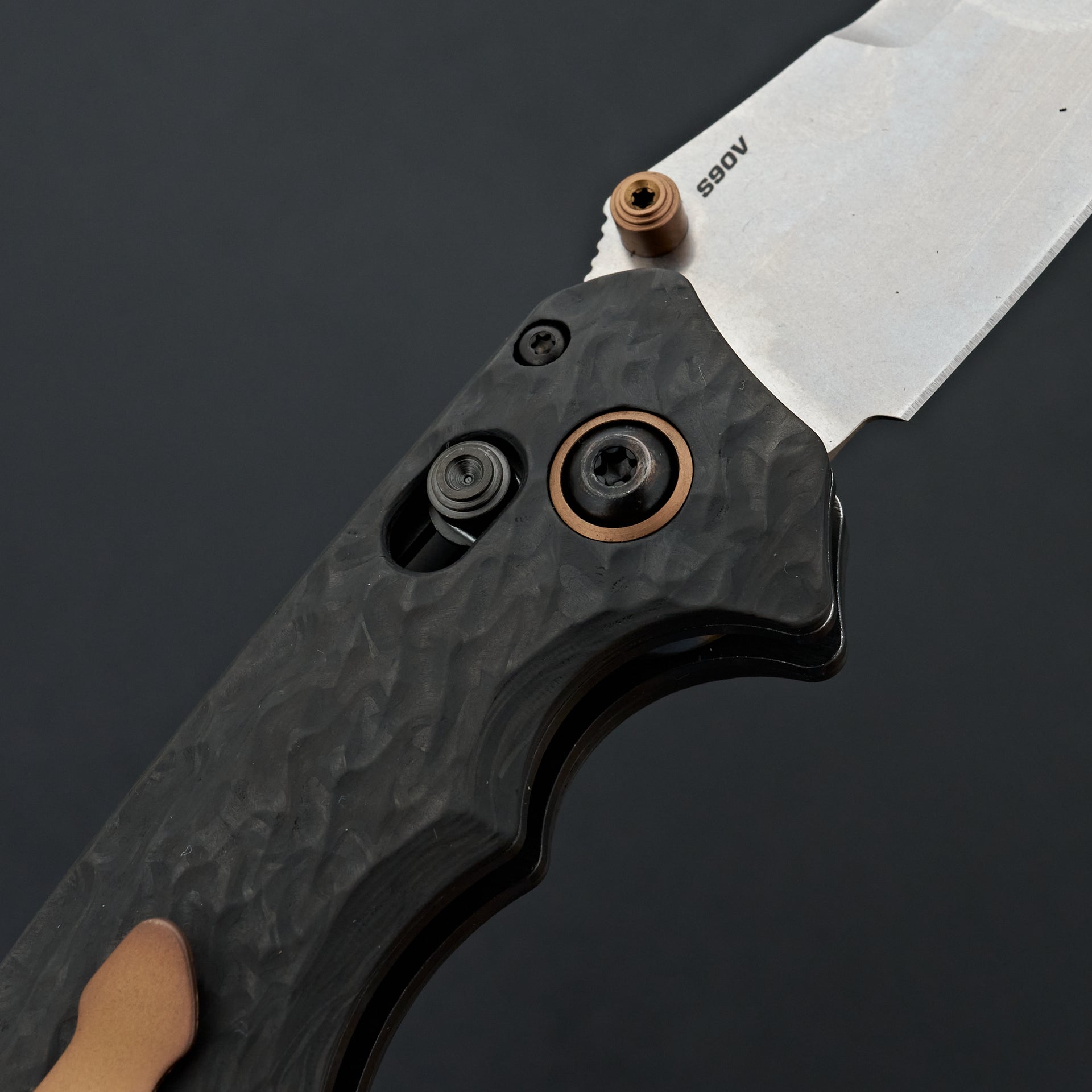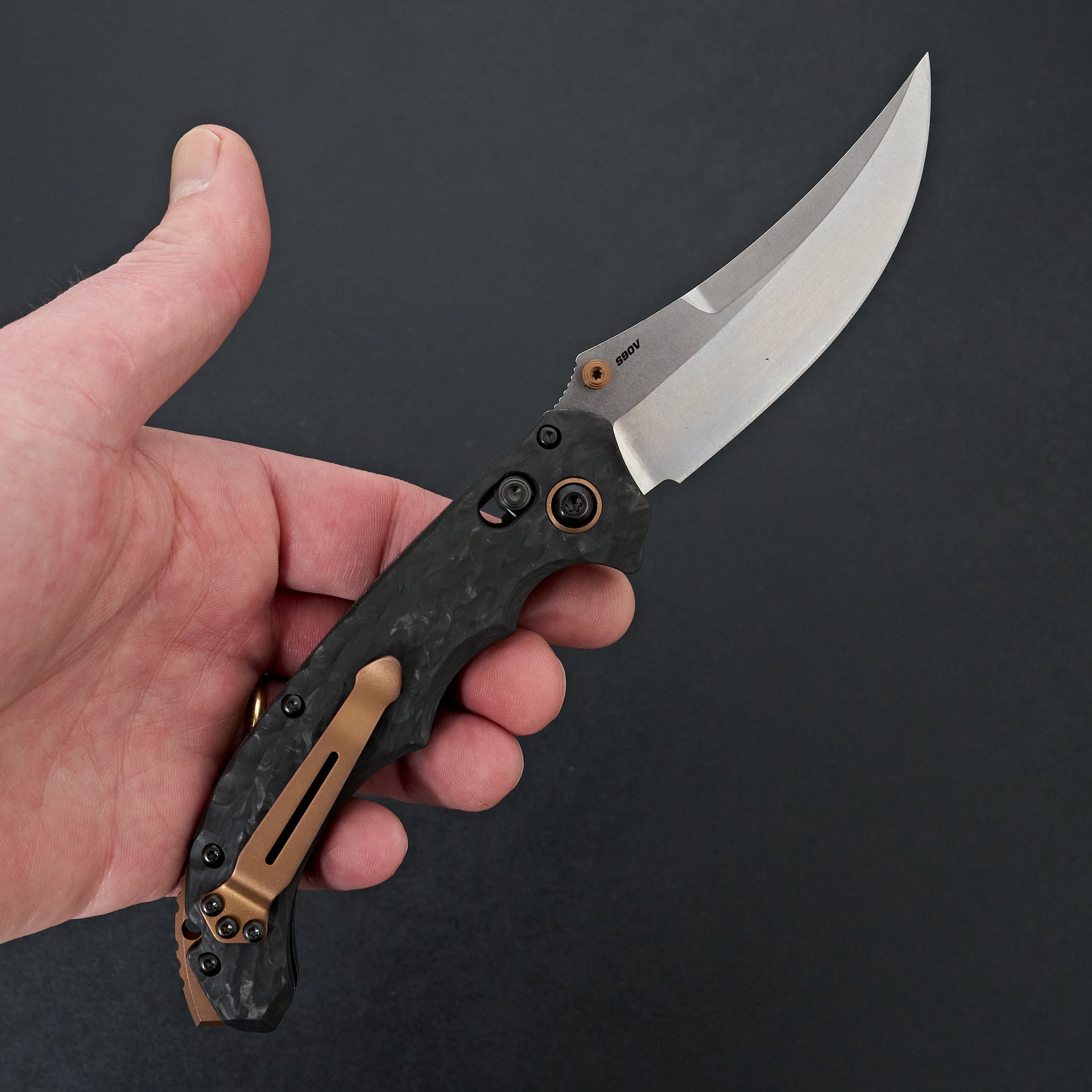 "Tactical ferocity meets stylized refinement with a new EDC-friendly size in the wicked 865-02 Mini Bedlam®. Decked out in premium materials and finishes, the CPM-S90V super stainless steel blade with a satin finish gets to the point with an upswept scimitar shape ideal for hooking and slicing. The handle is crafted with marbled carbon fiber and features aggressive textures that flow with the curvature of the handle for a superior grip through quick movements and bigger cutting tasks. The 865-02 Mini Bedlam® is finished with black oxide and dark copper PVD hardware and a chamfered copper PVD backspacer to complete its unpredictable reptilian vibe."