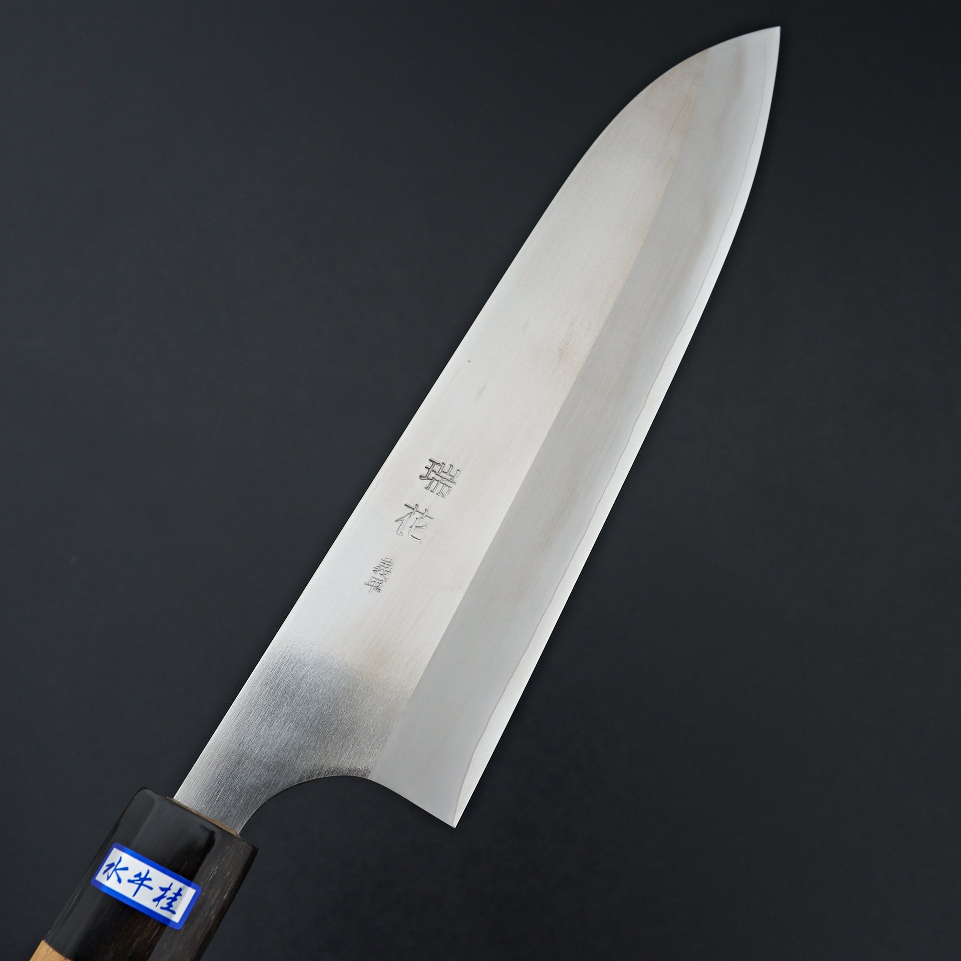 This series is forged from ZDP-189 steel cladded in stainless. These a quite a bit thinner than Gihei's other offerings, with slight distal taper on the spine and very thin cutting edge. Handle is zelkova octagonal with horn ferrule.