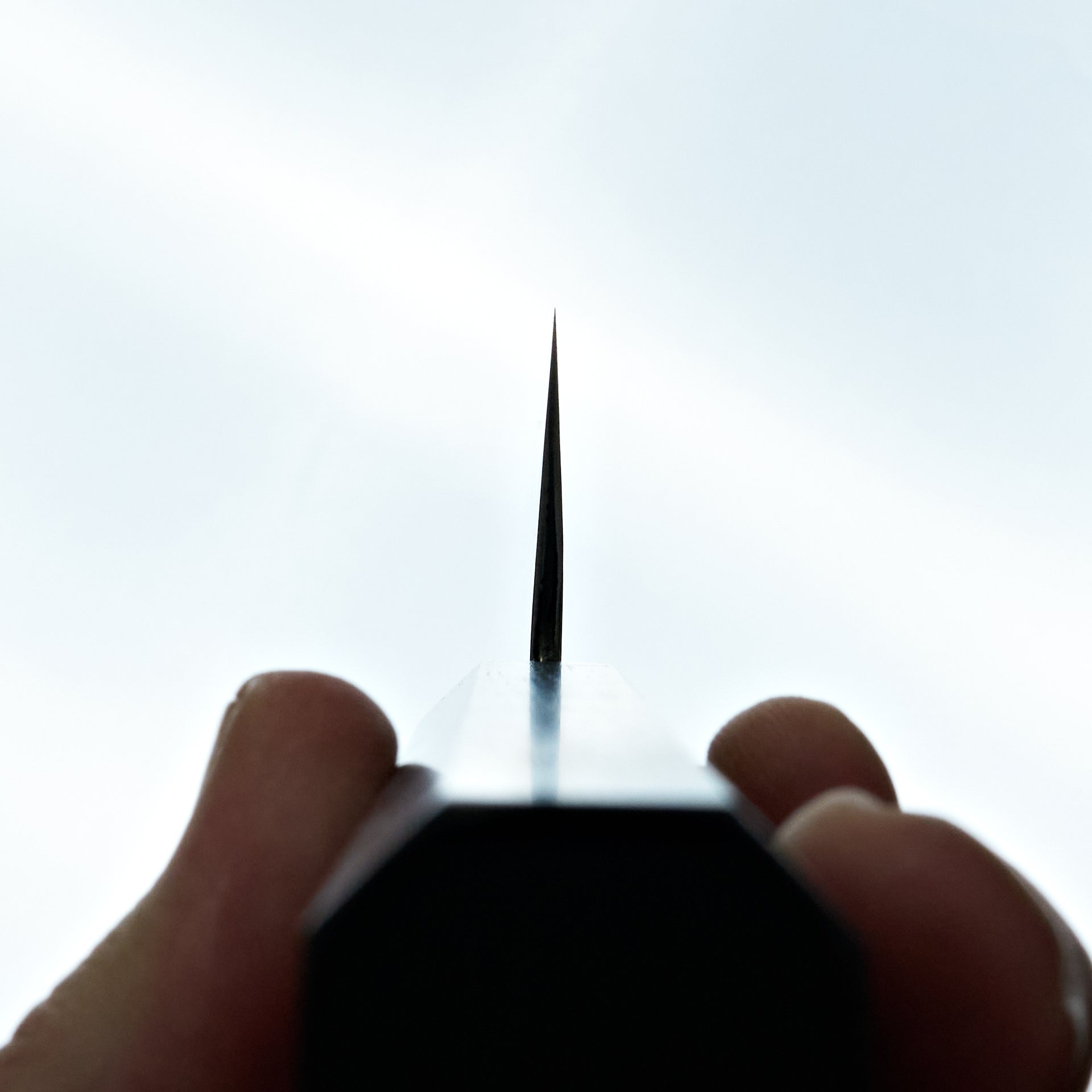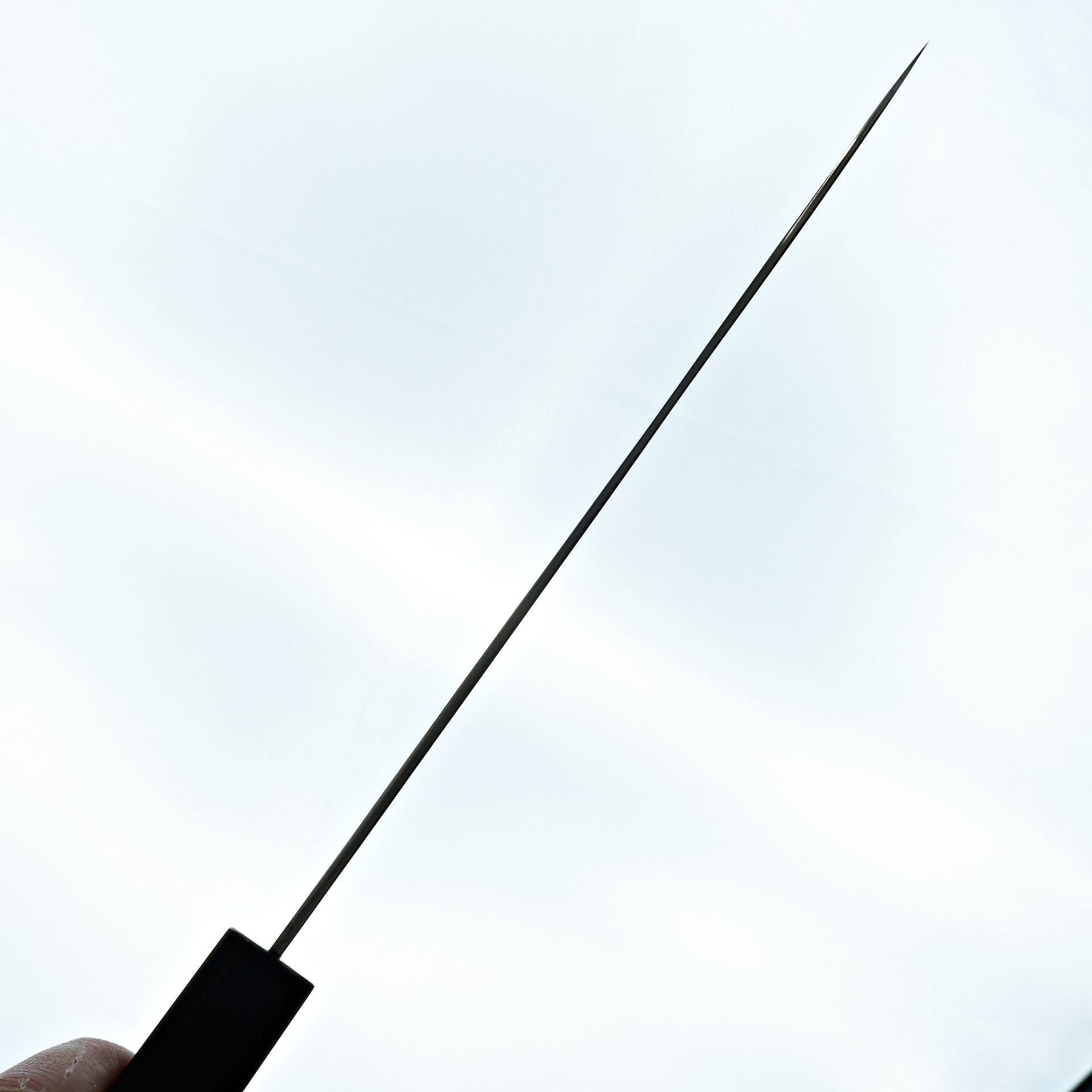 The Hatsukokuro Hikari Series is made from SLD semi stainless steel laminated in soft stainless. These are hardened to ~63hrc and have great edge retention. SLD, though considered semi stainless, is virtually stainless in our eyes and is very easy to care for. The blade face has a unique finish, mirror-like with a haziness to it. These are ground very thin and performance focused. Fitted with an octagonal mono ebony wood handle.
