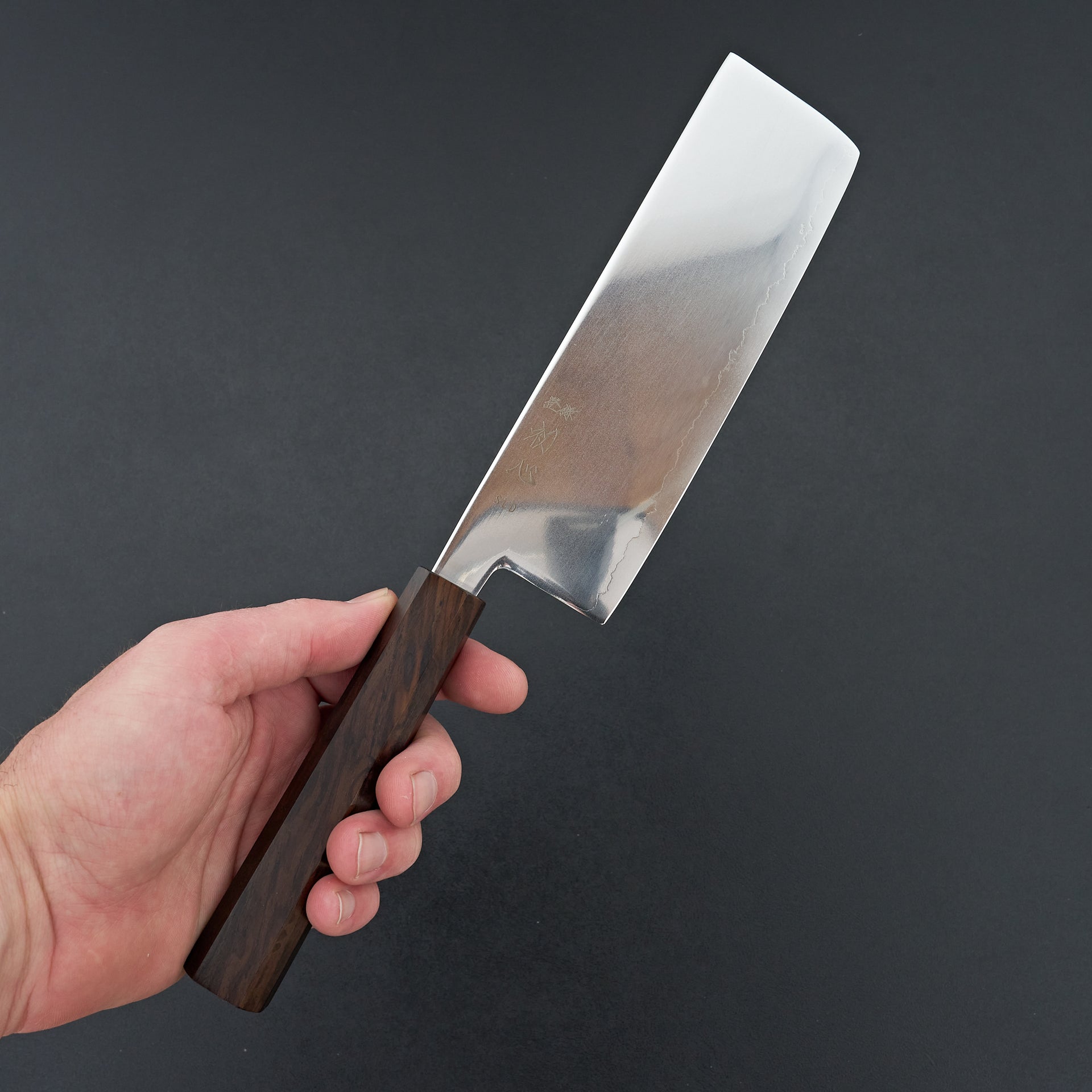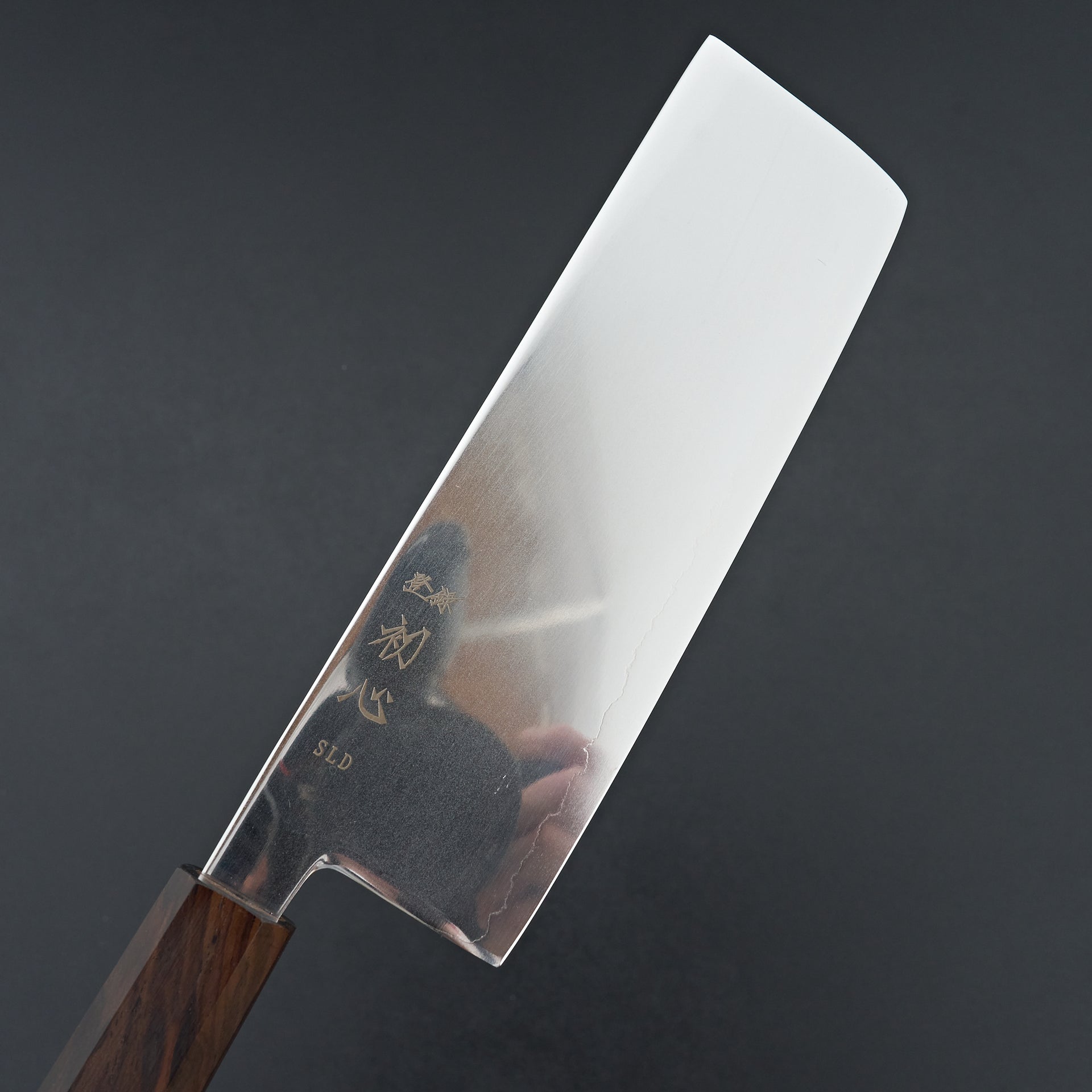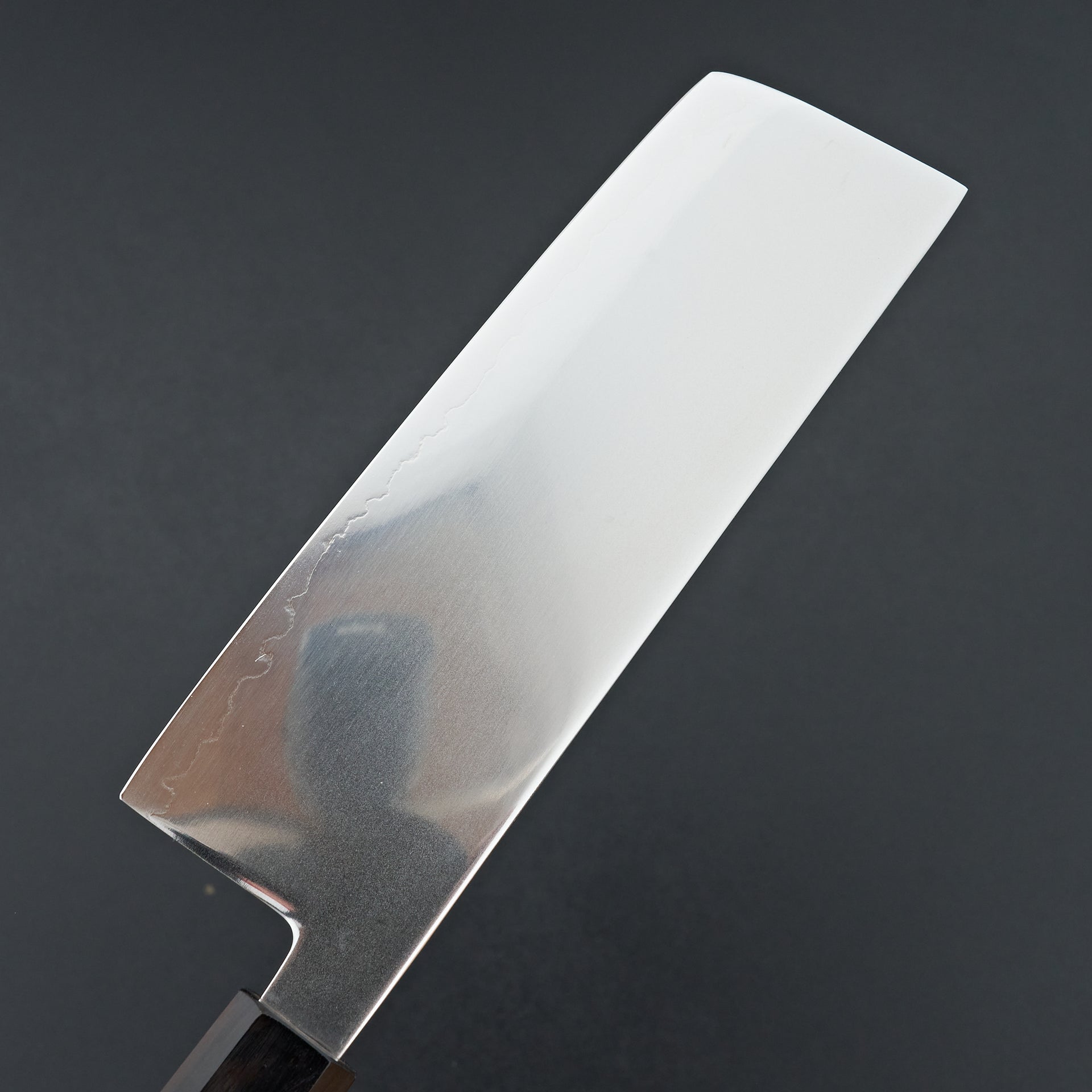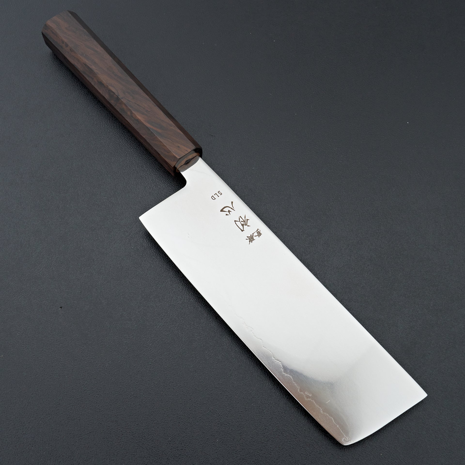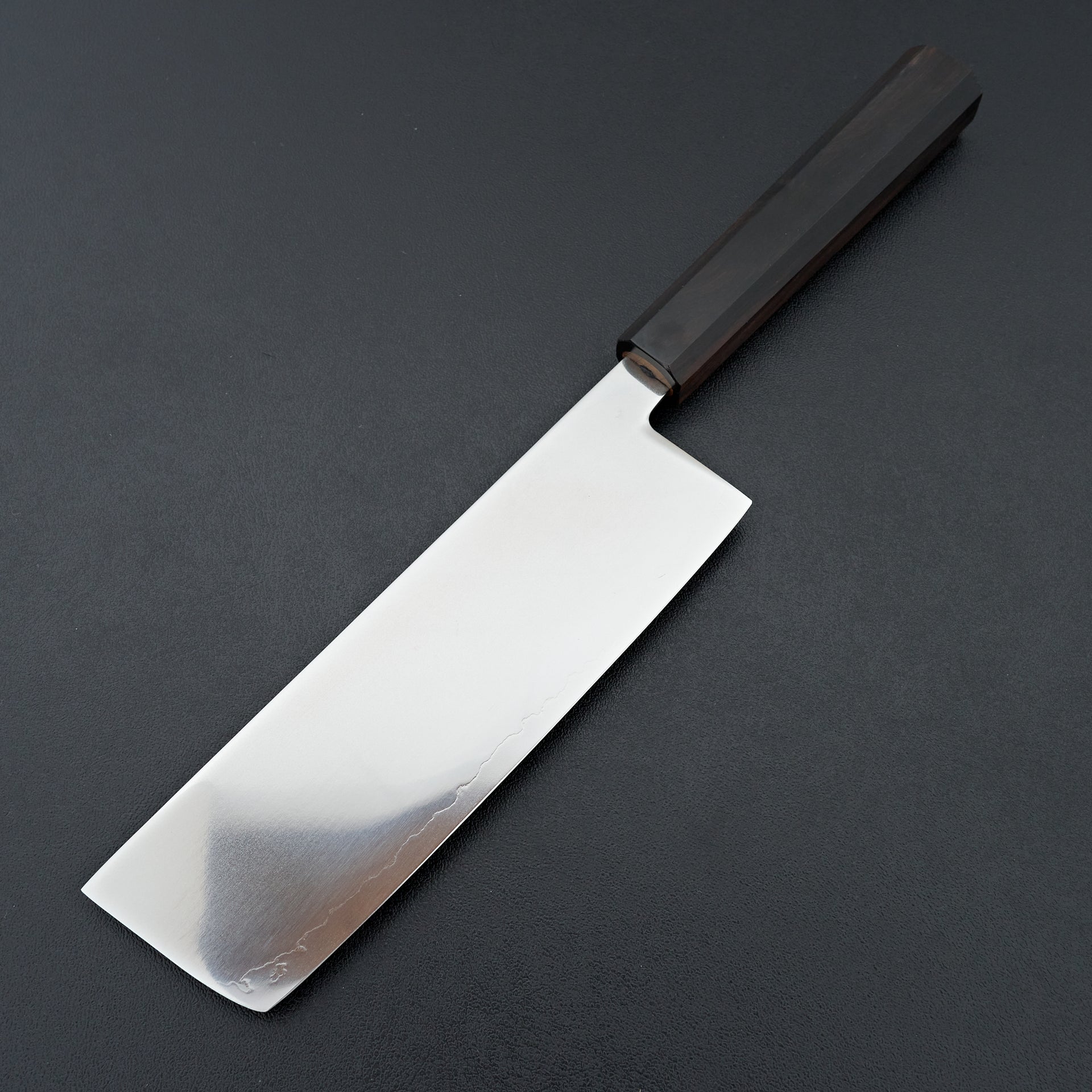 The Hatsukokuro Hikari Series is made from SLD semi stainless steel laminated in soft stainless. These are hardened to ~63hrc and have great edge retention. SLD, though considered semi stainless, is virtually stainless in our eyes and is very easy to care for. The blade face has a unique finish, mirror-like with a haziness to it. These are ground very thin and performance focused. Fitted with an octagonal mono ebony wood handle.