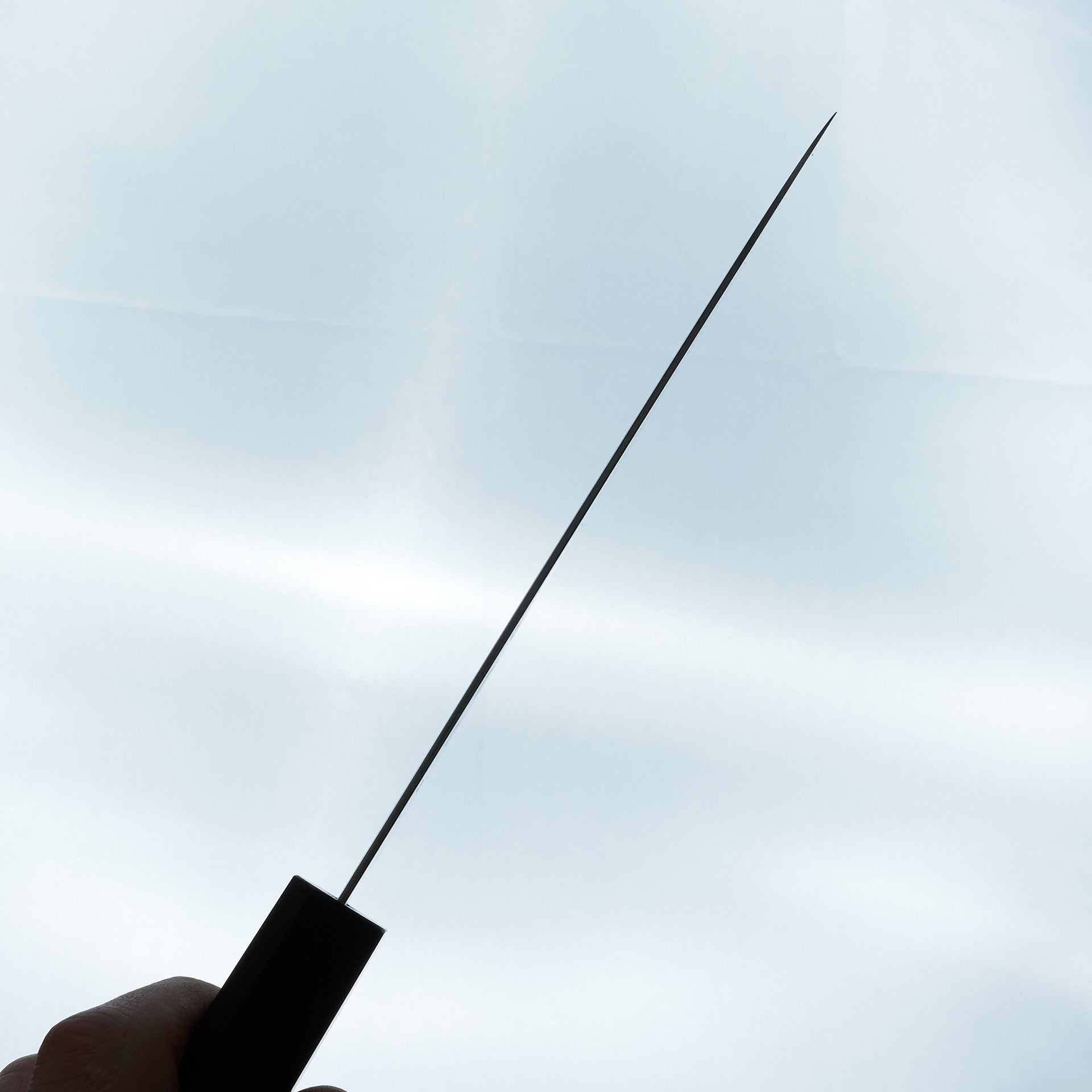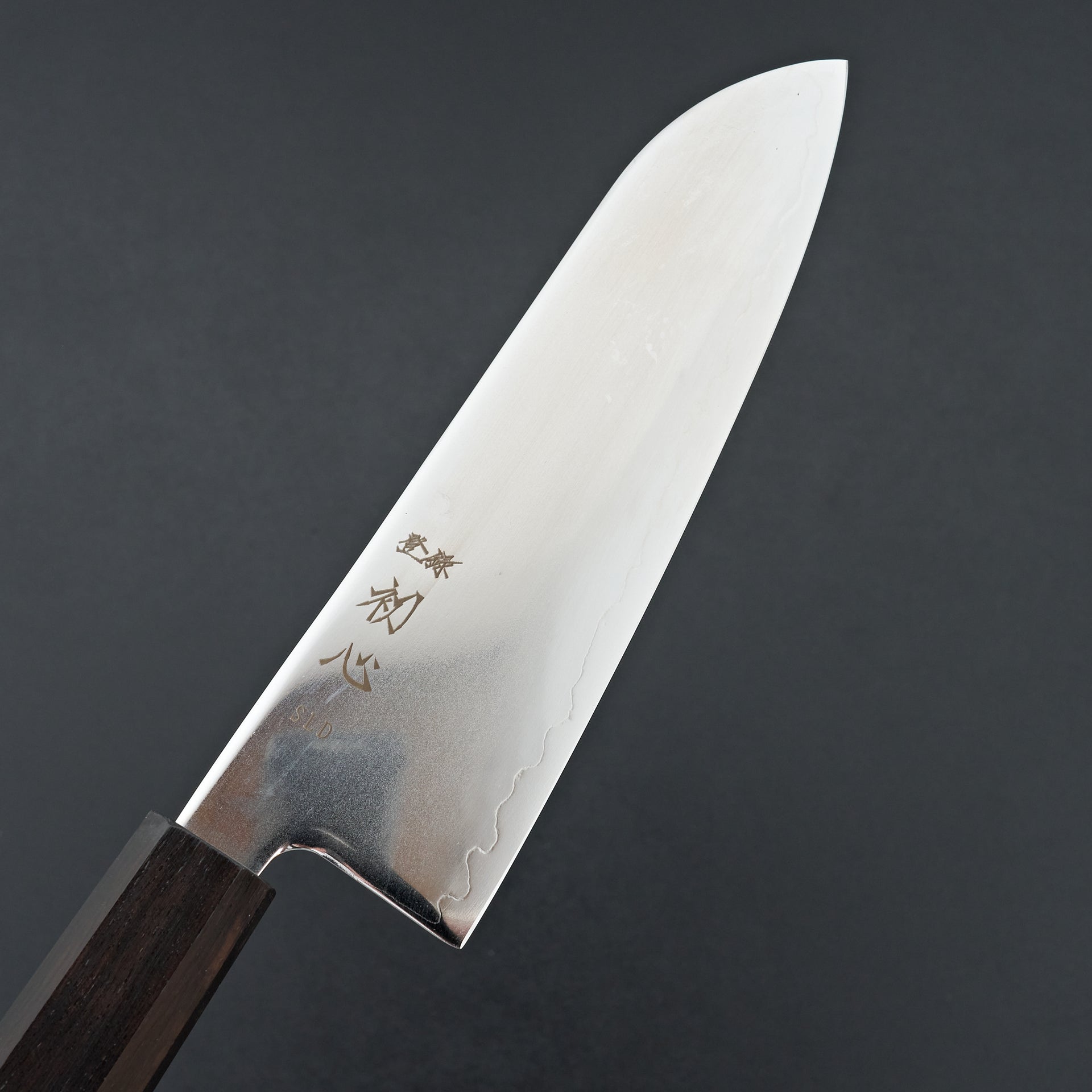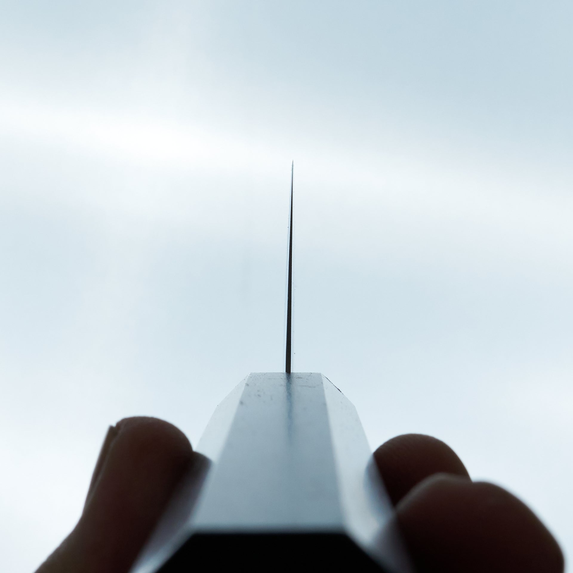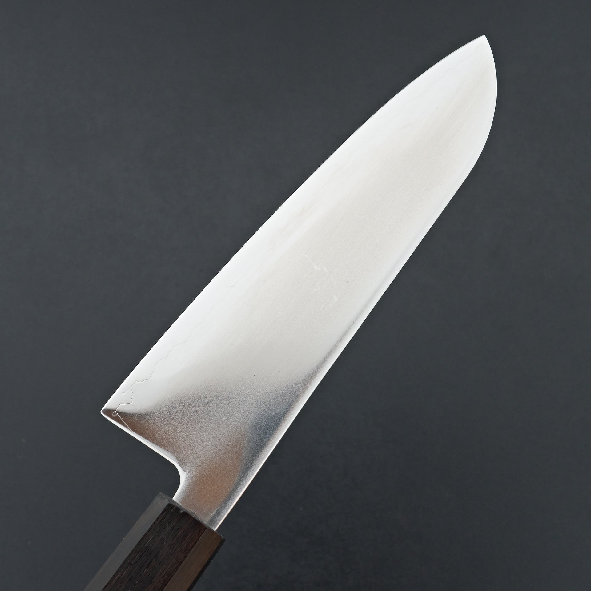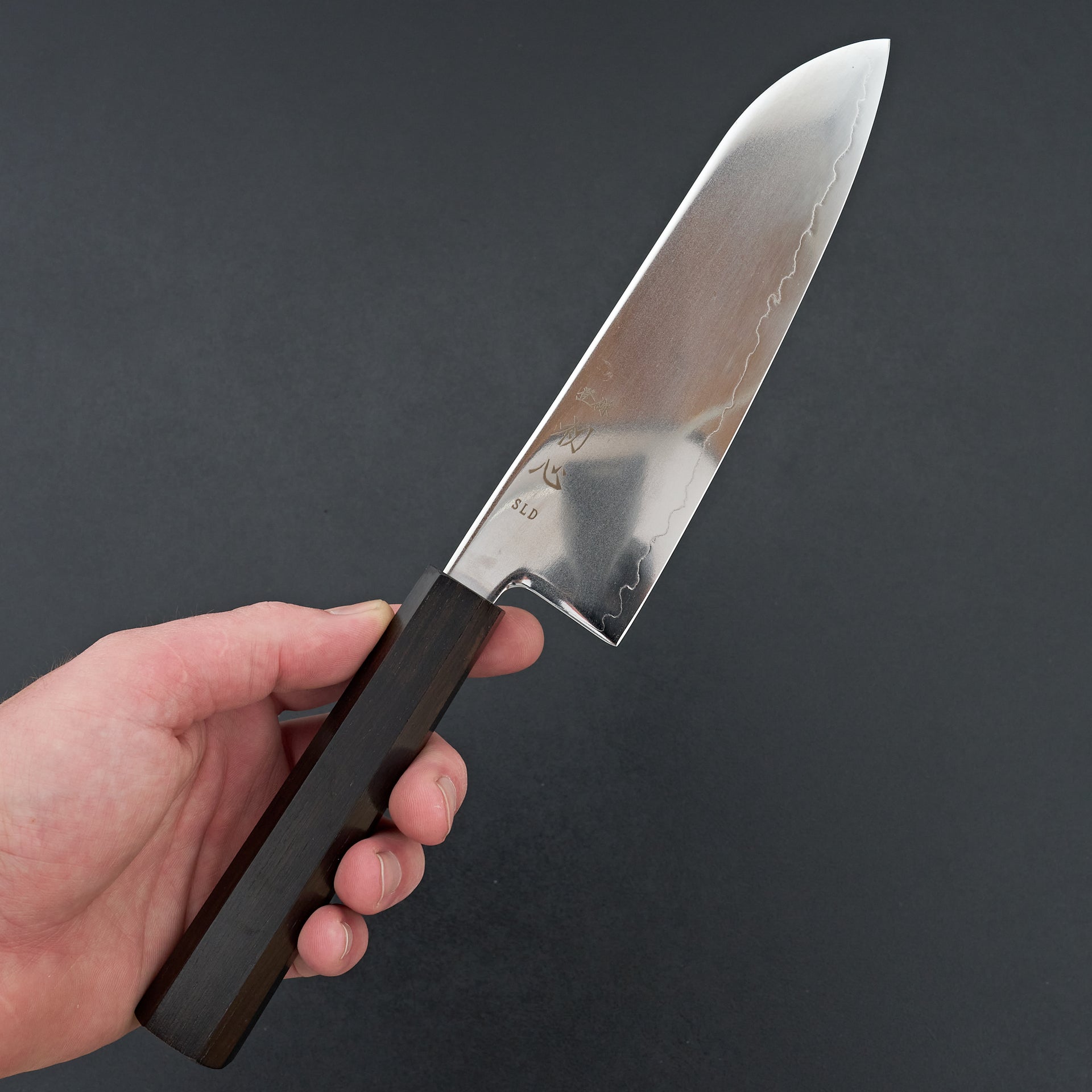 The Hatsukokuro Hikari Series is made from SLD semi stainless steel laminated in soft stainless. These are hardened to ~63hrc and have great edge retention. SLD, though considered semi stainless, is virtually stainless in our eyes and is very easy to care for. The blade face has a unique finish, mirror-like with a haziness to it. These are ground very thin and performance focused. Fitted with an octagonal mono ebony wood handle.