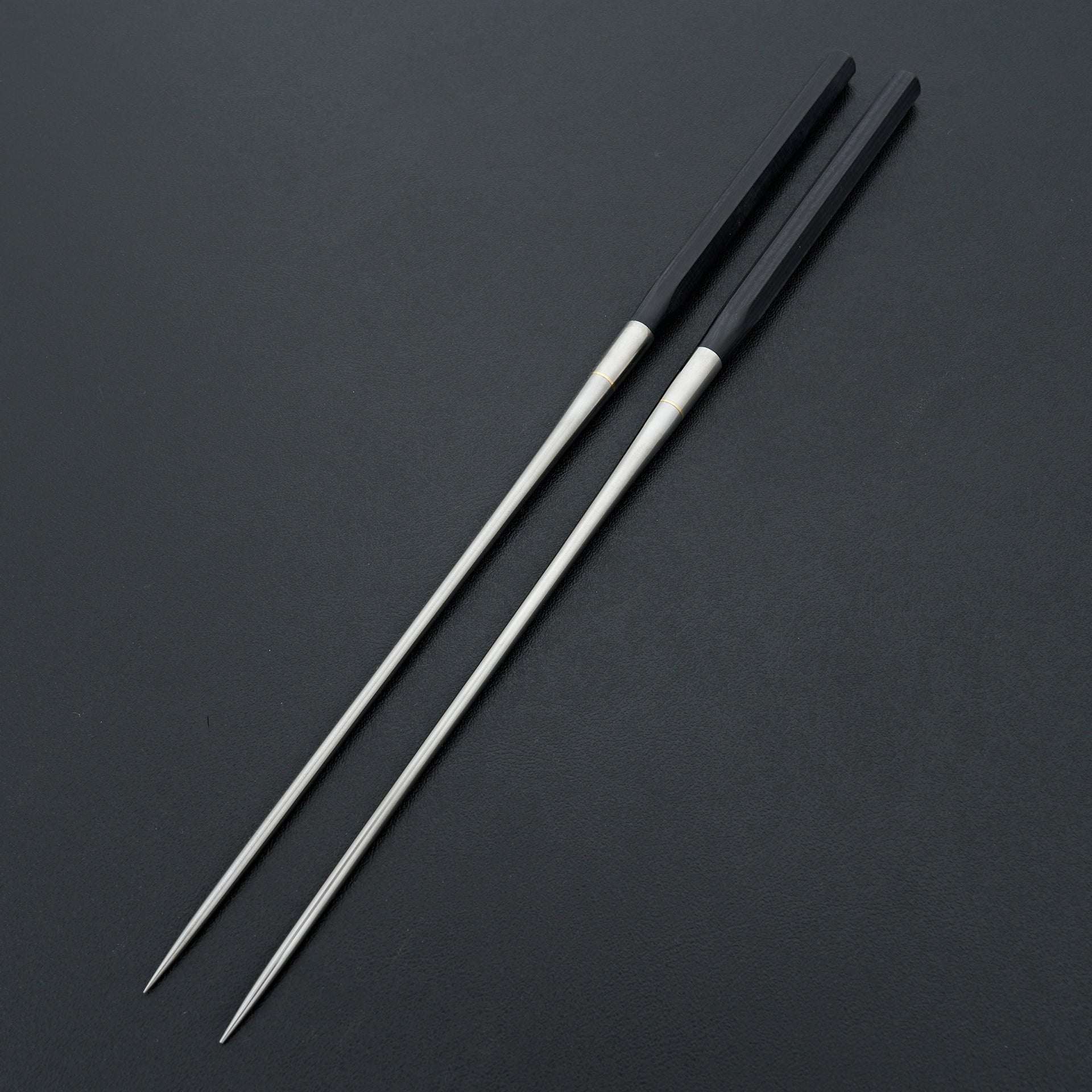 Traditional Japanese plating chopsticks made from Inox stainless steel fitted with octagonal black pakka wood handles.