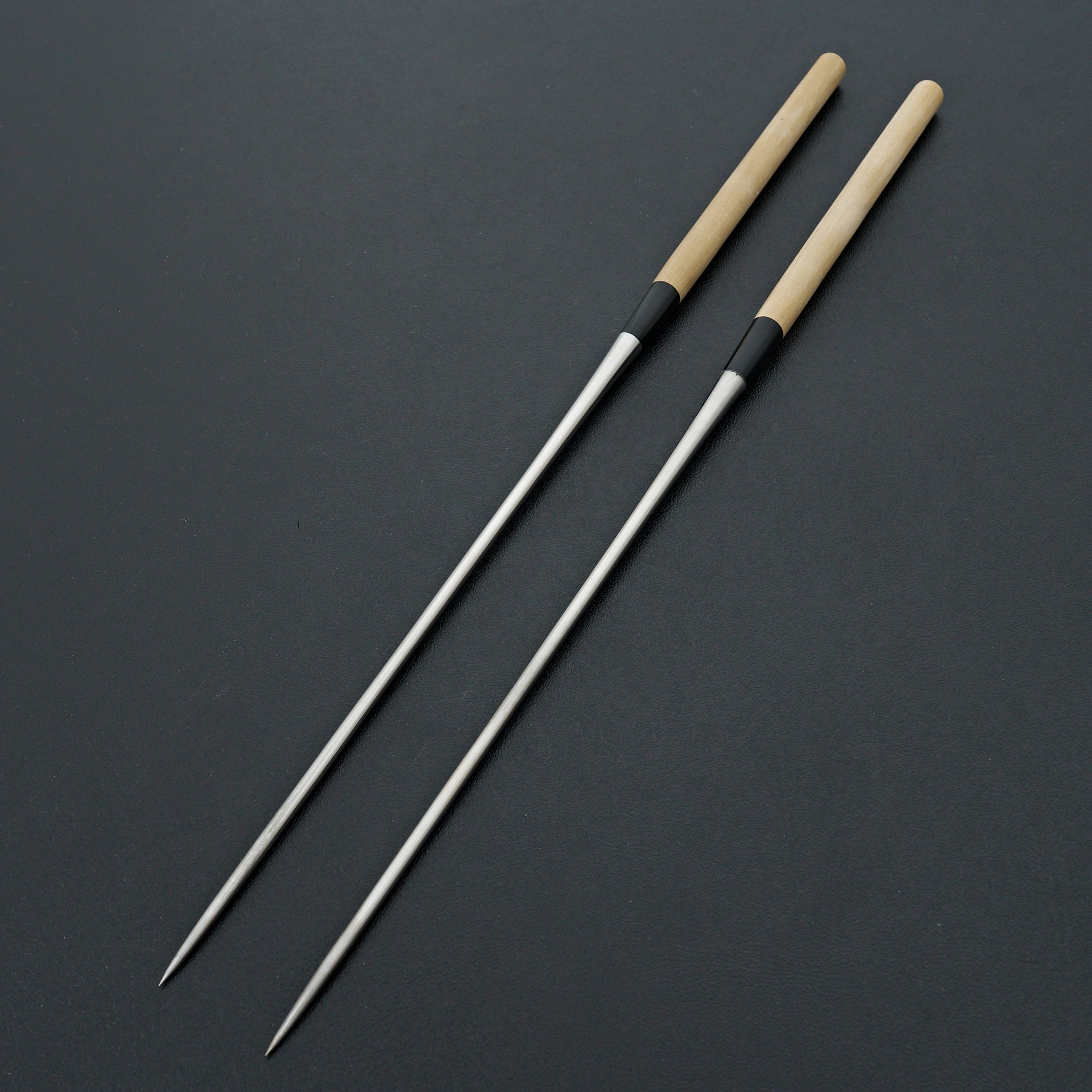 Traditional Japanese plating chopsticks made from Inox stainless steel fitted with oval Hoo (magnolia) wood and black buffalo ferrules.