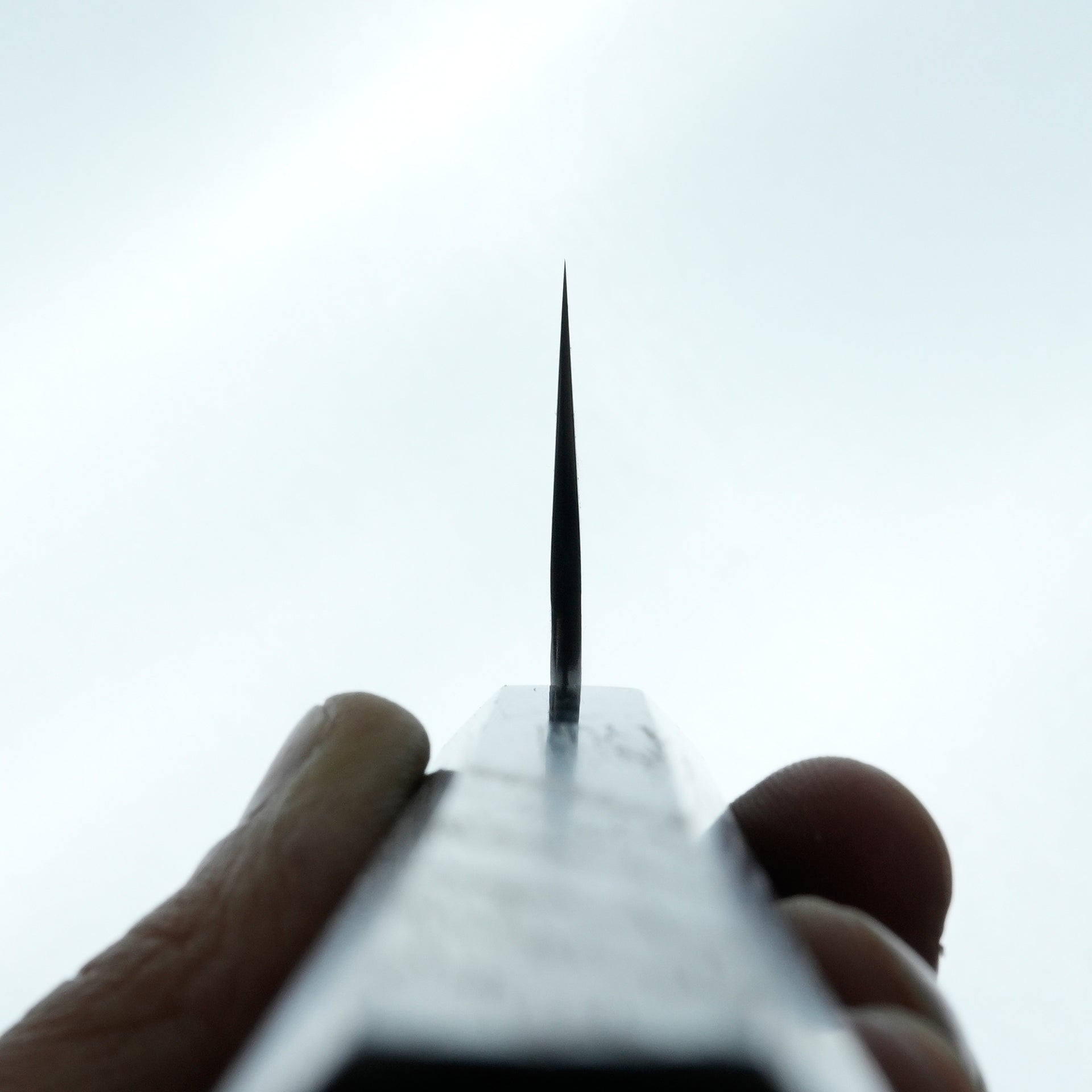 This series features SG2 powdered steel as the choice for the cutting edge. SG2 is a popular high carbon stainless steel with great wear resistance and very easy to care for. The stainless cladding is hammer finished with natural kurouchi. These are ground thin and more performance focused for excellent cutting feel. Fitted with octagonal wenge handle with buffalo horn ferrule.