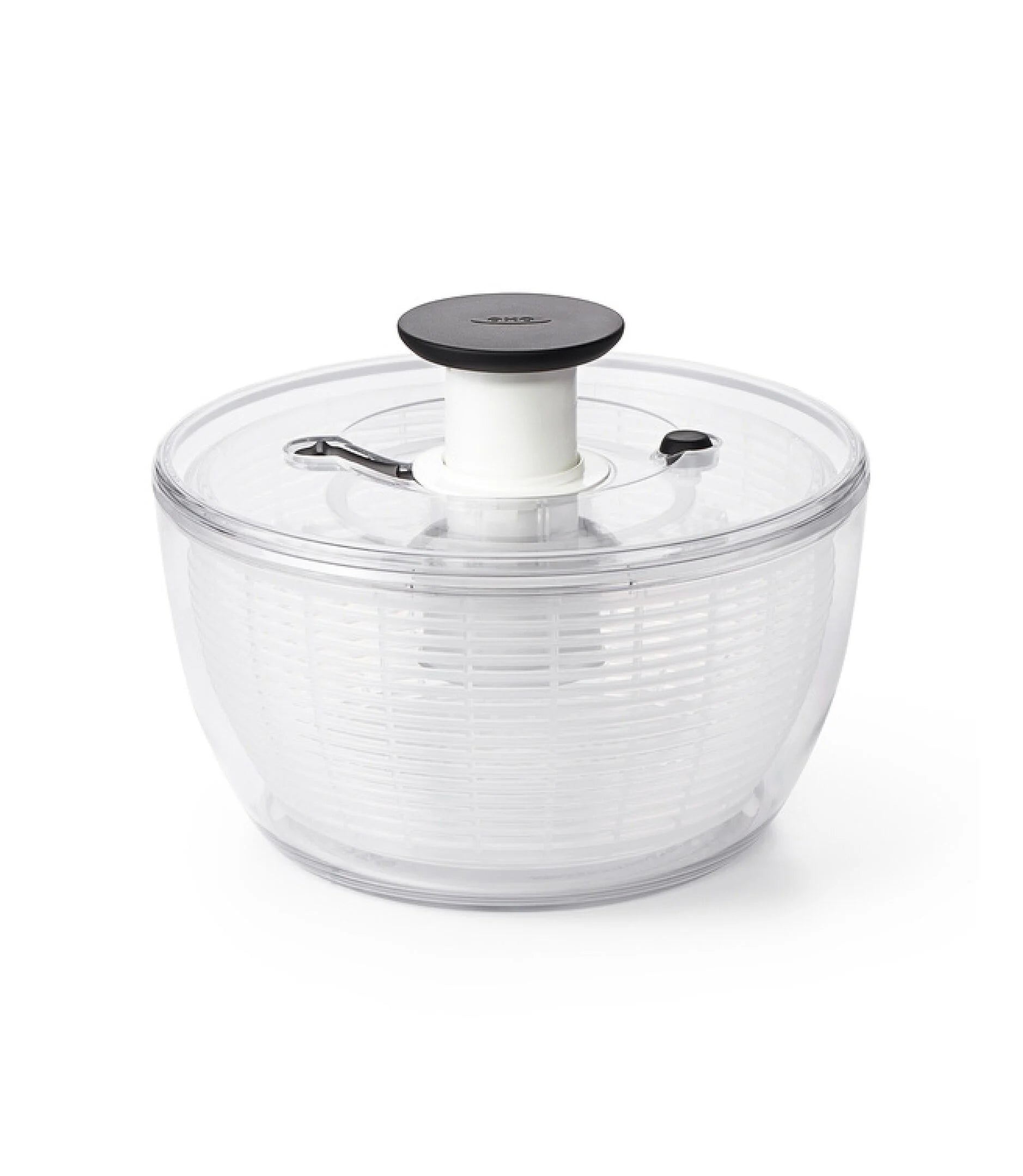 Dry salad greens with a simple press of the soft, non-slip knob. The non-slip base keeps the bowl steady on the countertop and the built-in brake button stops the Salad Spinner for unloading. The basket doubles as a colander, and the lid comes apart for easy cleaning. Selected as one of People Magazine’s 2017 50 Food Faves.