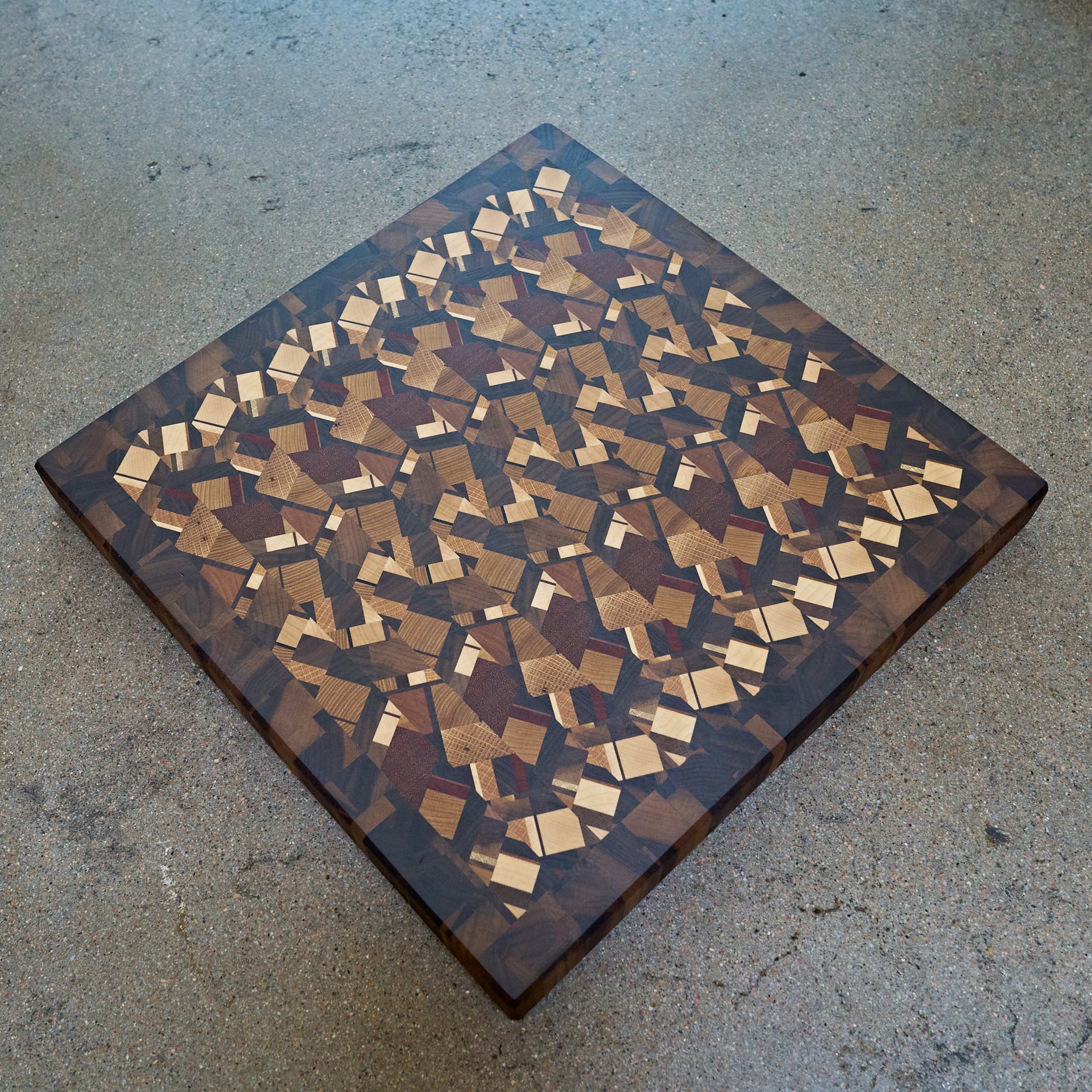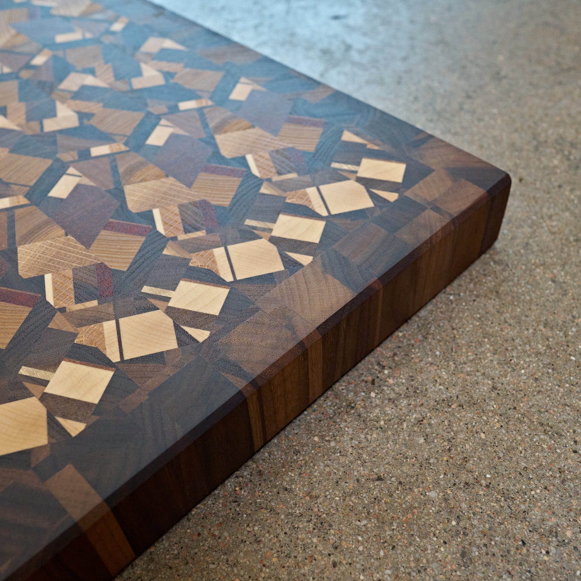 Handcrafted in Denver, CO by David Haas Howard using 100% reclaimed woods. Each pattern is unique in its own and truly one of a kind. End grain cutting boards provide a softer surface for your knives edge and helps them maintain their sharpness longer.