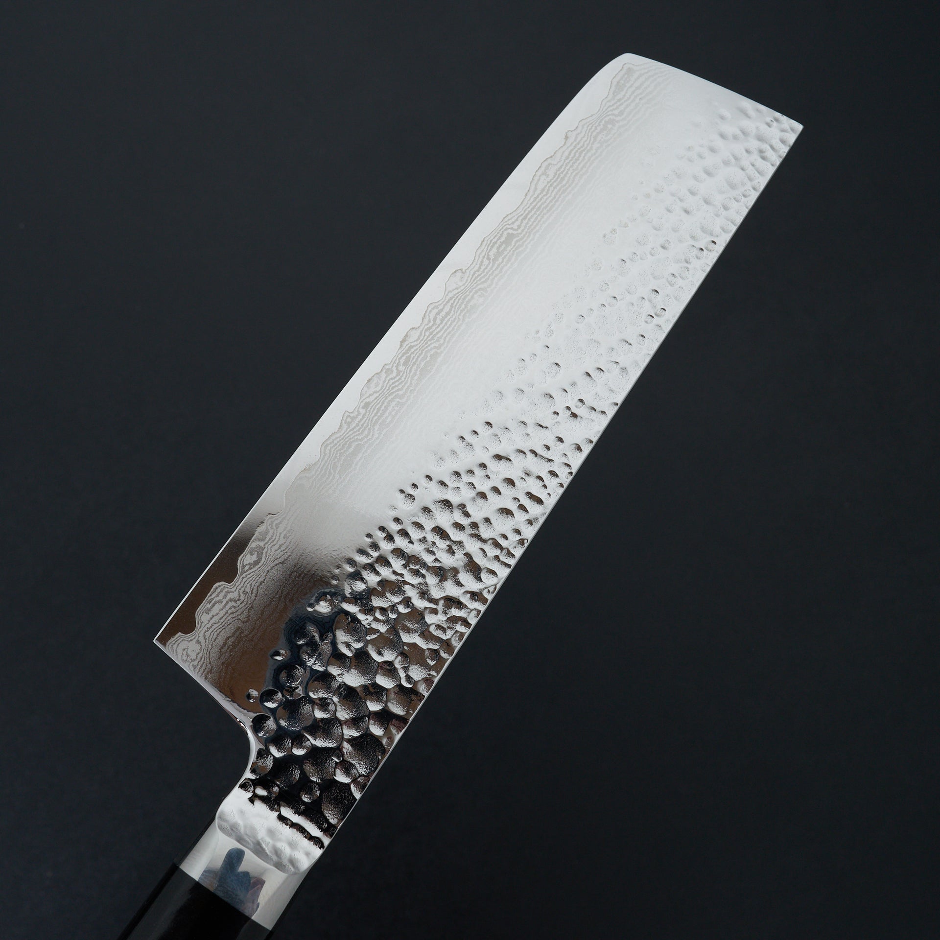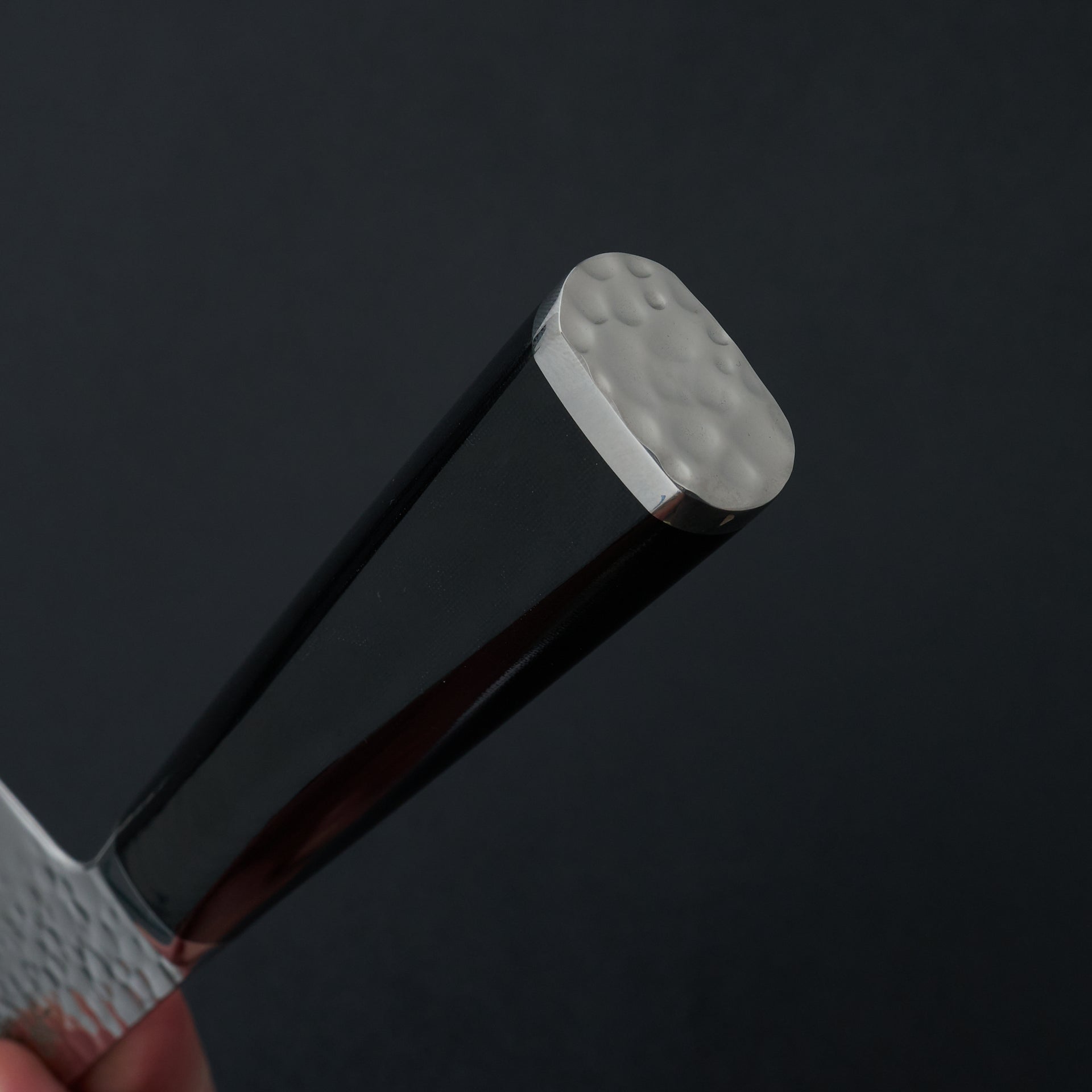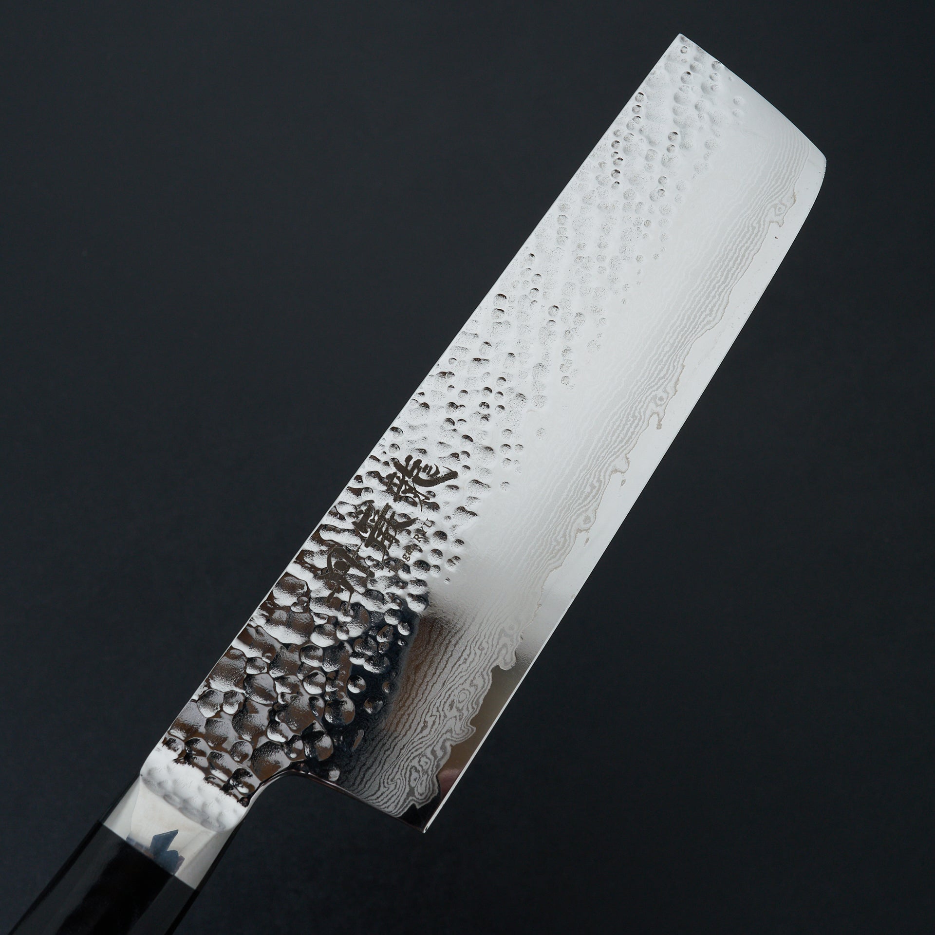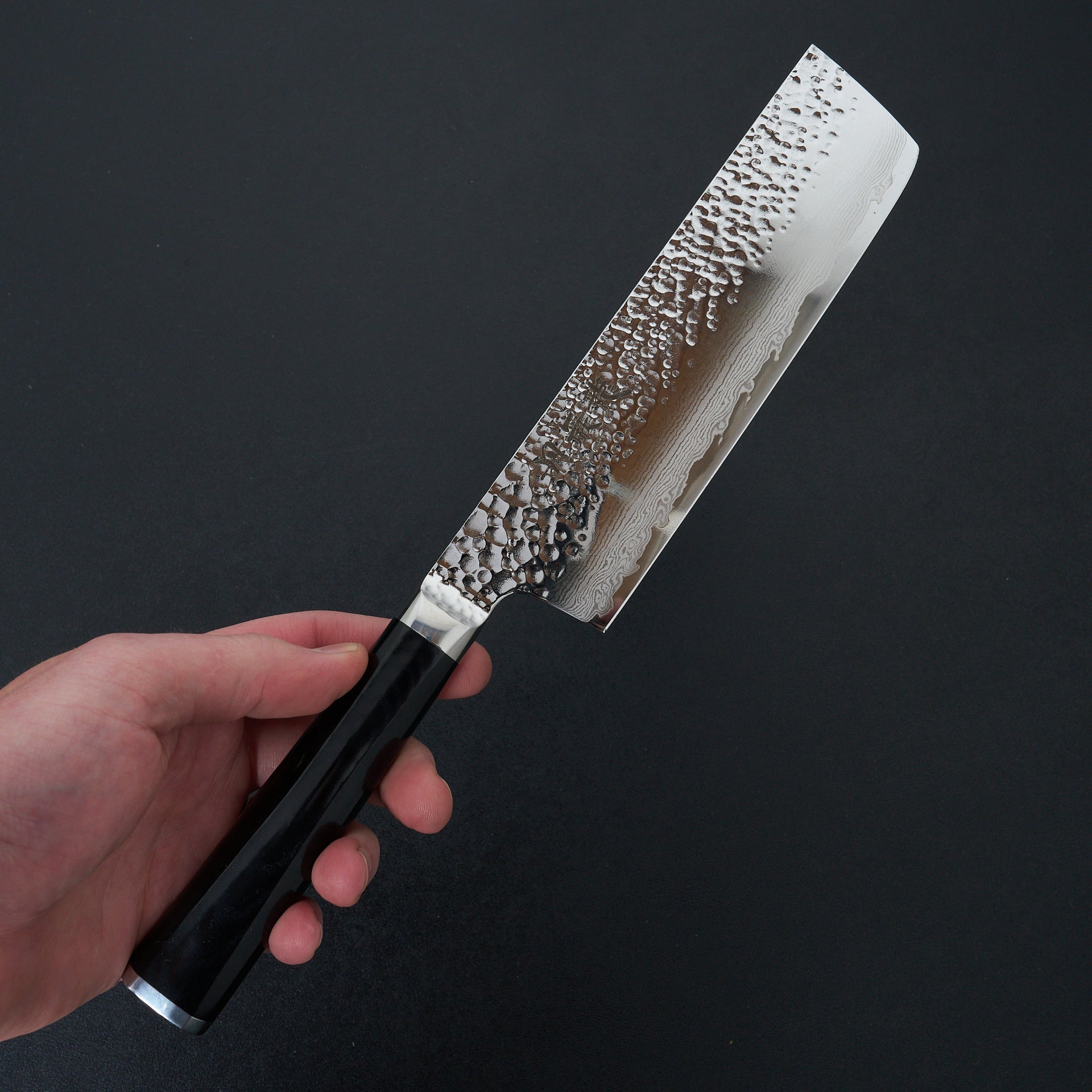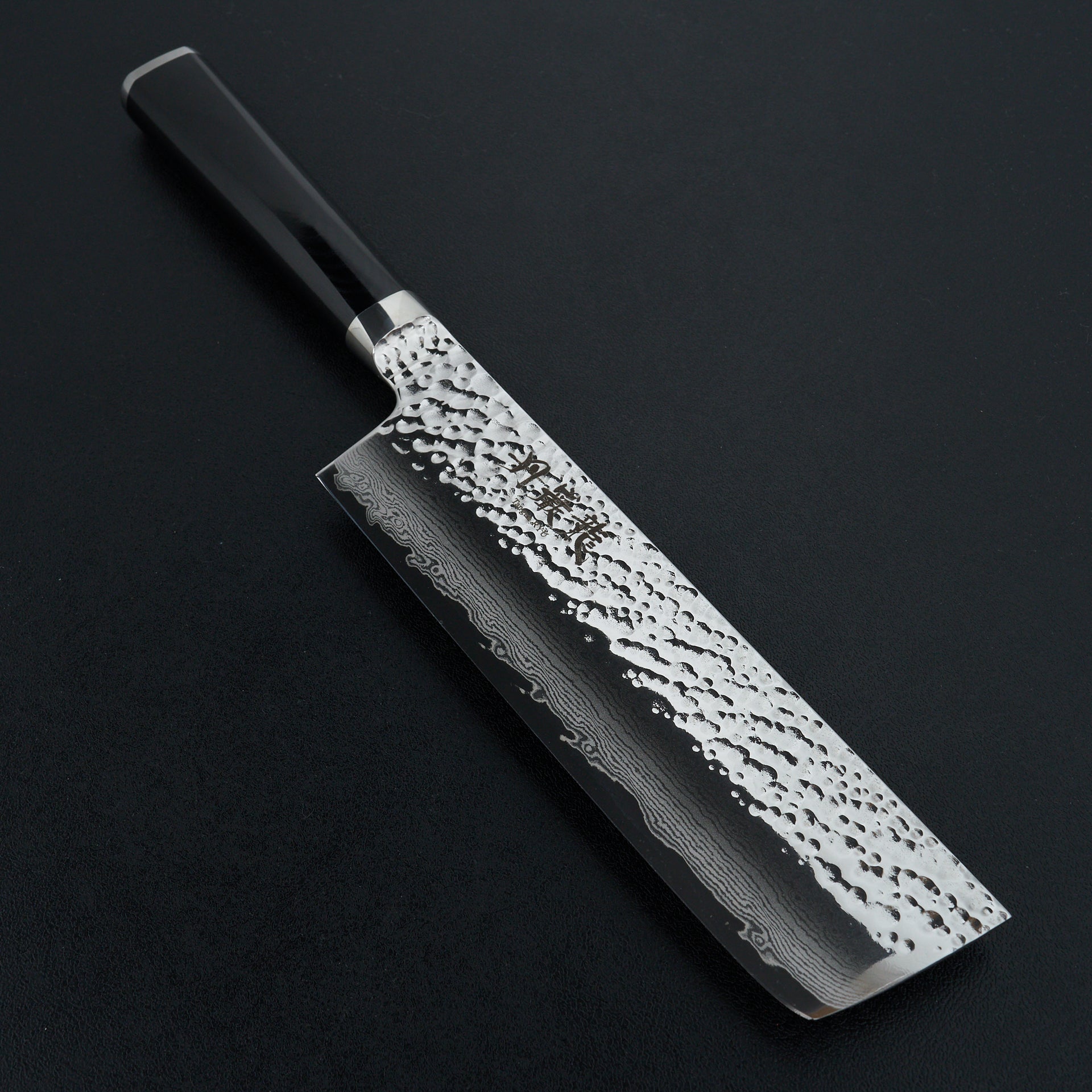 The Tanganryu series is forged from VG-10 core steel heat treated to 60 hrc, laminated in 67 layer damascus and a hammered finish on the blades surface. The finishing work on this series is absolutely top notch with every surface accounted for and polished. The handle is a hybrid style with a weighted feel like a western handle but with japanese geometry, giving the blade a very balanced feel. The handle material is black micarta which is extremely durable and very easy to care for.