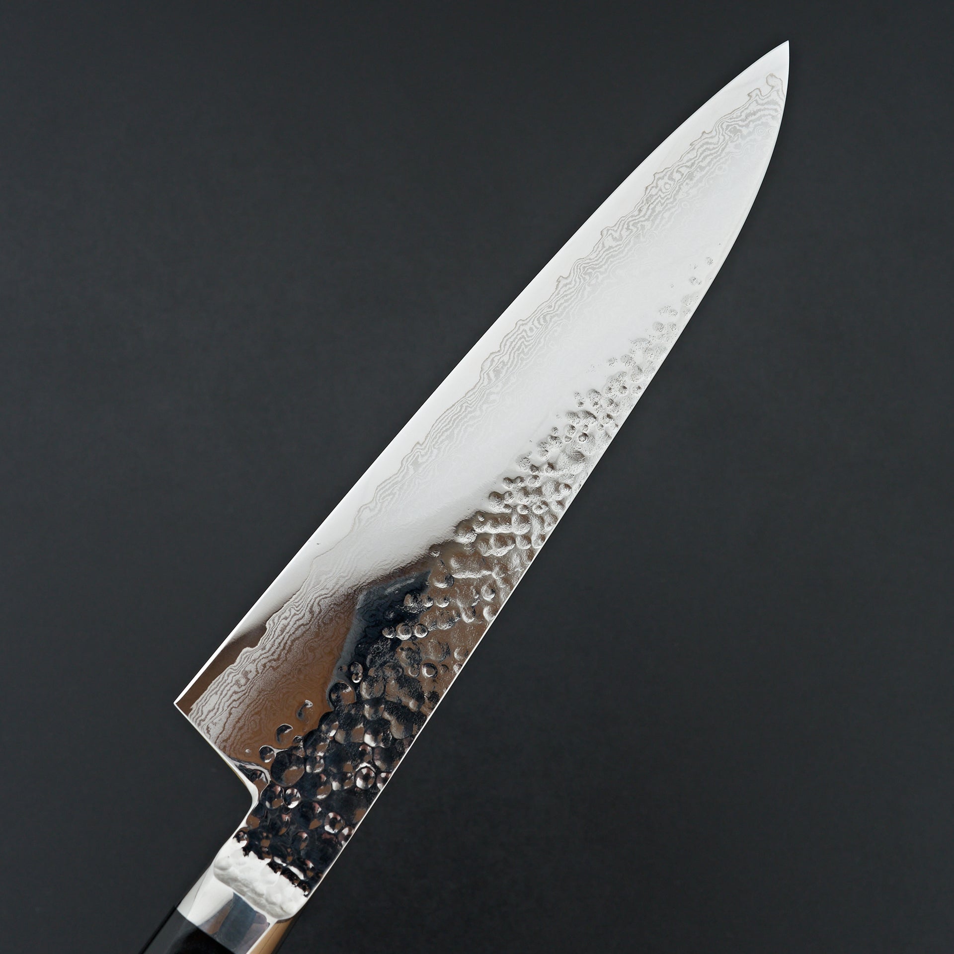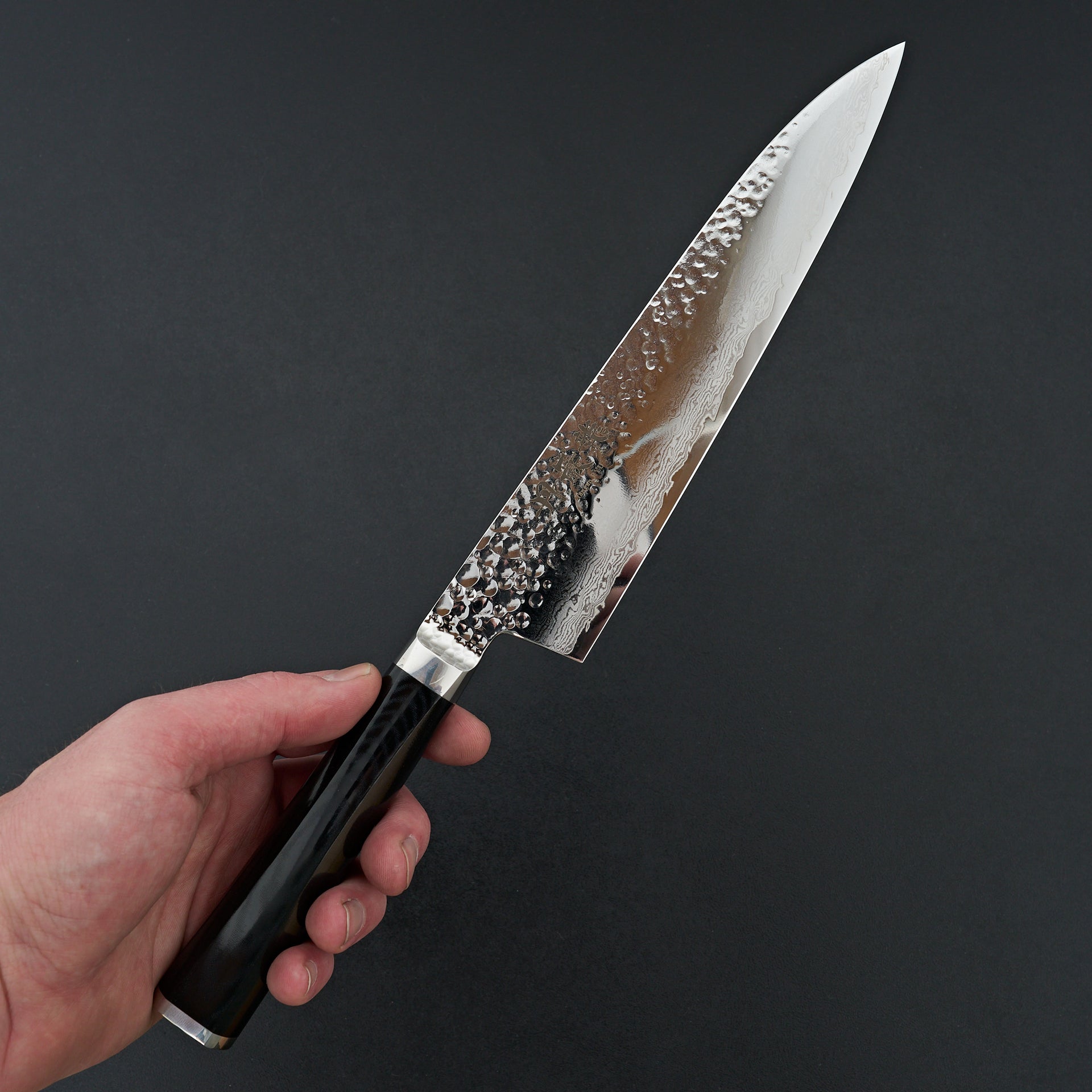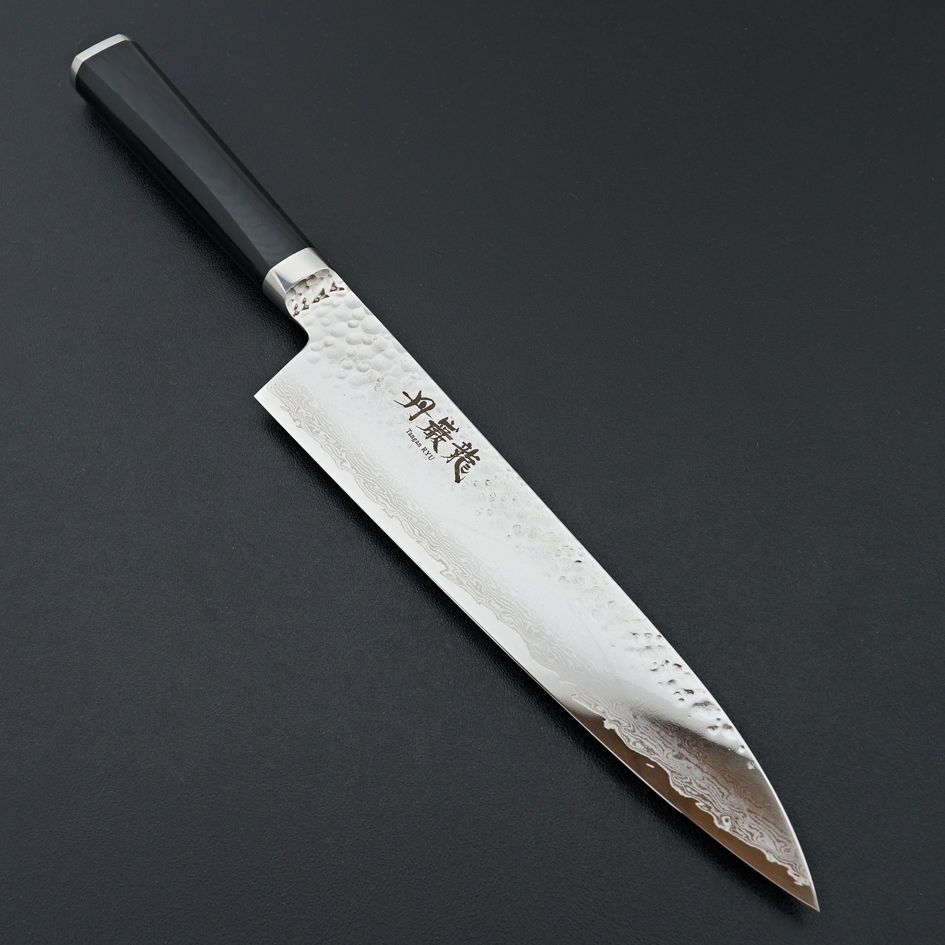 The Tanganryu series is forged from VG-10 core steel heat treated to 60 hrc, laminated in 67 layer damascus and a hammered finish on the blades surface. The finishing work on this series is absolutely top notch with every surface accounted for and polished. The handle is a hybrid style with a weighted feel like a western handle but with japanese geometry, giving the blade a very balanced feel. The handle material is black micarta which is extremely durable and very easy to care for.
