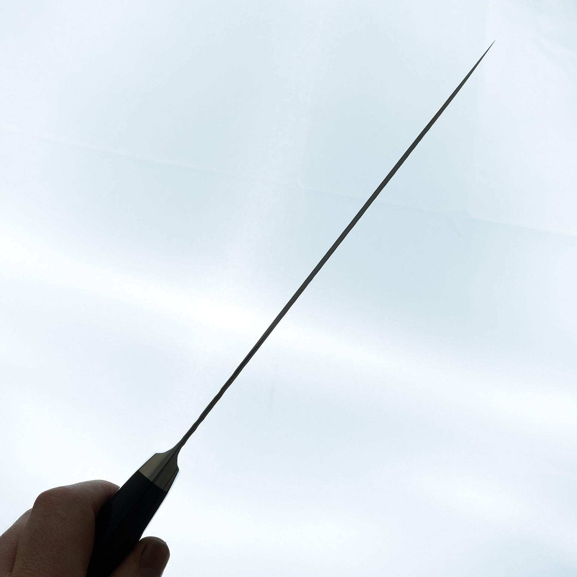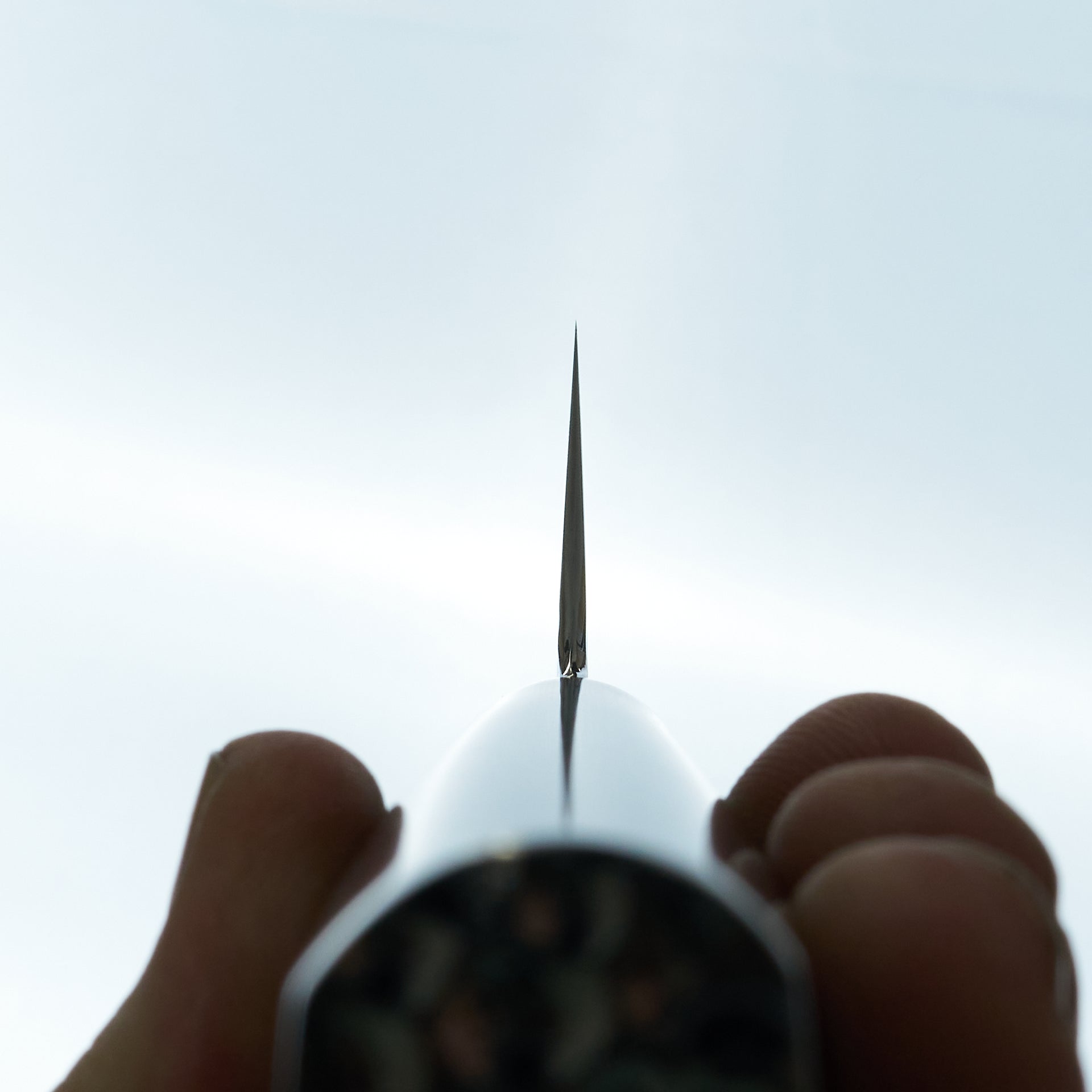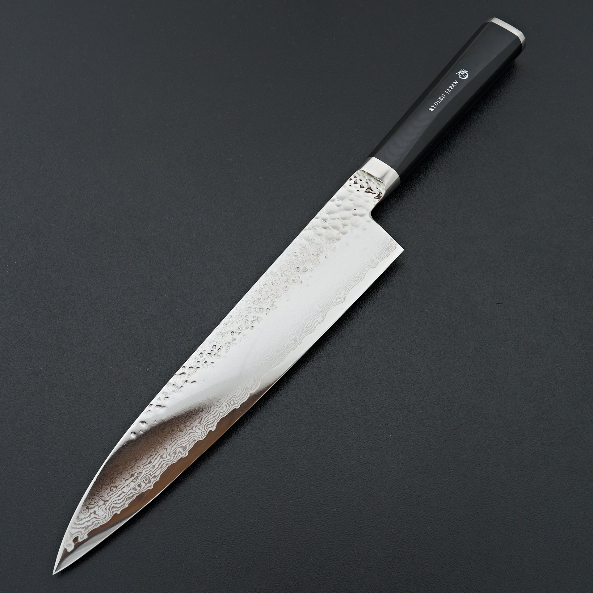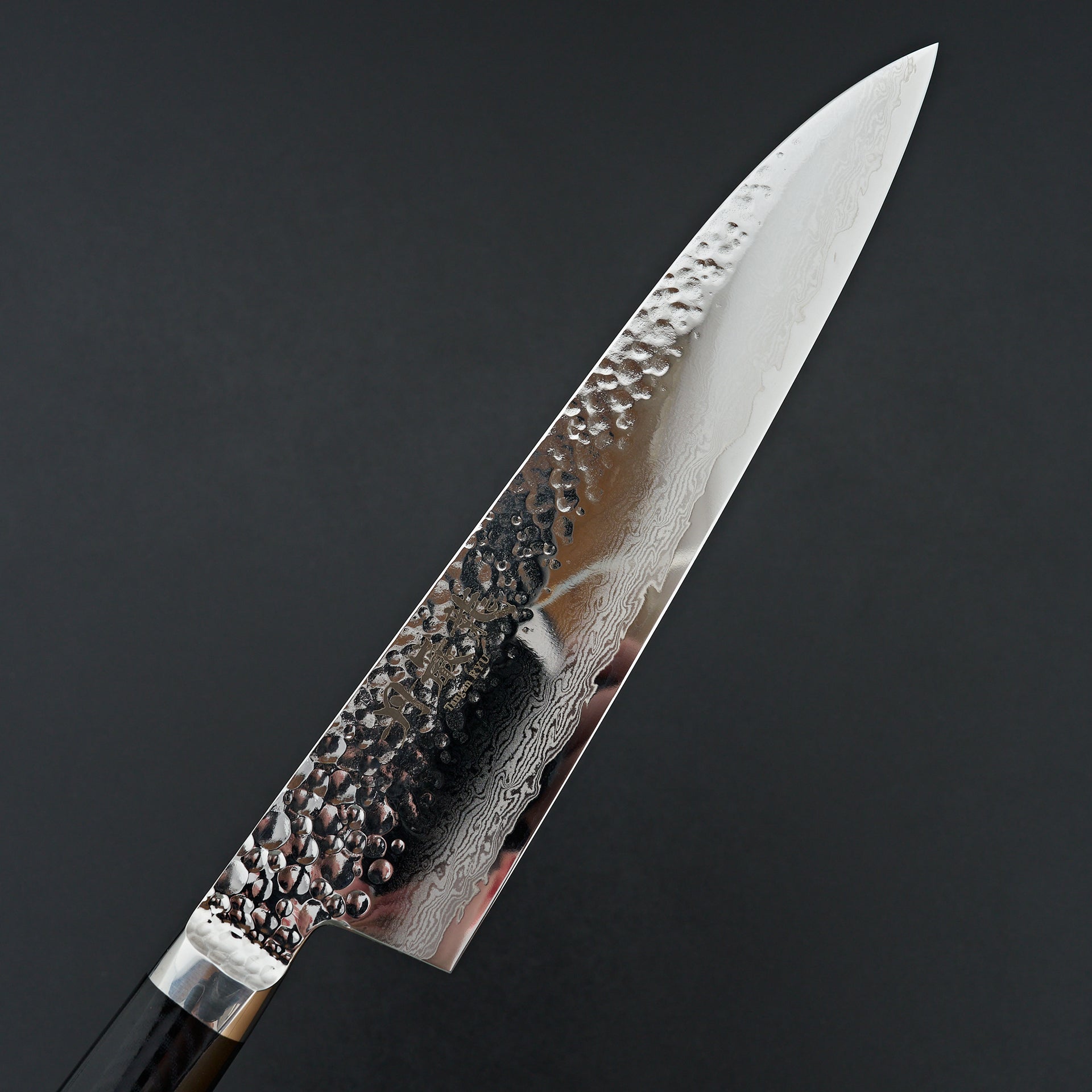 The Tanganryu series is forged from VG-10 core steel heat treated to 60 hrc, laminated in 67 layer damascus and a hammered finish on the blades surface. The finishing work on this series is absolutely top notch with every surface accounted for and polished. The handle is a hybrid style with a weighted feel like a western handle but with japanese geometry, giving the blade a very balanced feel. The handle material is black micarta which is extremely durable and very easy to care for.