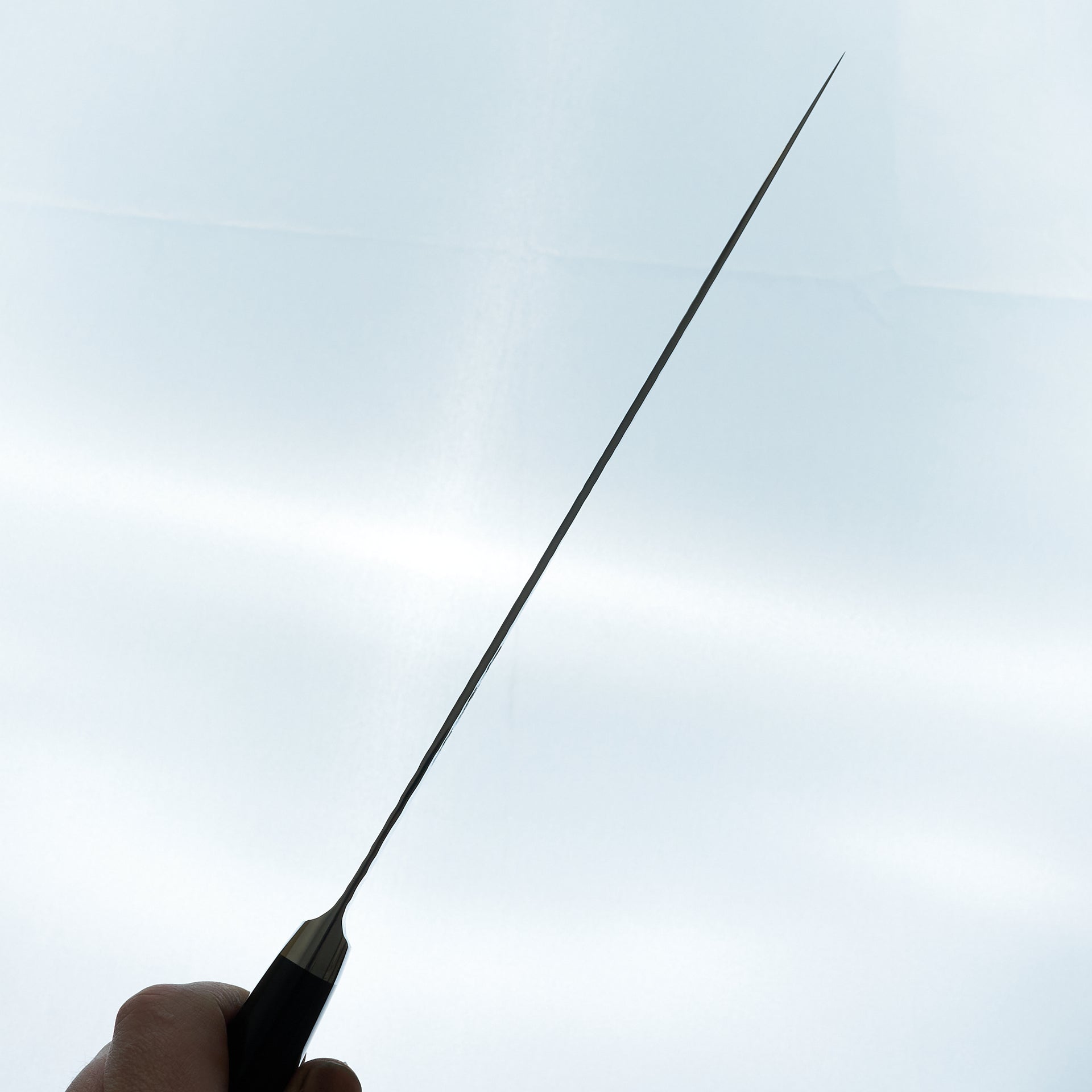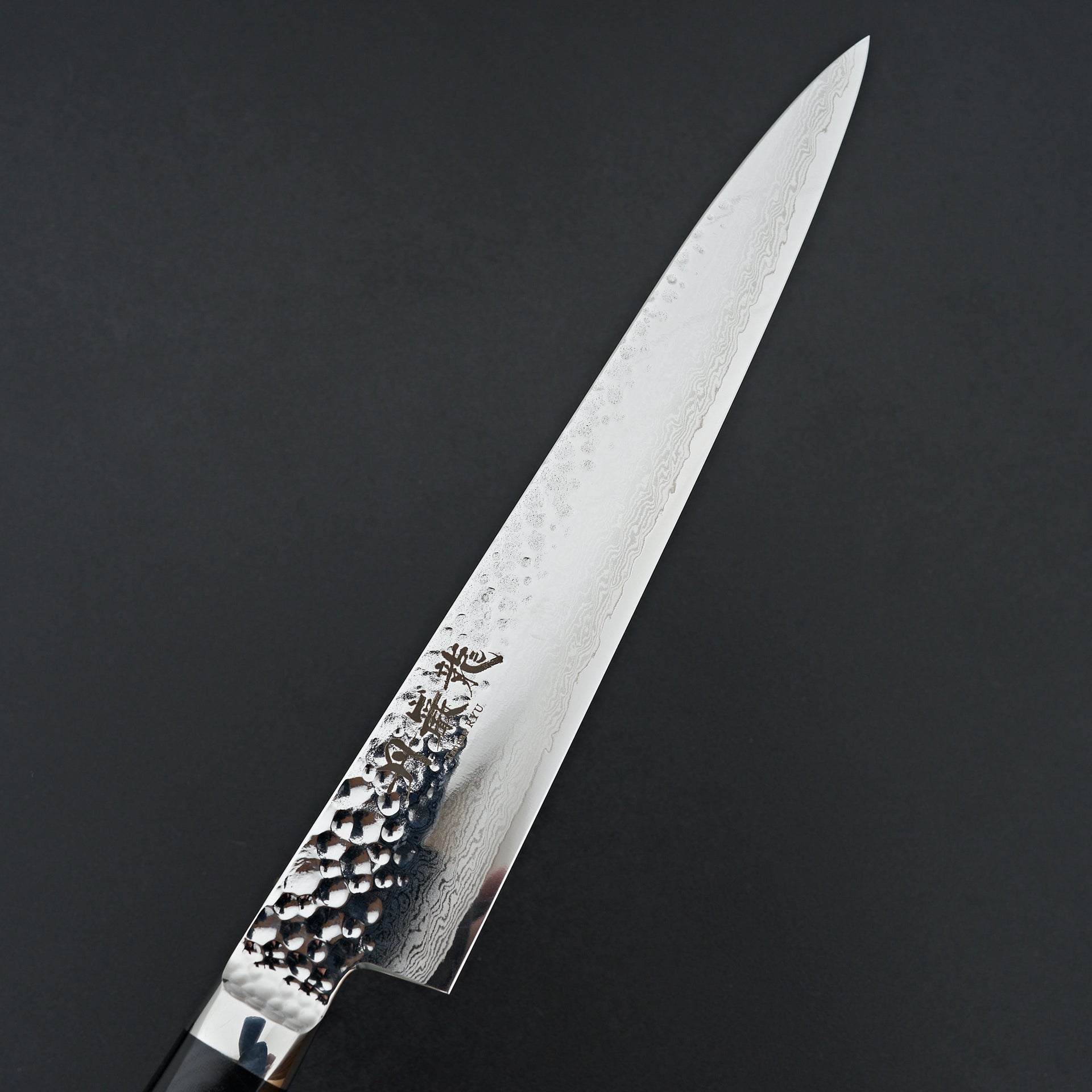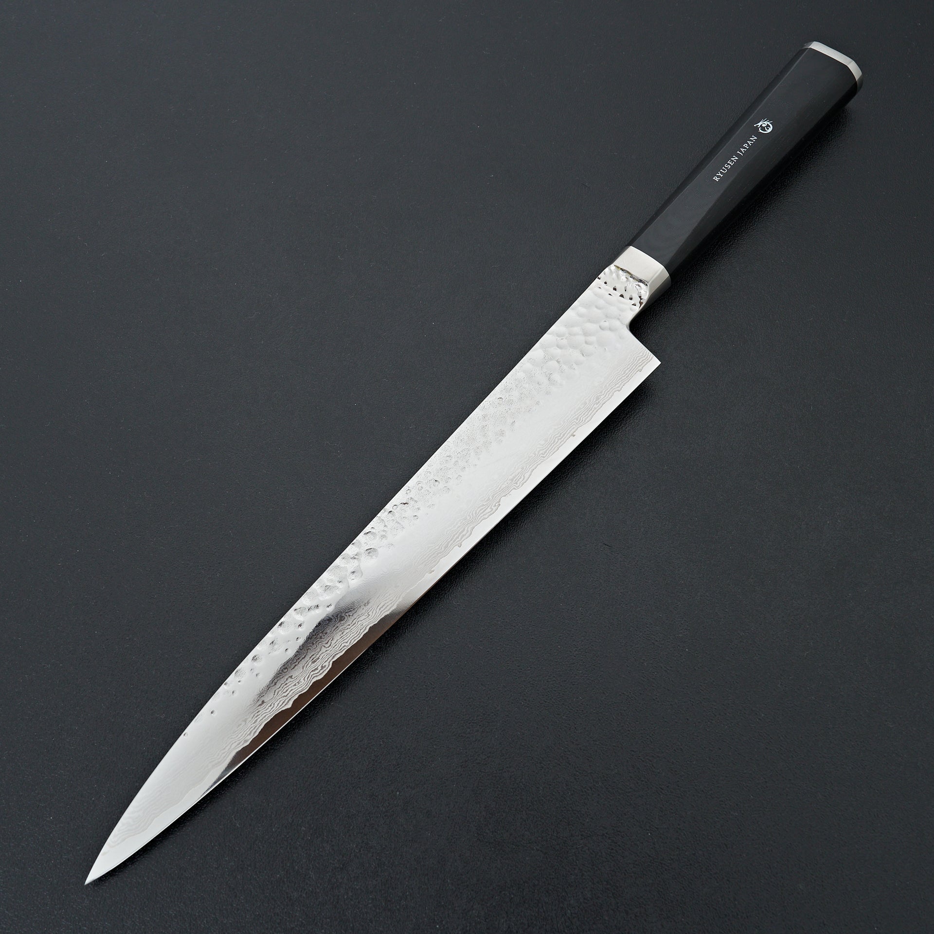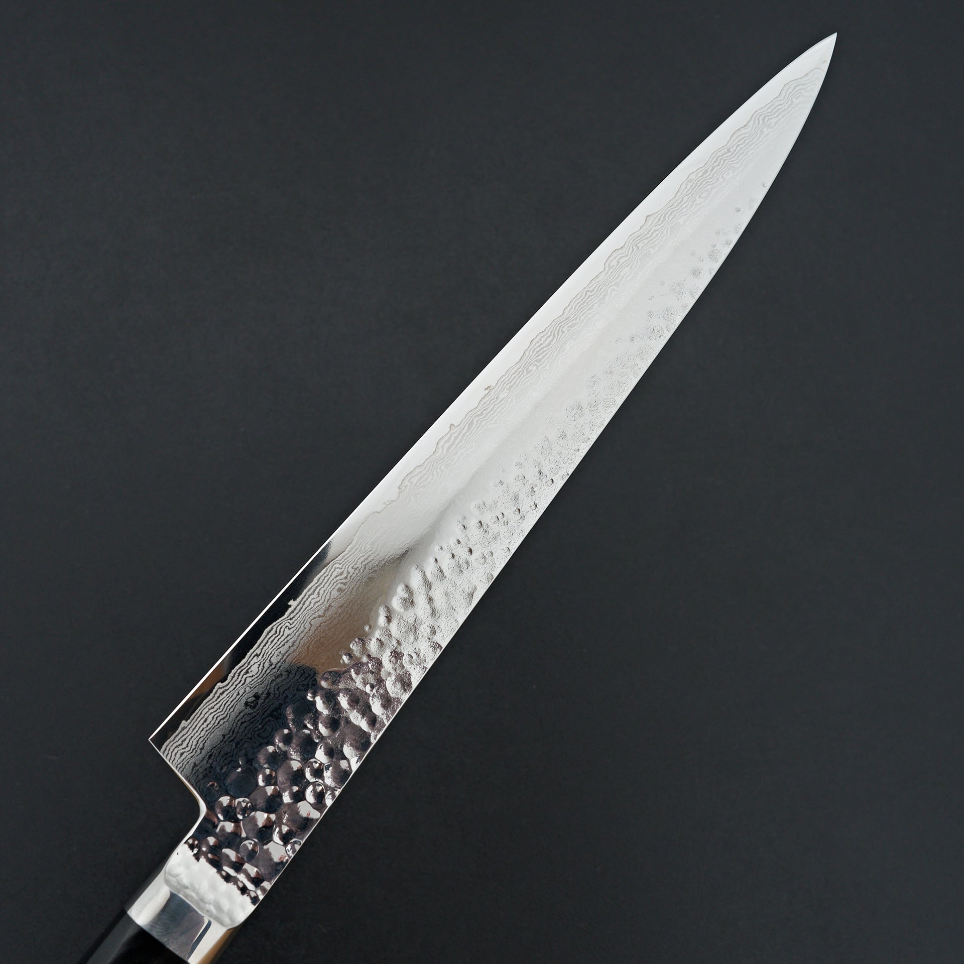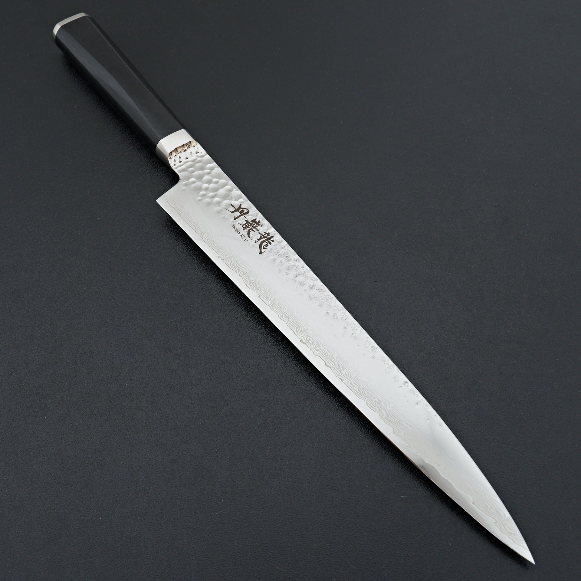 The Tanganryu series is forged from VG-10 core steel heat treated to 60 hrc, laminated in 67 layer damascus and a hammered finish on the blades surface. The finishing work on this series is absolutely top notch with every surface accounted for and polished. The handle is a hybrid style with a weighted feel like a western handle but with japanese geometry, giving the blade a very balanced feel. The handle material is black micarta which is extremely durable and very easy to care for.