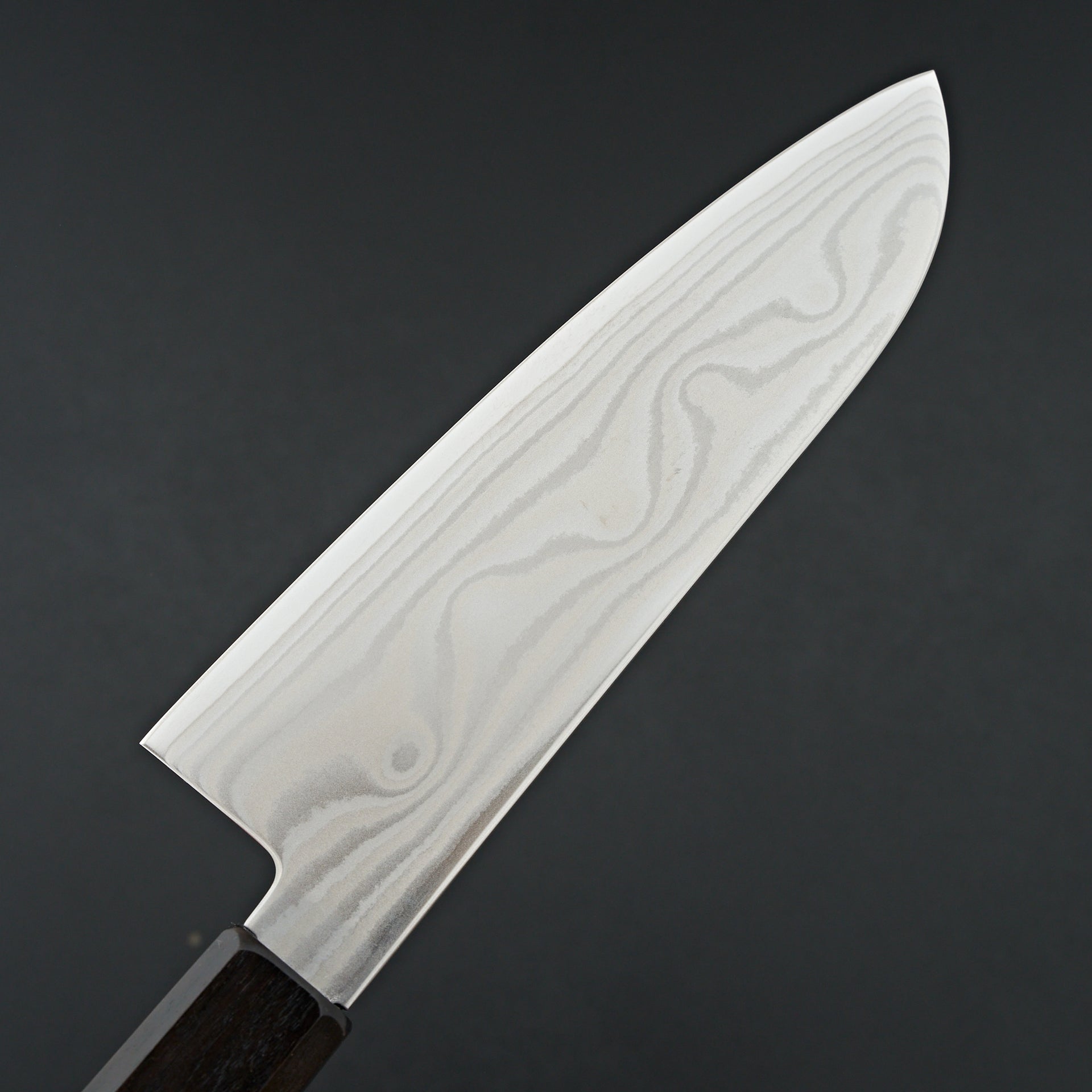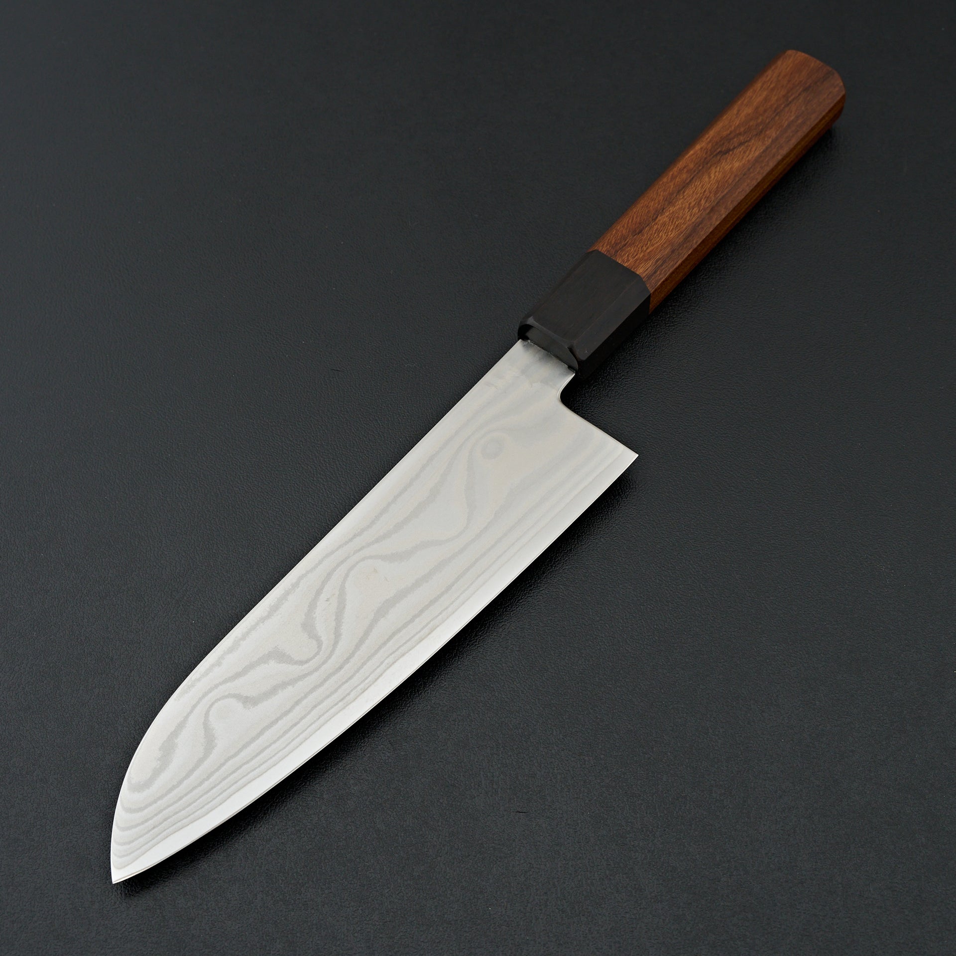 Grand Chef Series Hamon by Sakai Takayuki is a professional series of knives using high grade Bohler-Uddeholm stainless steel hardened to 61hrc. This steel has very fine grain, good toughness and excellent edge life. Many professionals adore this series for its long lasting edge. The cladding is made from 45 layers of stainless damascus. The blade is ground thin and the blade face has a smooth polish. The octagonal handle is made from rosewood and ebony ferrule