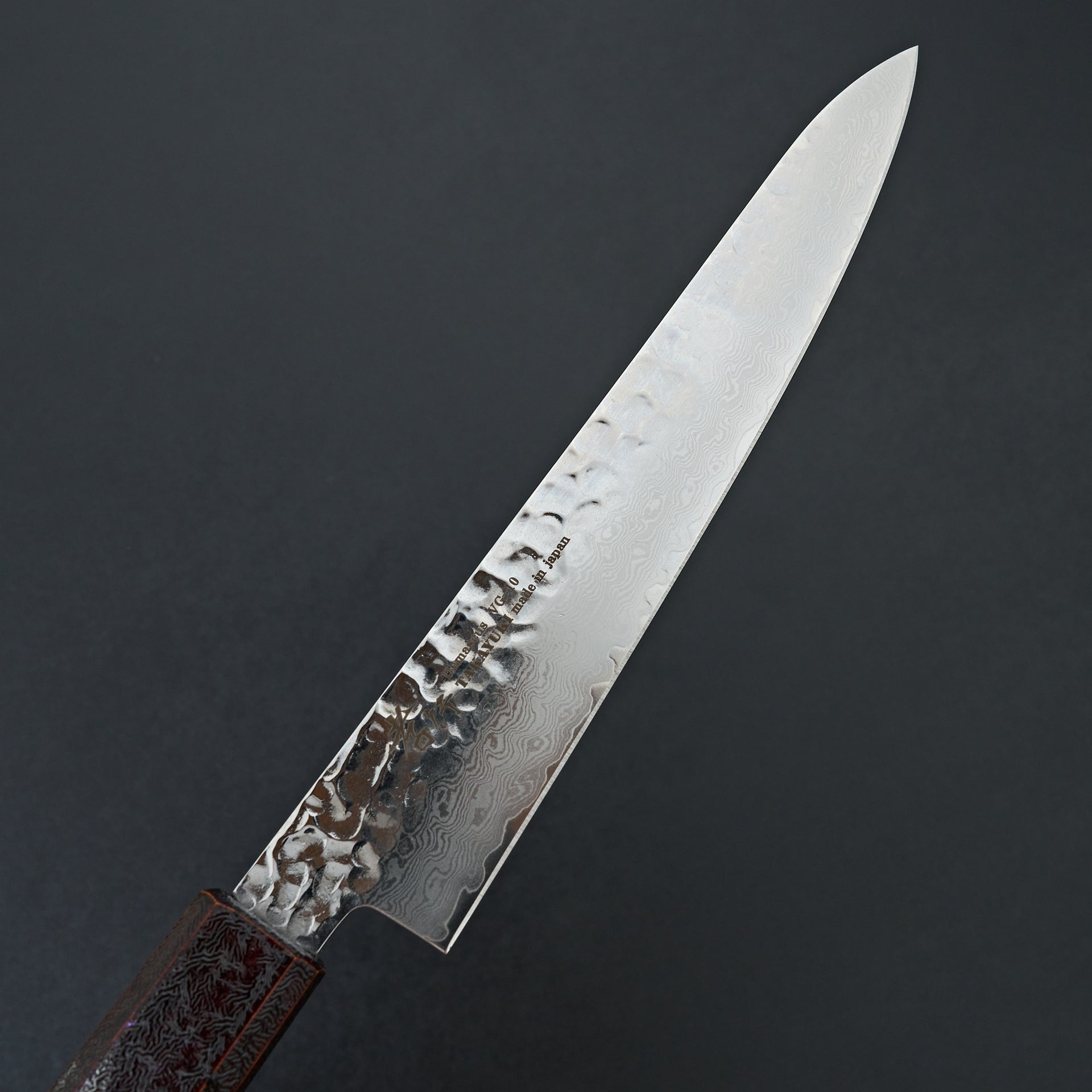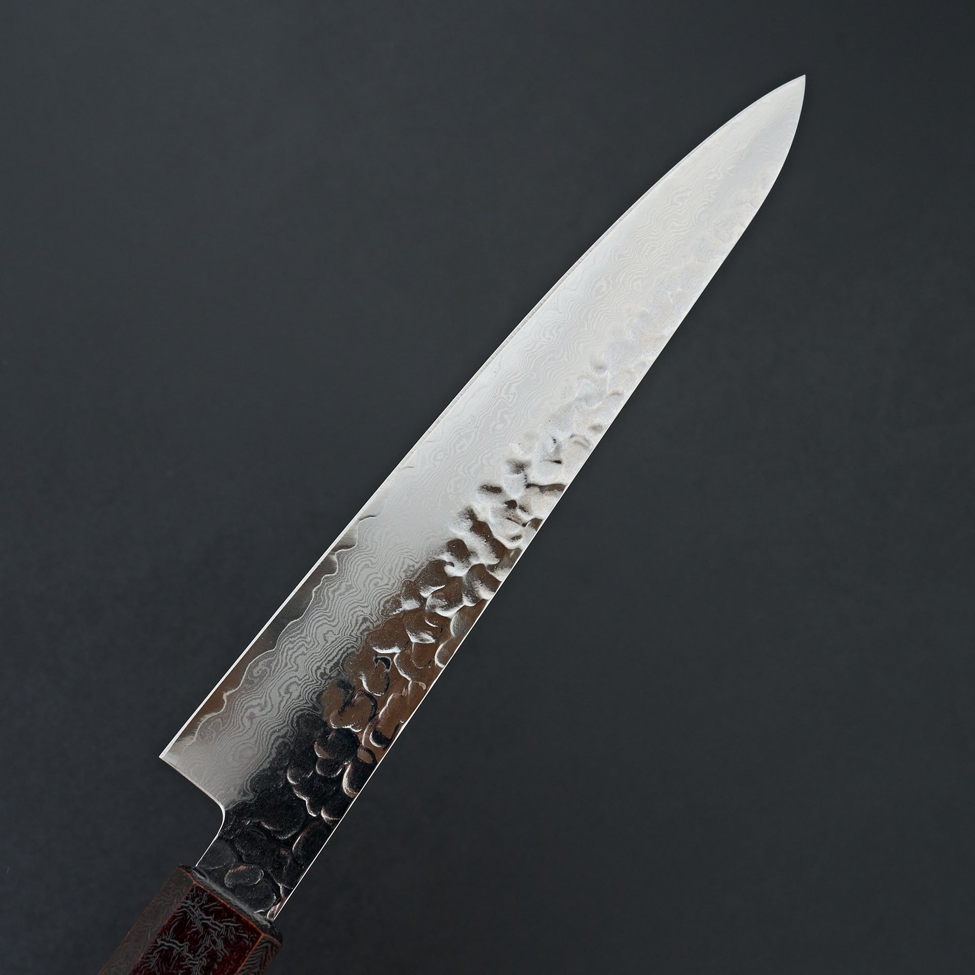 The Sakai Takayuki 33 layer damascus line is an exceptional quality knife at a great value. Forged with a core steel of VG-10 and cladded in a 33 layer stainless damascus. Rated at 60-61hrc this steel has very good toughness, edge life and ease of sharpenability. The blade face is finished with a tsuchime (hammered) pattern that not only looks amazing but also helps with food from sticking to the blade. The octagonal handle is finished with beautiful urushi lacquering from Echizen urushi craftsman.