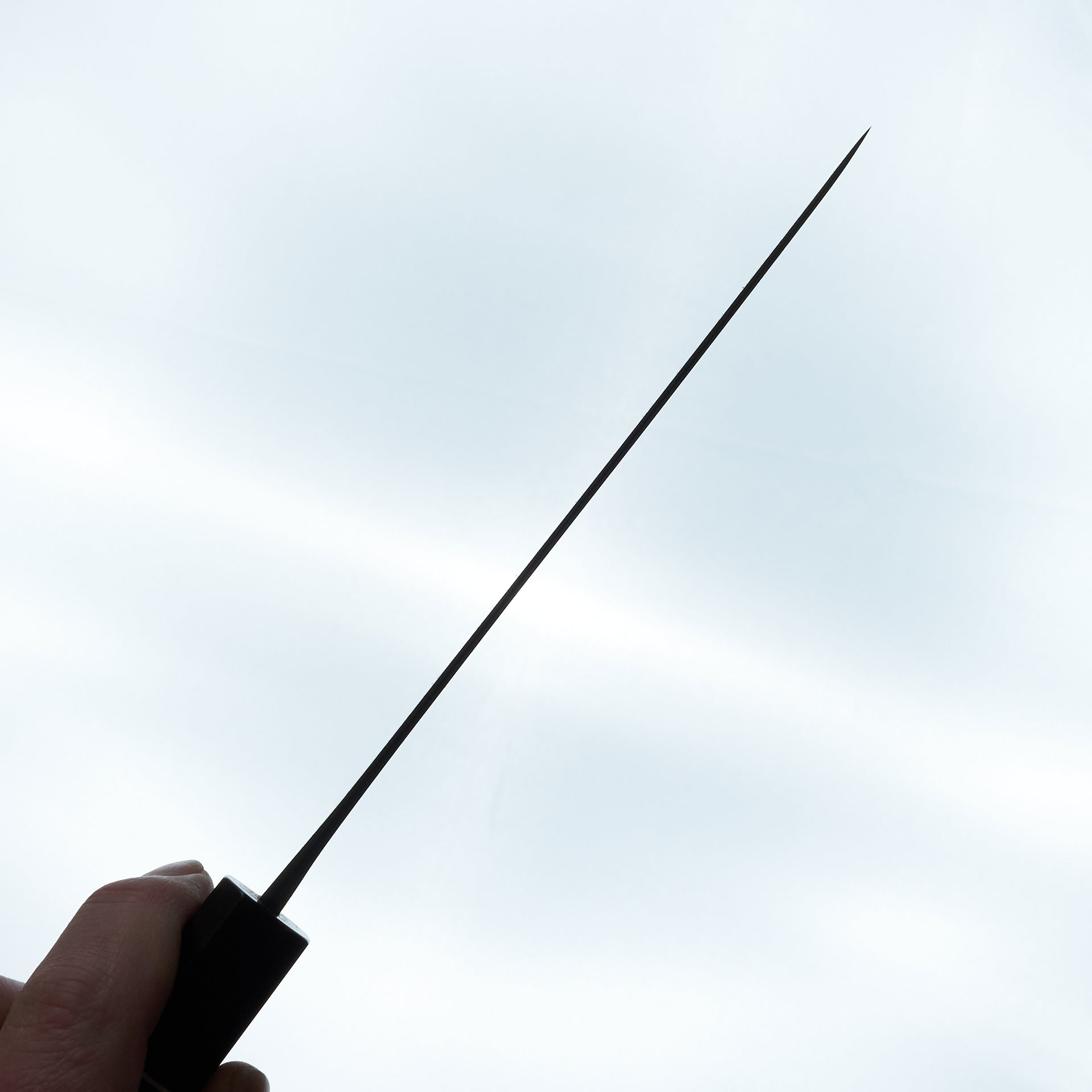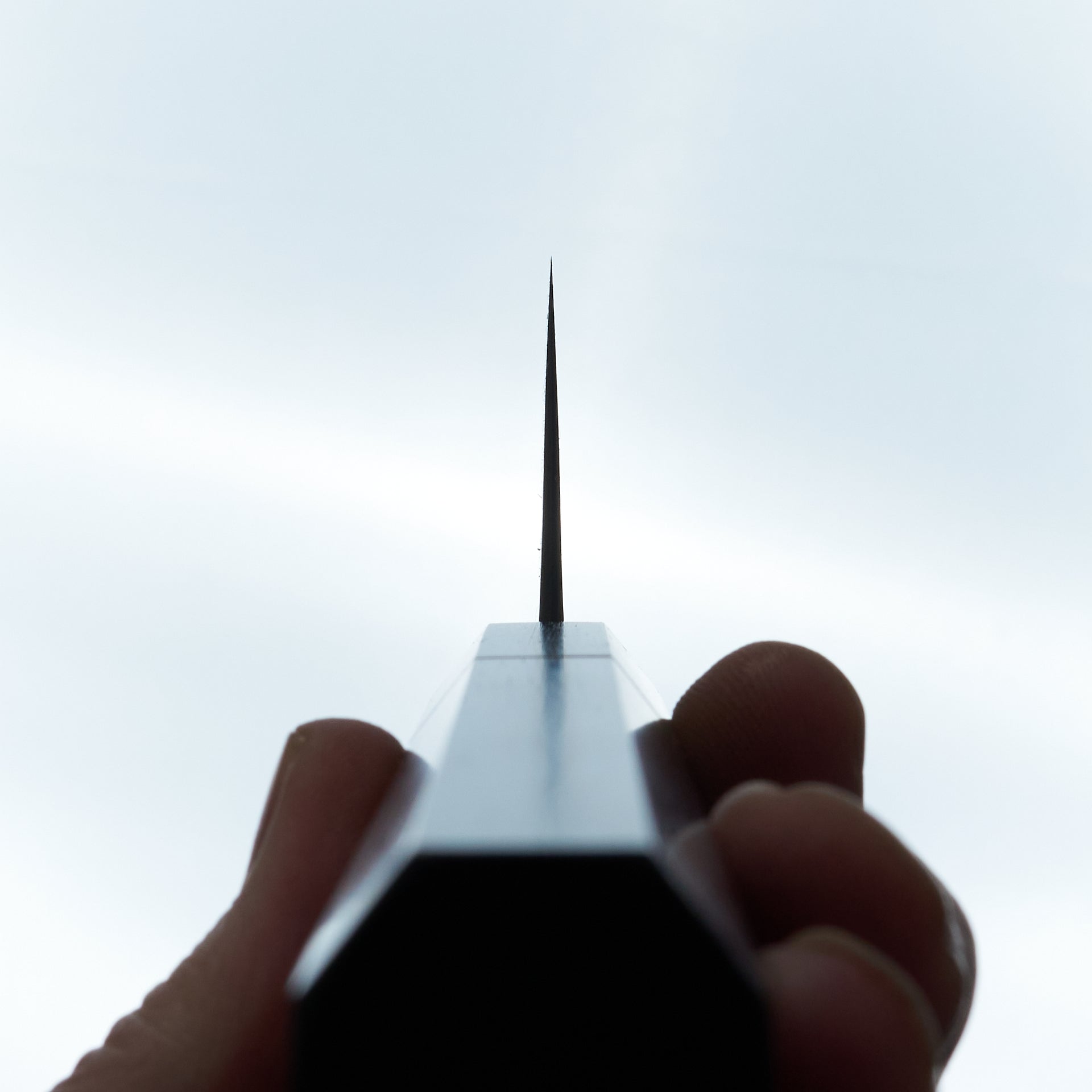 Shiro Kamo is a master certified bladesmith working out of Takefu knife village in Echizen Japan. This series is made from hand forged SG2 powdered steel laminated in damascus cladding. Tjhe blade face has a darkened etch for a high contrast finish showcasing the damascus patterning. Kamo sans knives are loved for their tall profiles and very smooth sharpening work. His blade geometry is thin, but still has a bit of body to it. The octagonal handles are made from ebony with a white synthetic spacer.