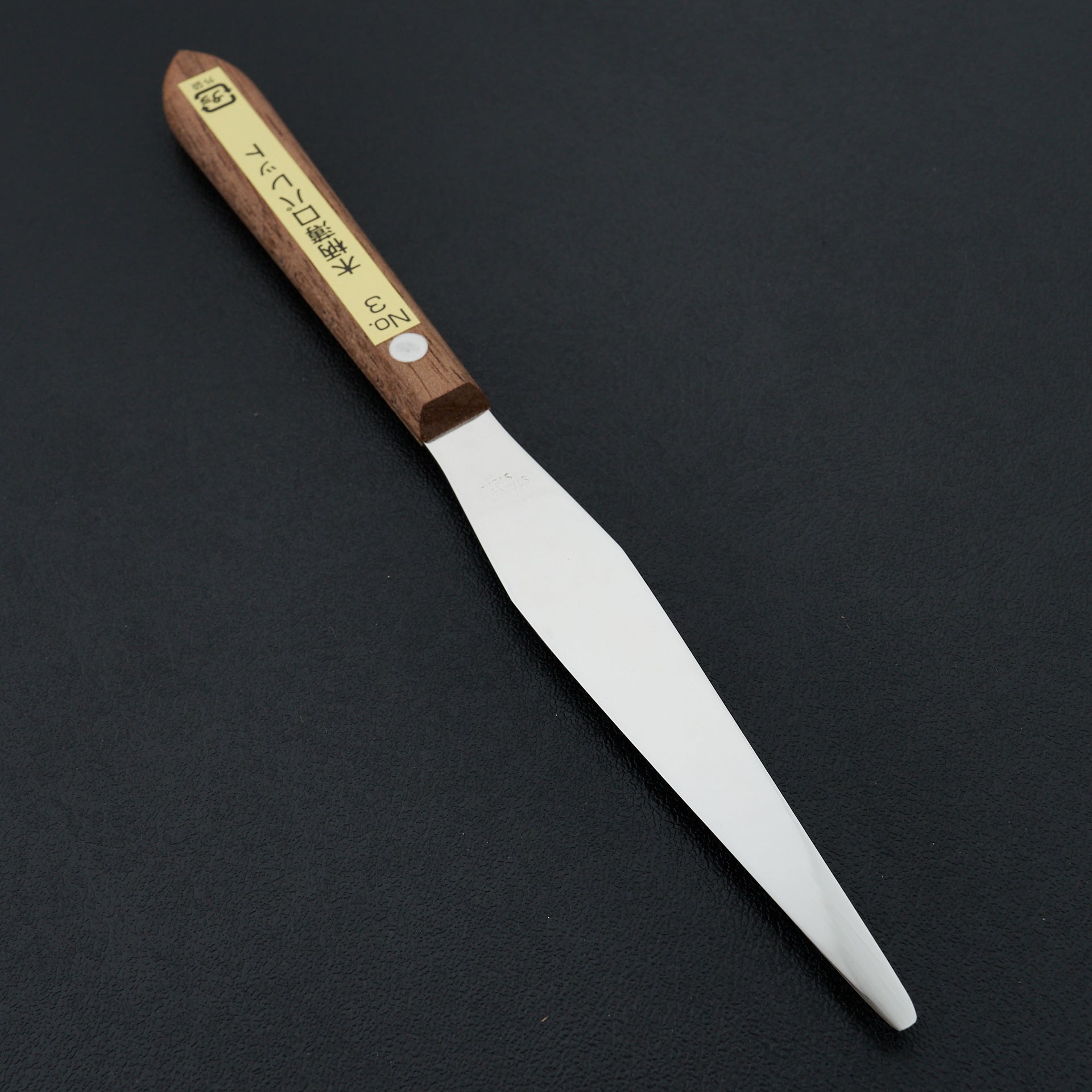 Made from stainless steel with wooden riveted handle. Very flexible blade for spreading and detail work. Made in Japan.