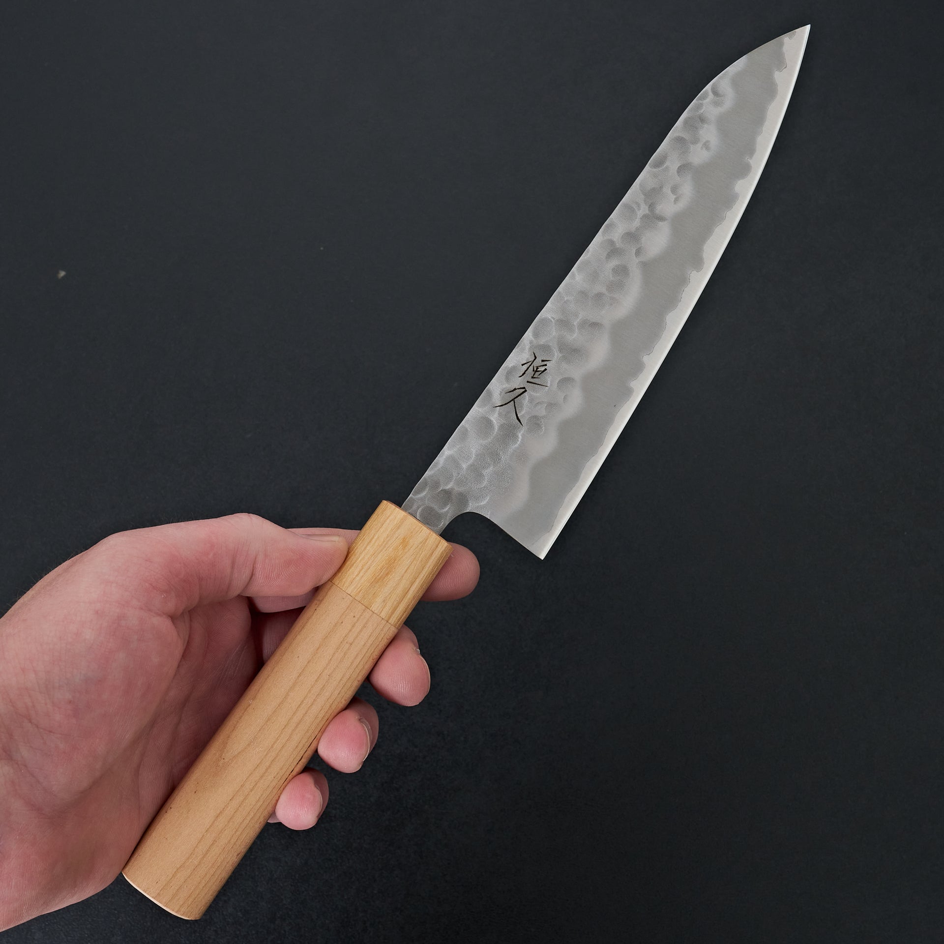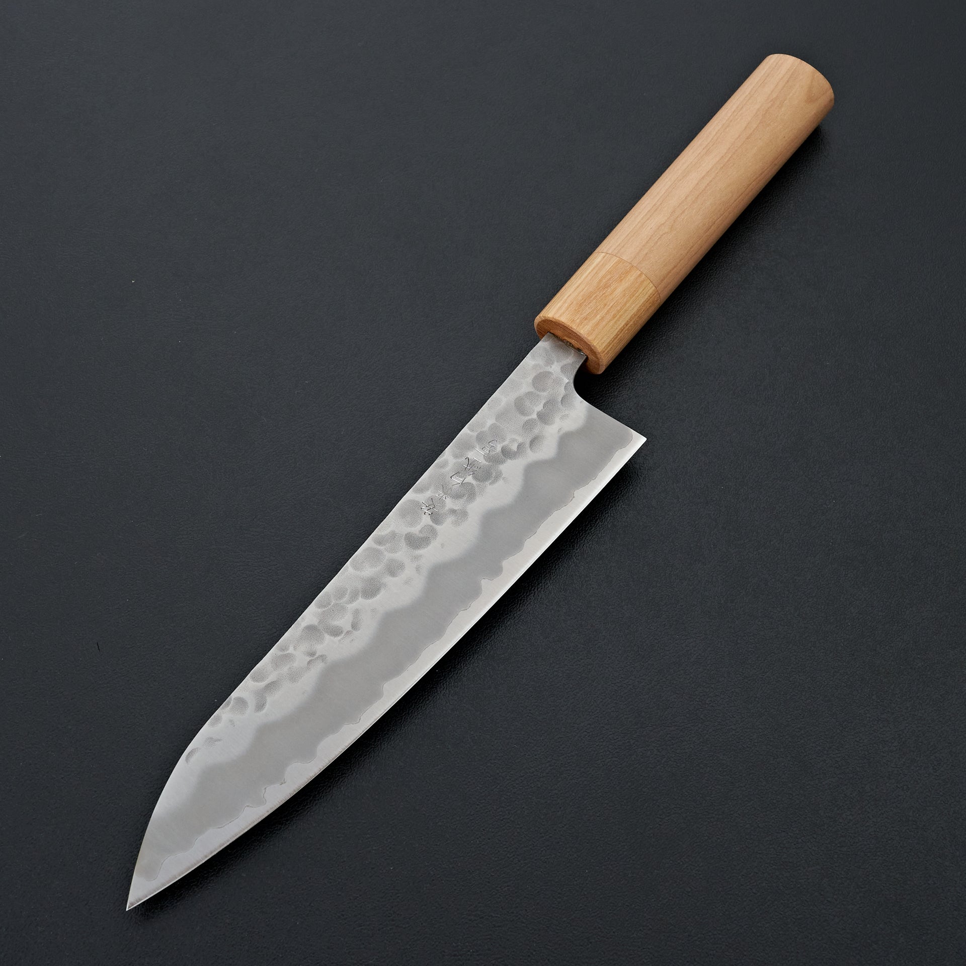 Tsunehisa Shirogami line is forged from White #2 carbon steel and is cladded in stainless. Hardness rating is ~63 HRC. These knives have great sharpness and ease of sharpening ability. The blade is finished with a tsuchime hammered pattern. They are fitted with oval cherry cherry wood and maple ferrule handles.