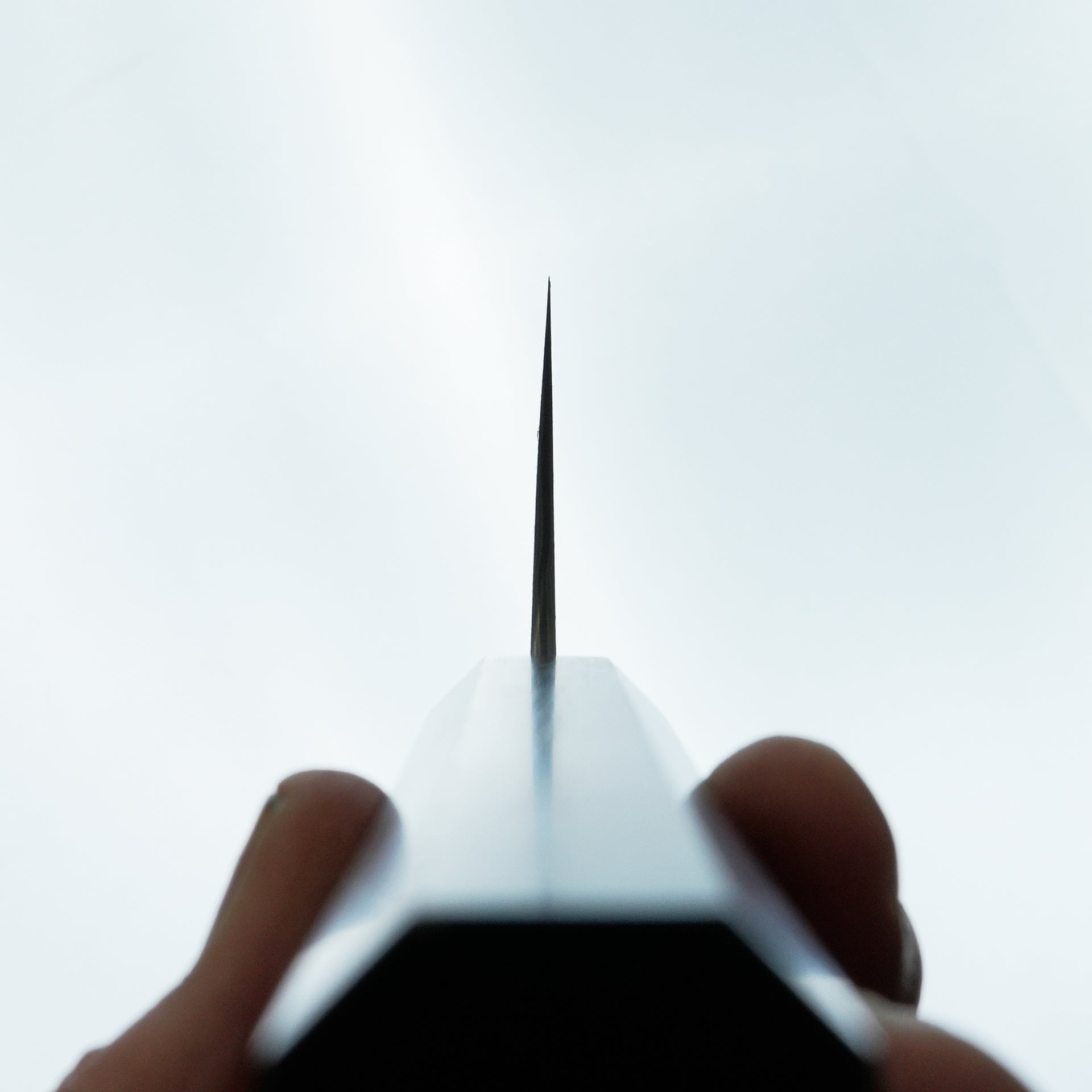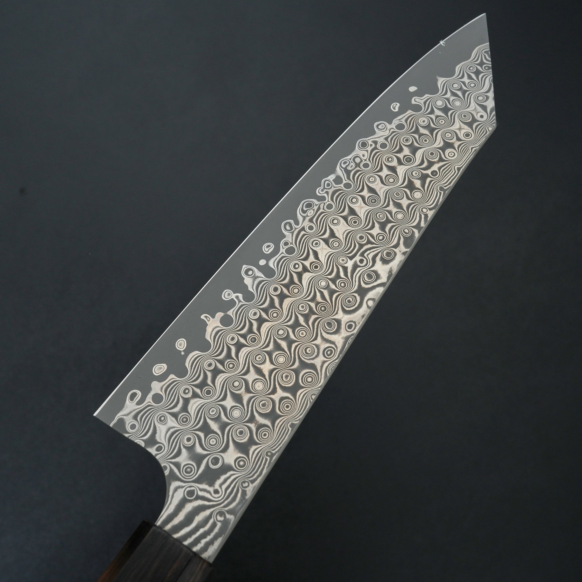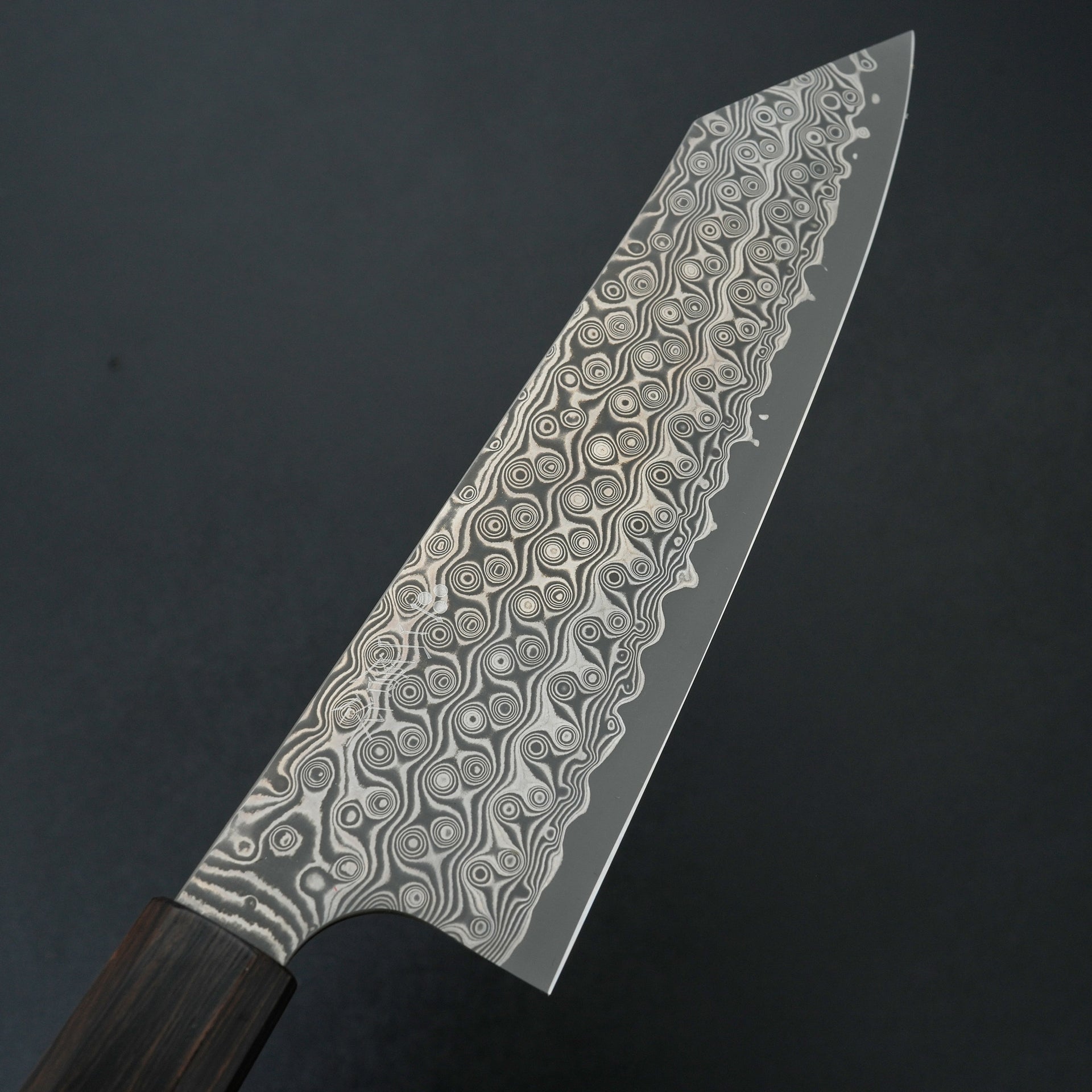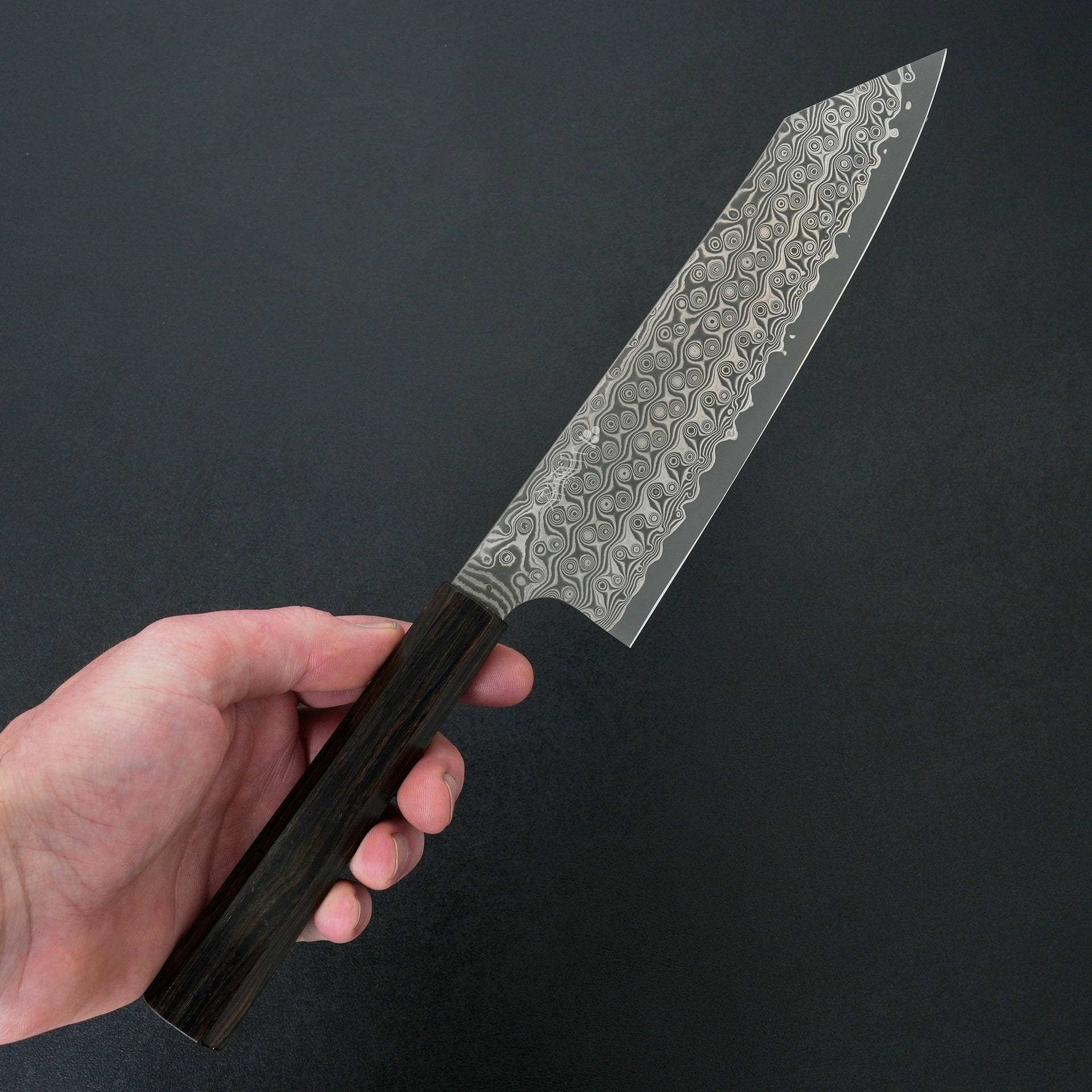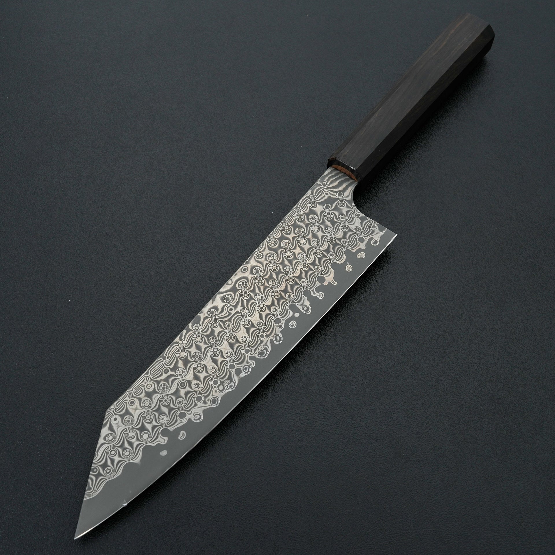 This series features SG2 powdered steel as the choice for the cutting edge. SG2 is a popular high carbon stainless steel with great wear resistance and very easy to care for. The blade is laminated with a striking handmade raindrop damascus and the blade is deep etched for a high contrast finish. These are ground thin and more performance focused for excellent cutting feel. Fitted with an ebony handle.