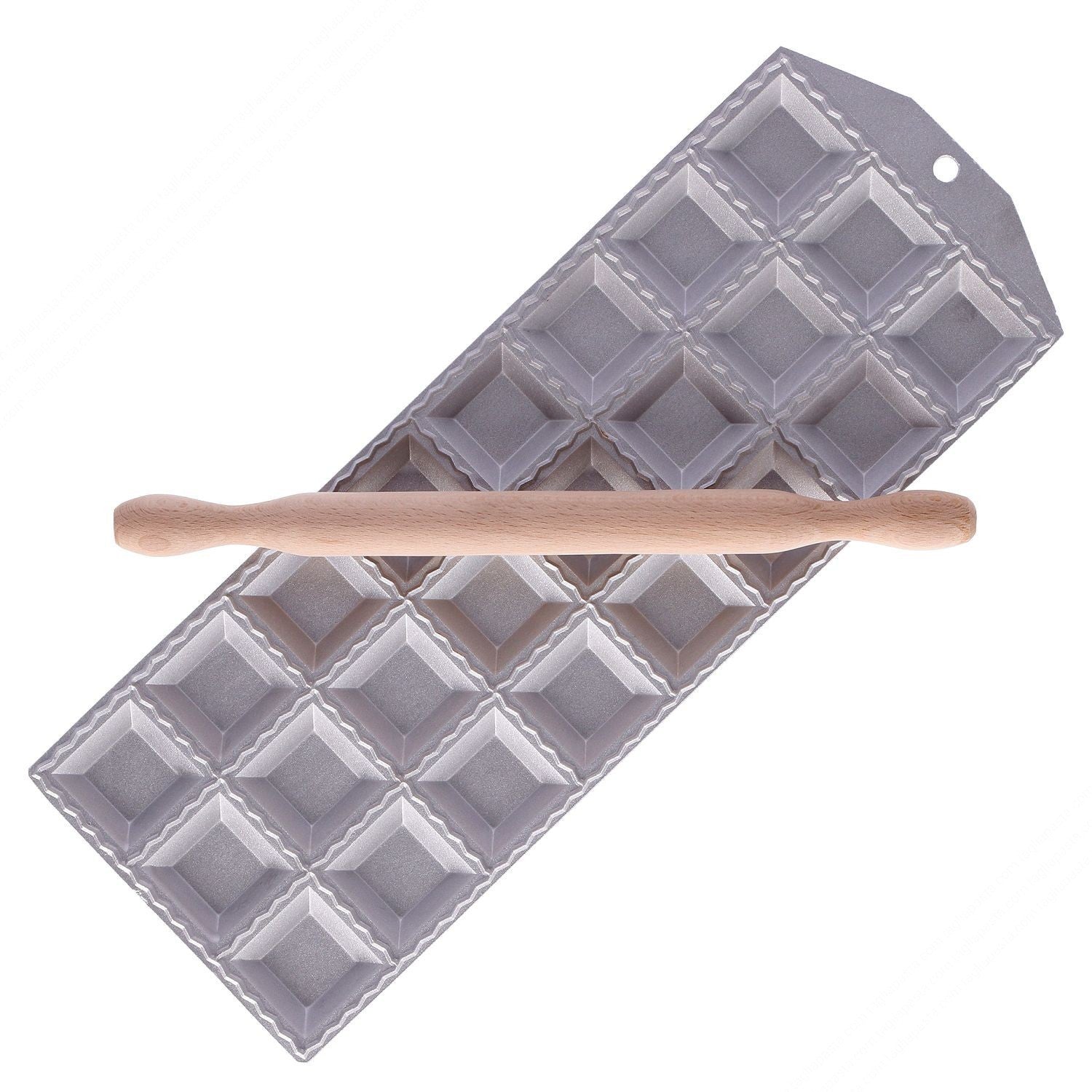 Aluminum Ravioli mold equipped with small wood rolling pin.