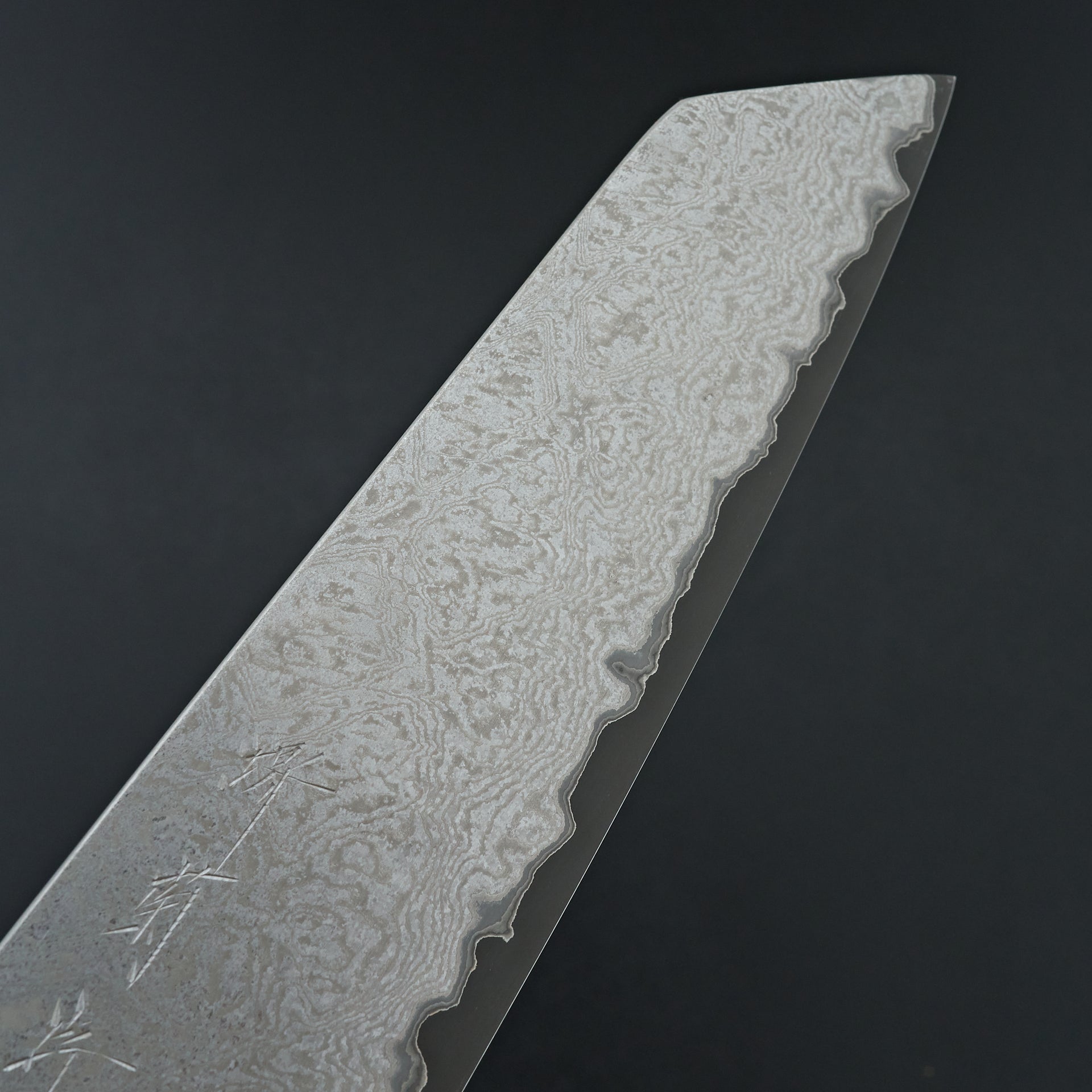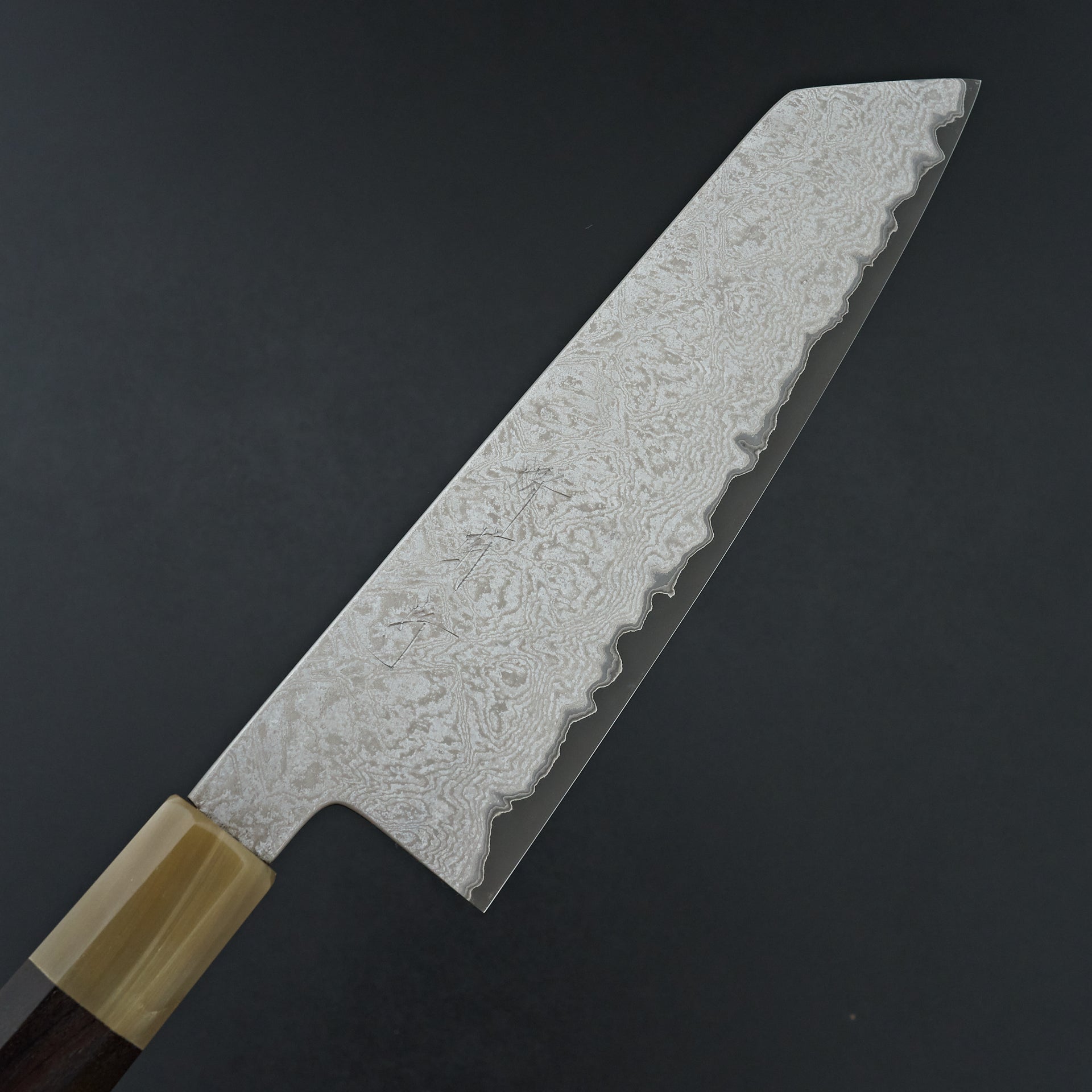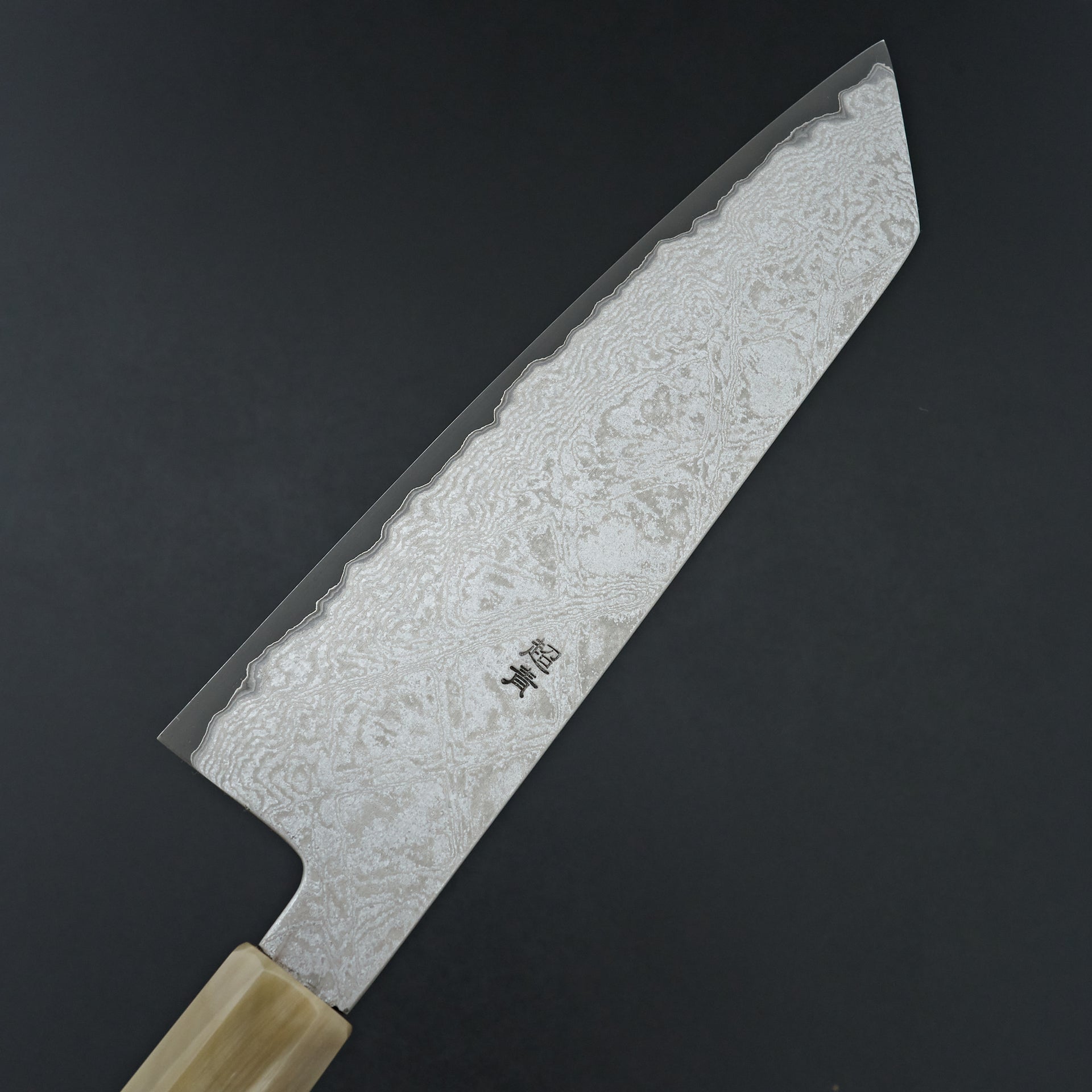 Kawamura Hamono was founded in 1926 in Sakai. Kikumori is praised for their beautiful craftsmanship utilizing traditional techniques specific to their region. This series is forged by Master Yoshikazu Tanaka from Aogami Super Steel cladded in a deep etched stainless damascus. Tanaka San has a beautiful way of tempering Aogami steel, giving it great toughness with outstanding edge life and formation. These are Sharpened thin and convex by one of the most popular sharpeners in Japan at the moment. Fitted with an octagonal ebony and horn ferrule handle.