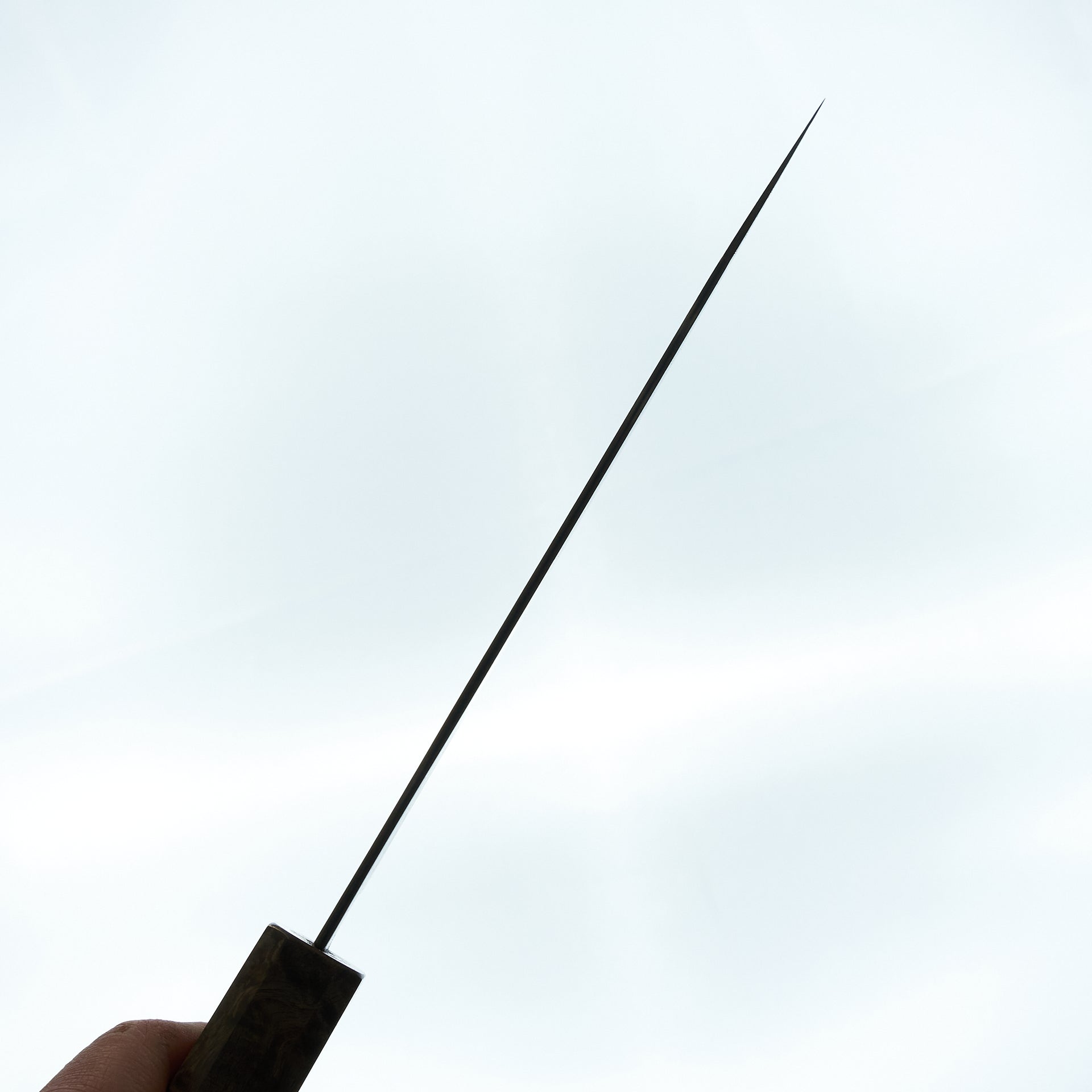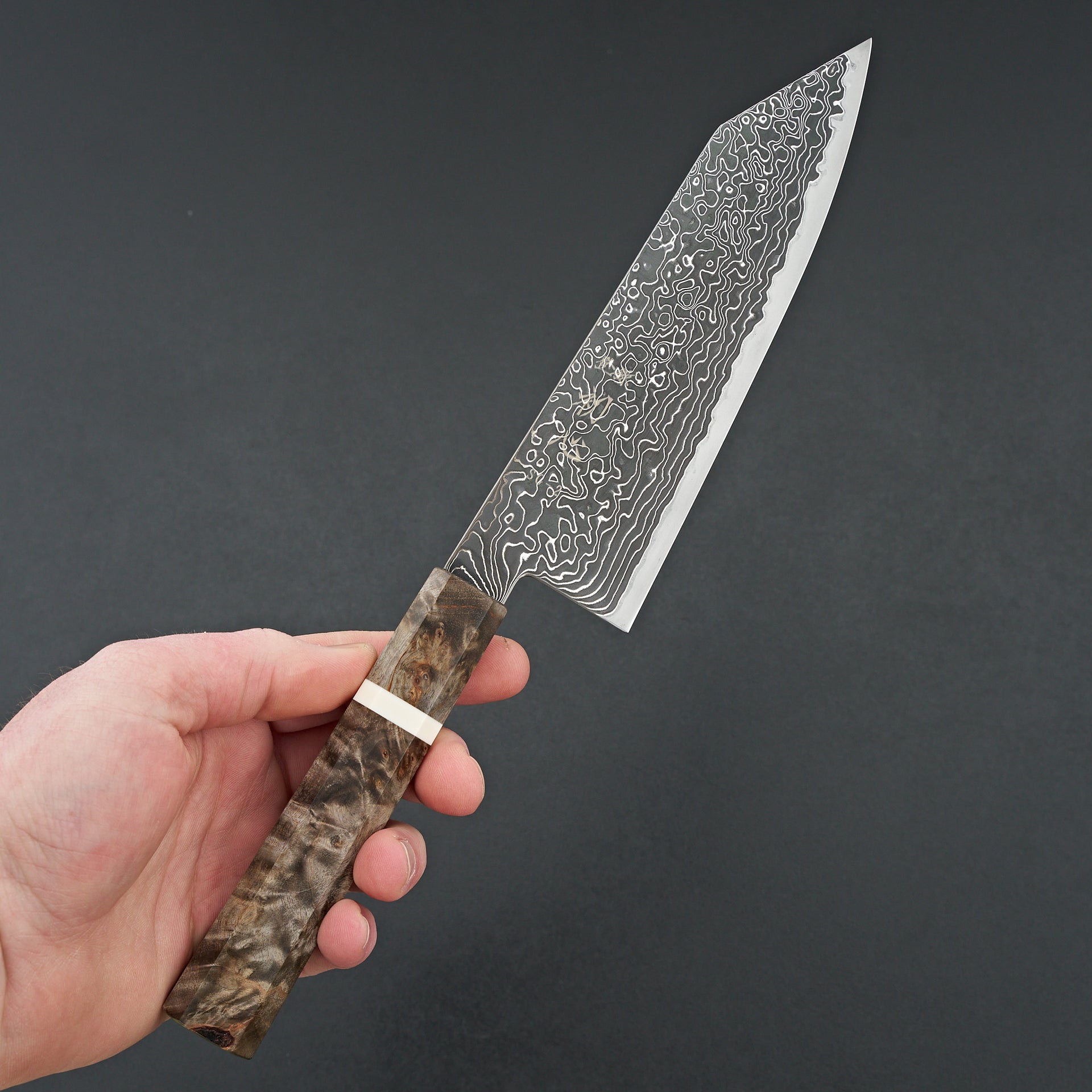 The Hatsukokuro Kurozome series is made using SG2 powdered steel laminated in stainless damascus. The blade has an etched finish to create a high contrast look between the steels. This are ground very thin throughout and are true lasers, The blades are fitted with with figured birch handles with synthetic white spacer.