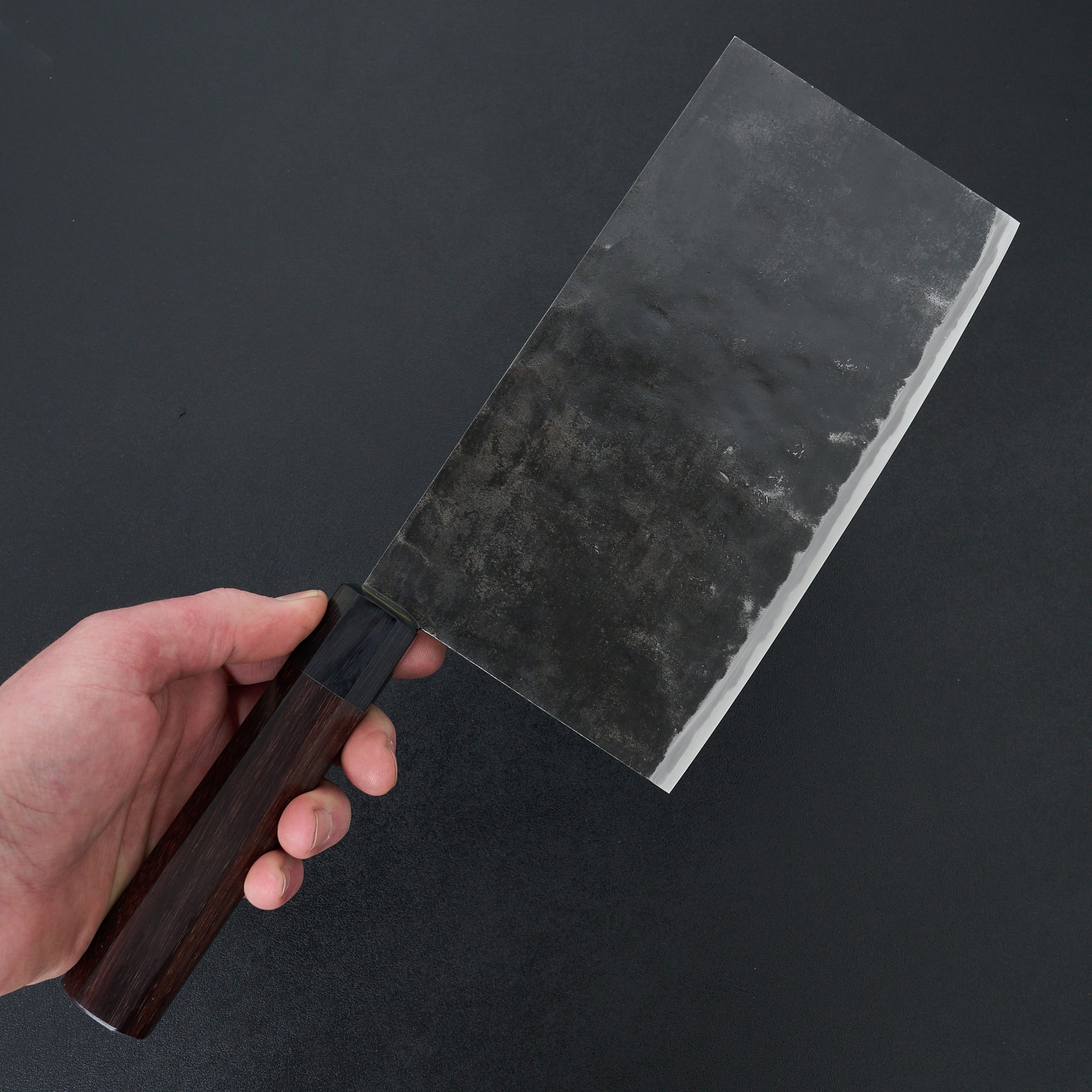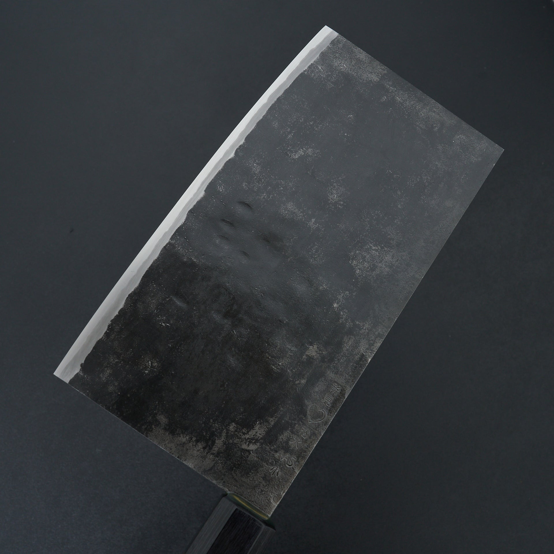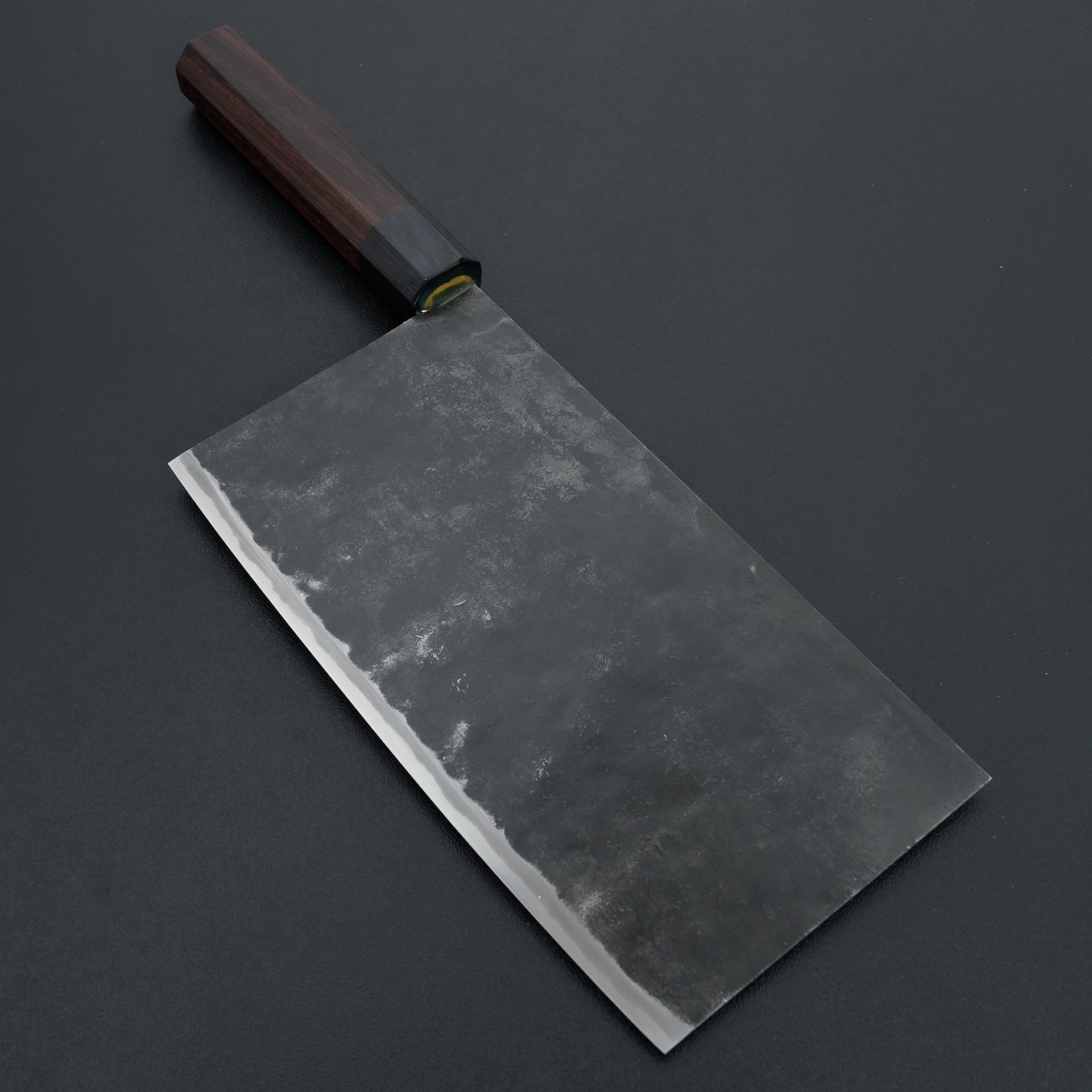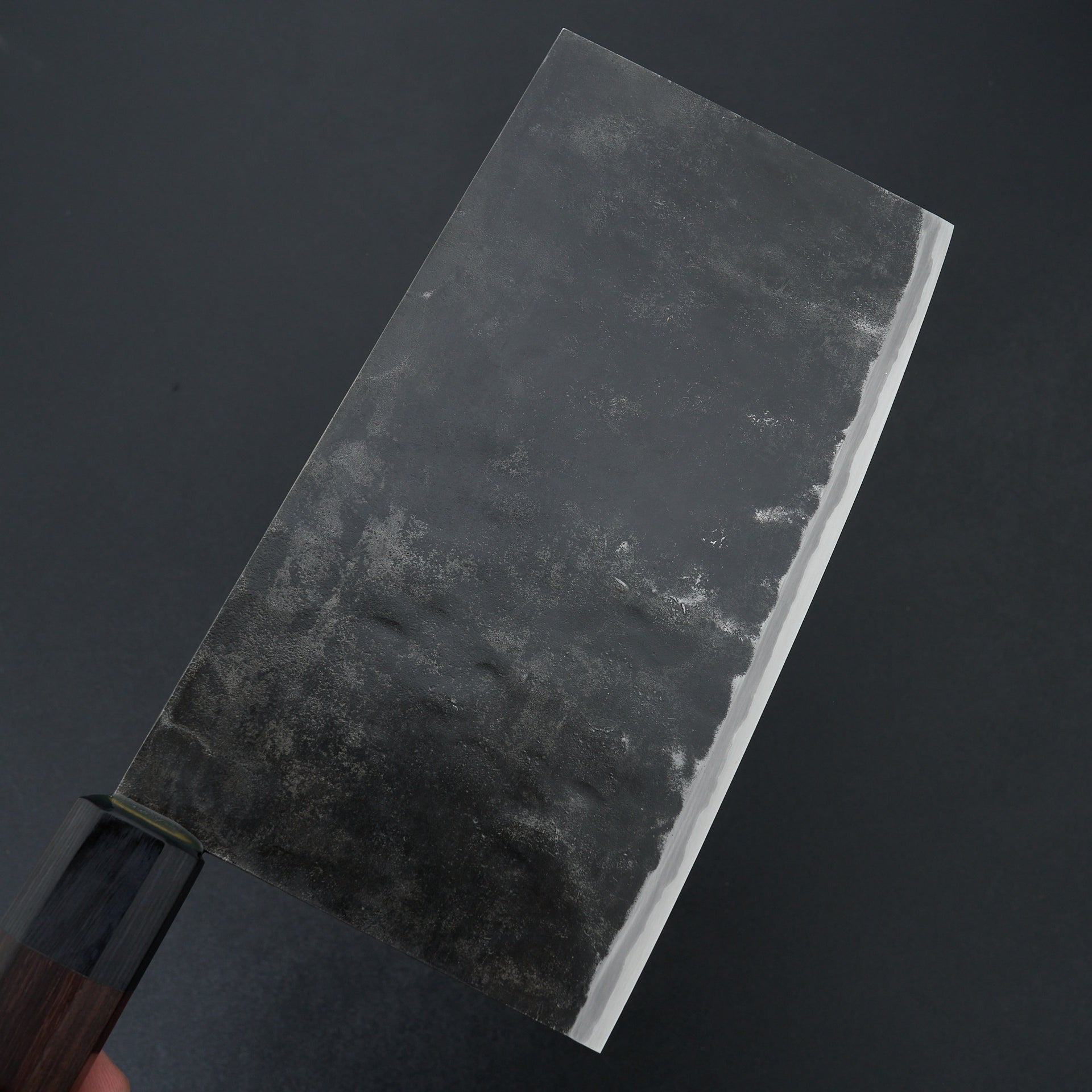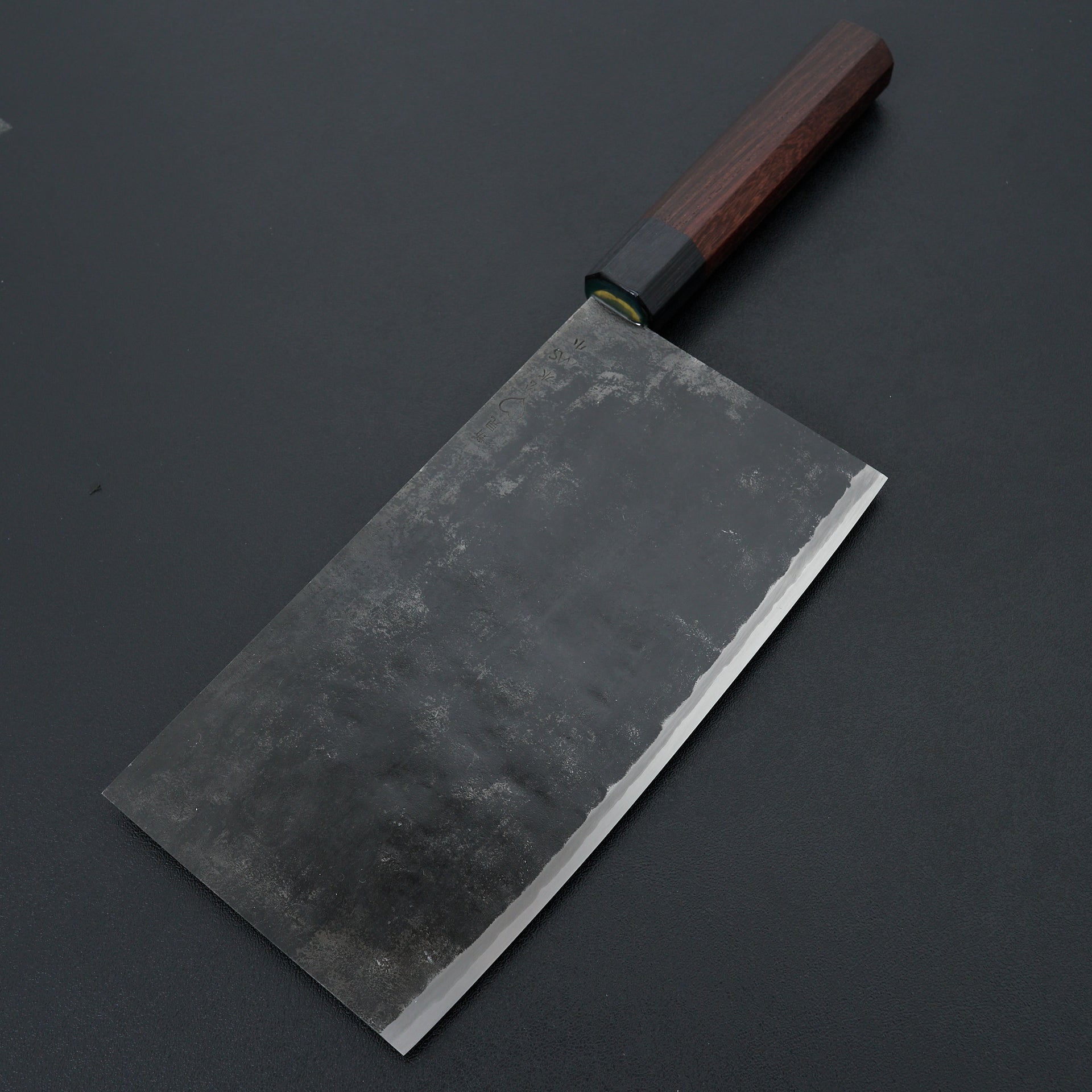 All of his blades are hand forged from Aogami Super Steel and are cladded in stainless (NAS) making these knives very low maintenance. Meticulous heat treatment of the blades helps create amazing edge retention, performance and strength. These knives are thin and lightweight but very balanced, making all of your tasks in the kitchen a complete breeze. All of Takeda's knives are double bevel with a 50/50 grind, making them user friendly to both right or left handed users. The handle is made of rosewood and fitted with a black pakka wood collar.