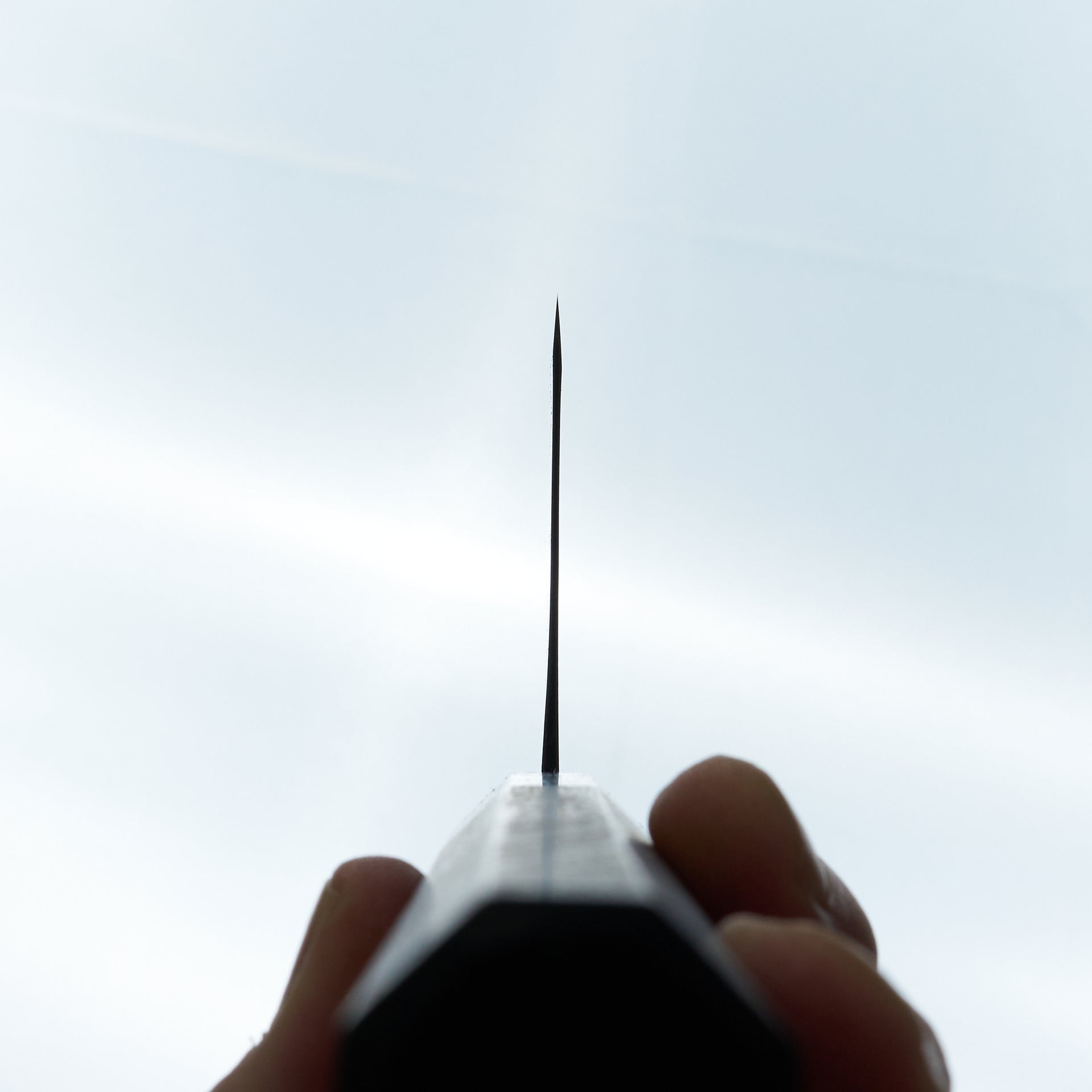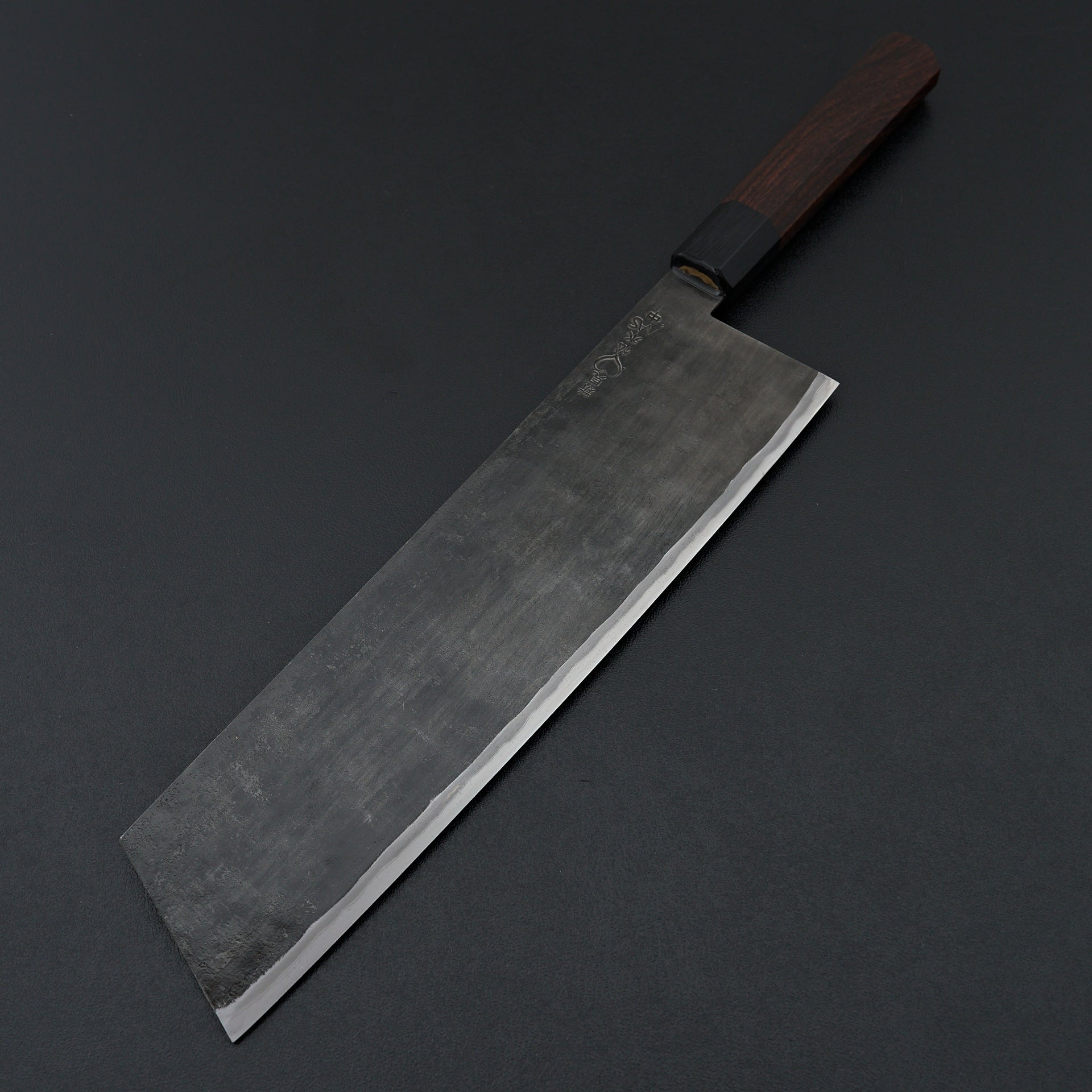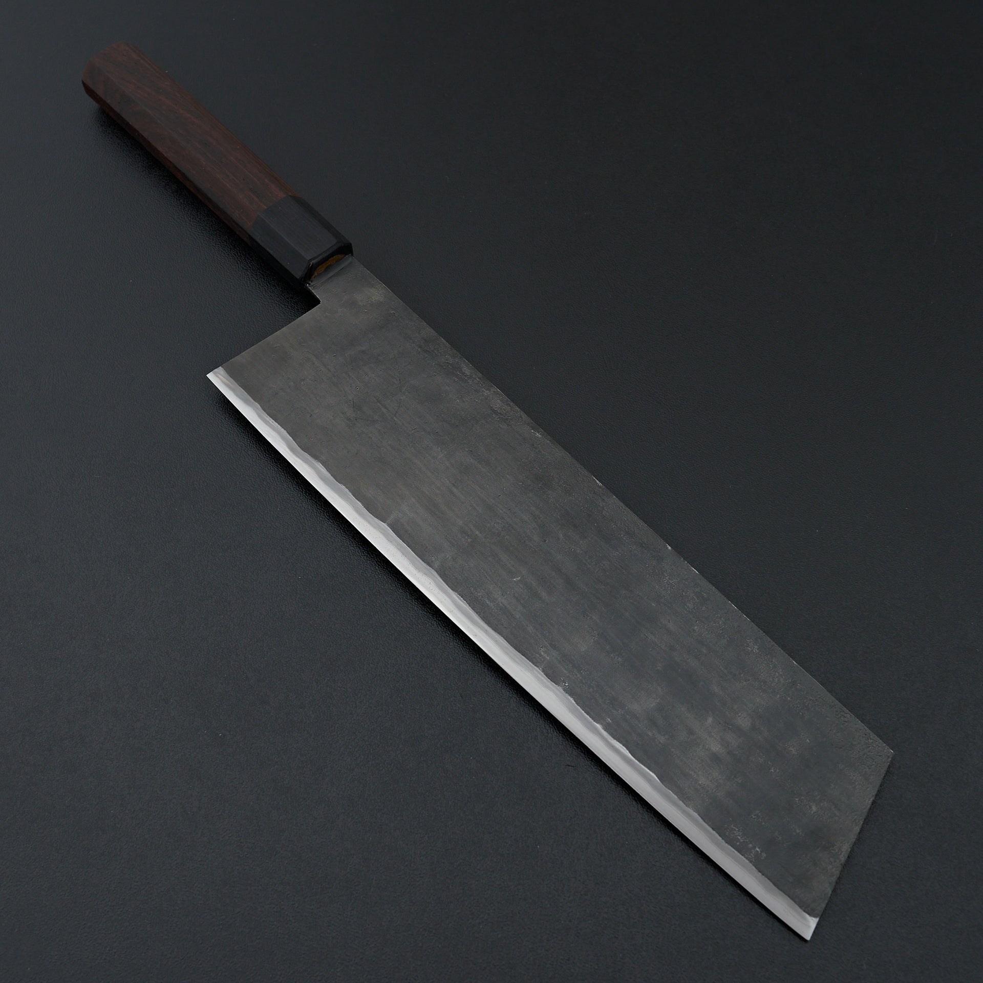 All of his blades are hand forged from Aogami Super Steel and are cladded in stainless (NAS) making these knives very low maintenance. Meticulous heat treatment of the blades helps create amazing edge retention, performance and strength. These knives are thin and lightweight but very balanced, making all of your tasks in the kitchen a complete breeze. All of Takeda's knives are double bevel with a 50/50 grind, making them user friendly to both right or left handed users. The handle is made of maple and fitted with a black pakka wood collar.