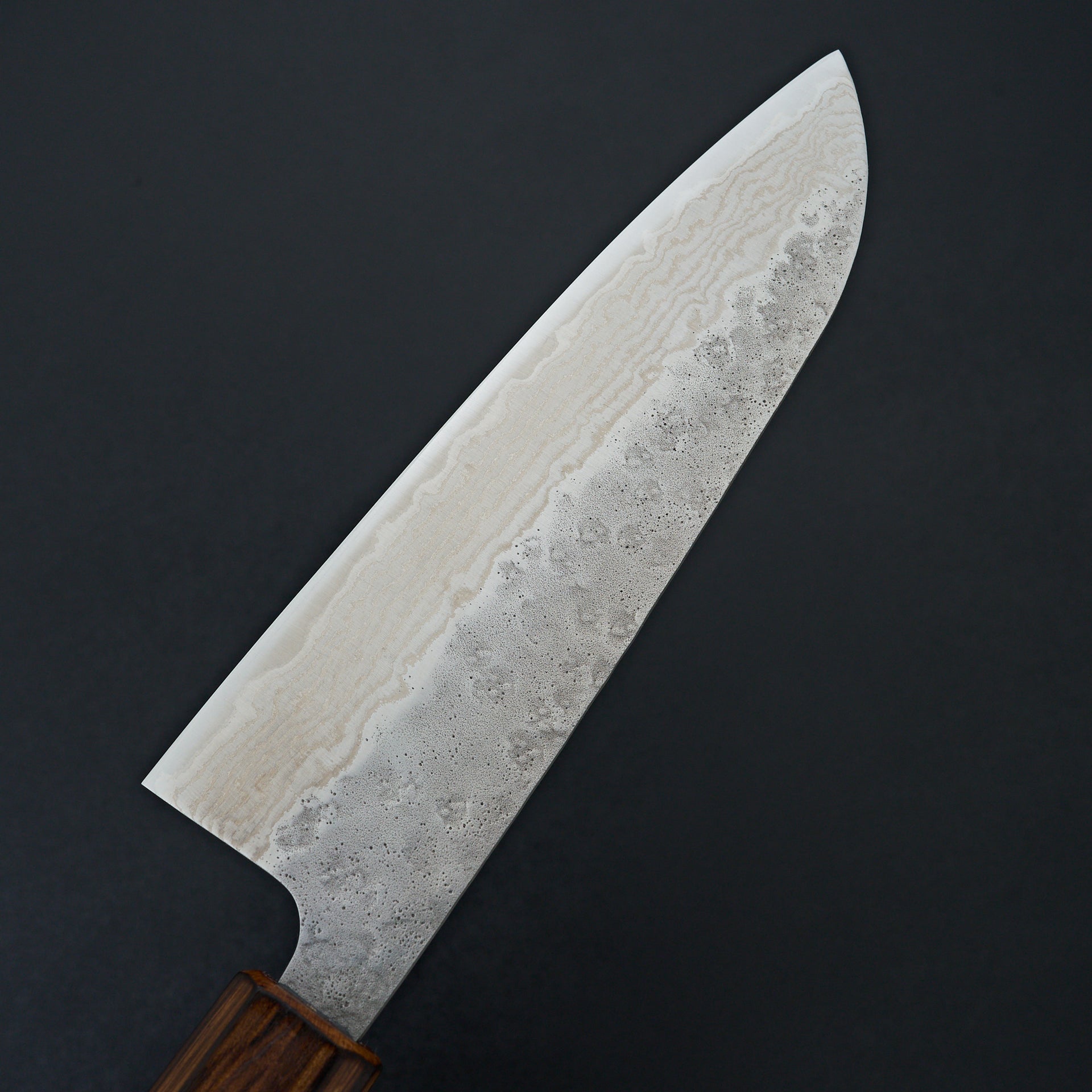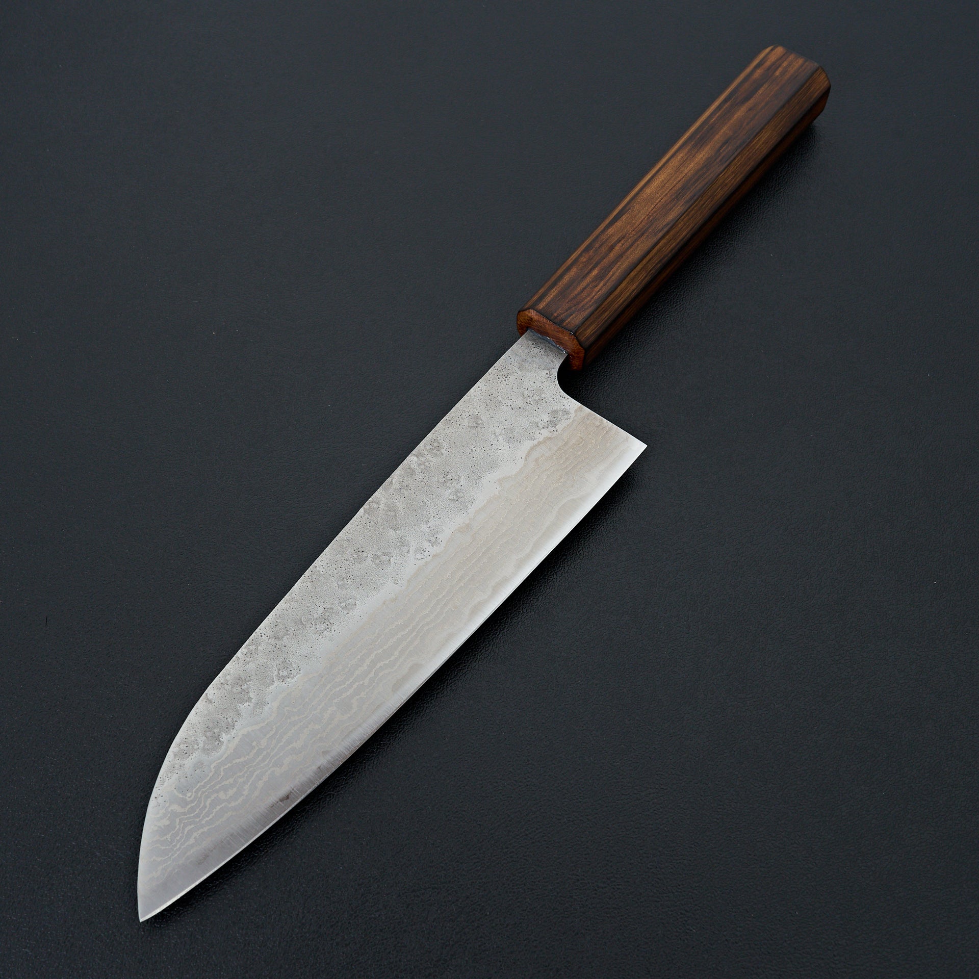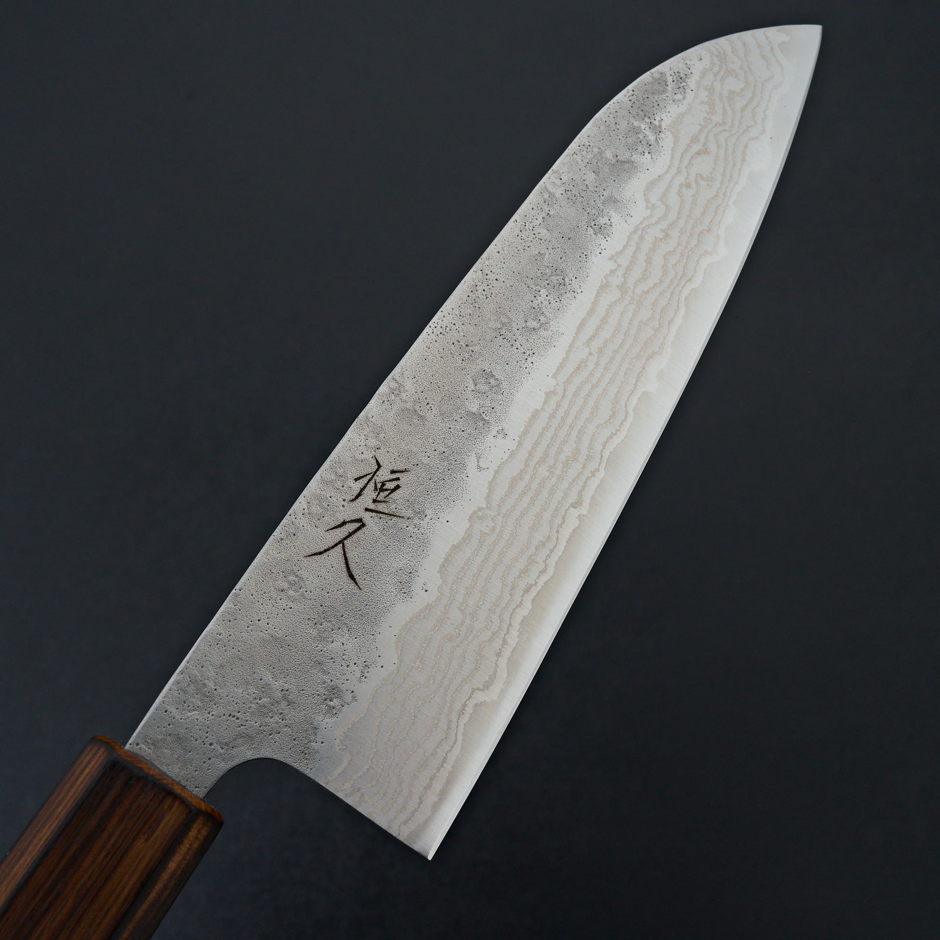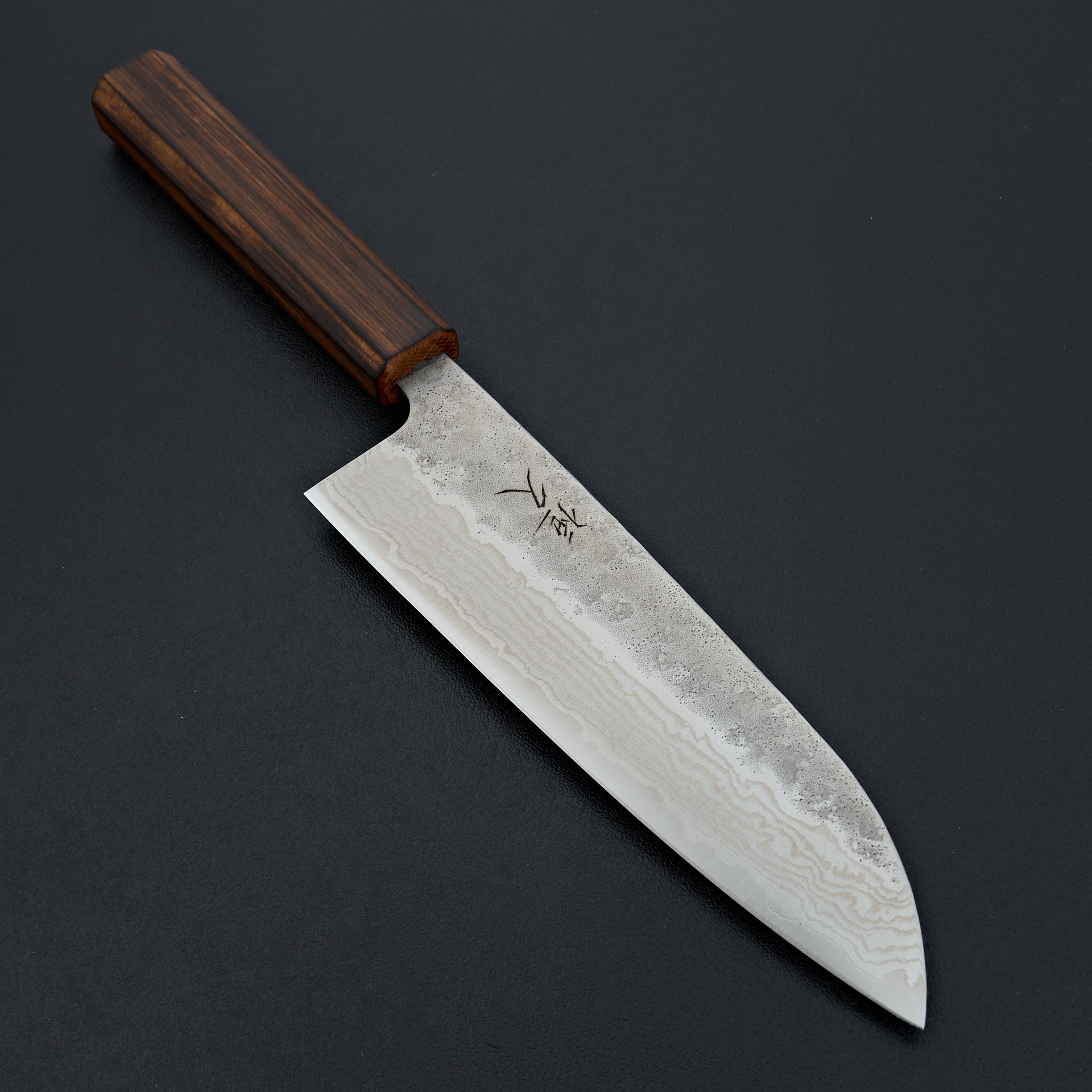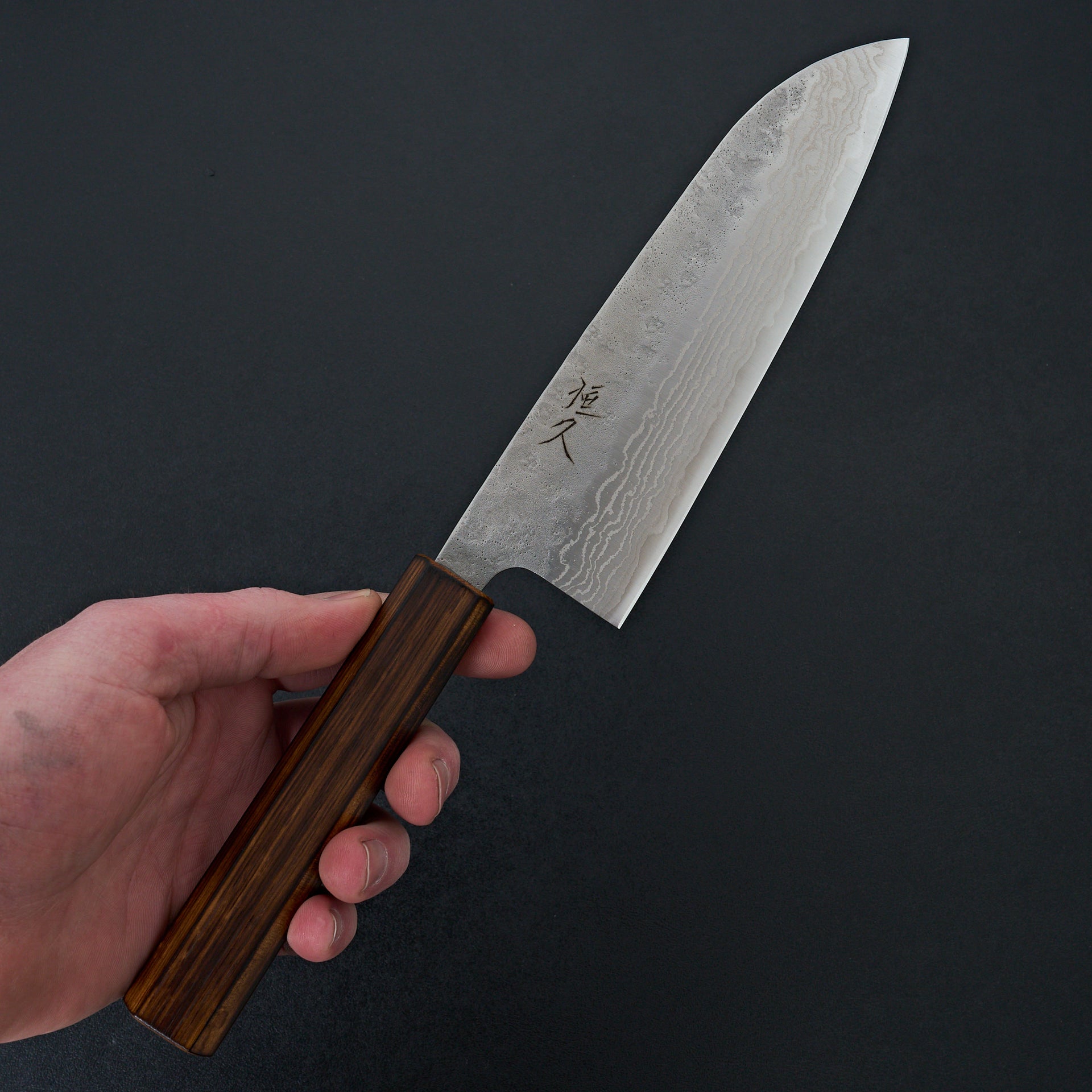 This new series by Tsunehisa uses high carbon stainless 440c steel laminated in stainless damascus cladding. 440c is a very well rounded tool steel with great toughness and wear resistance. This steel naturally has a great toothiness to the edge will assist in its edge retention. The blade face has a polished damascus on the bevels and a natural hammered nashiji texture on the top side. These are nimble and smooth cutting, while not being too delicate. Comes fitted with a burnt oak wood octagonal handle.