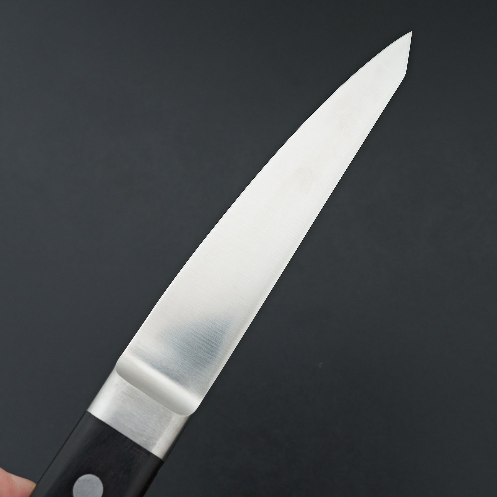 The Tsunehisa AUS8 Migaki is constructed from single piece stainless AUS-8 steel heat treated to 59 HRC. This series is great for professional or home cooks who want an extremely reliable and durable knife that still cuts very smoothly. This will compare to the durability of thicker European blades but cut much more effortlessly. The blade is full tang construction fitted with riveted black pakka wood handles.