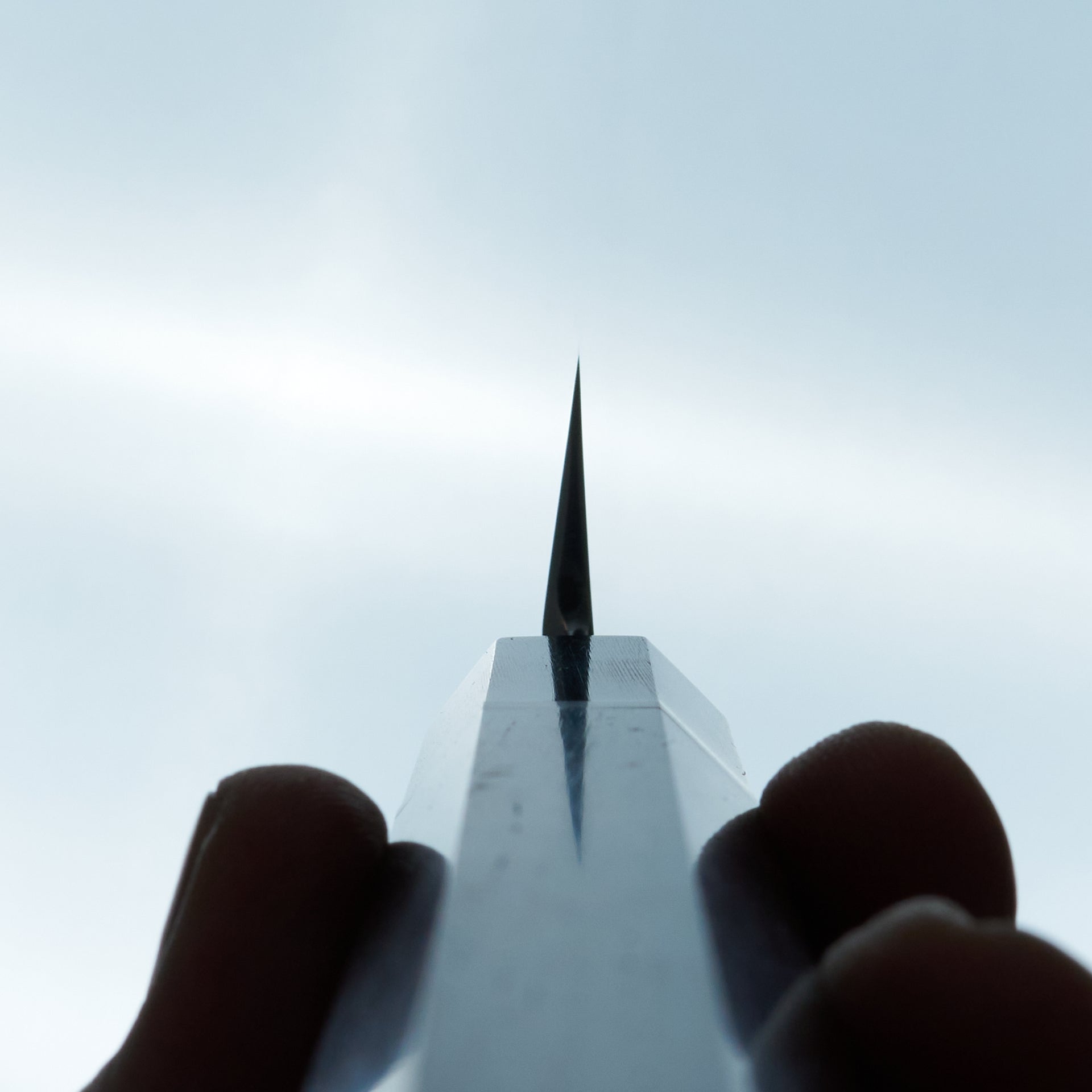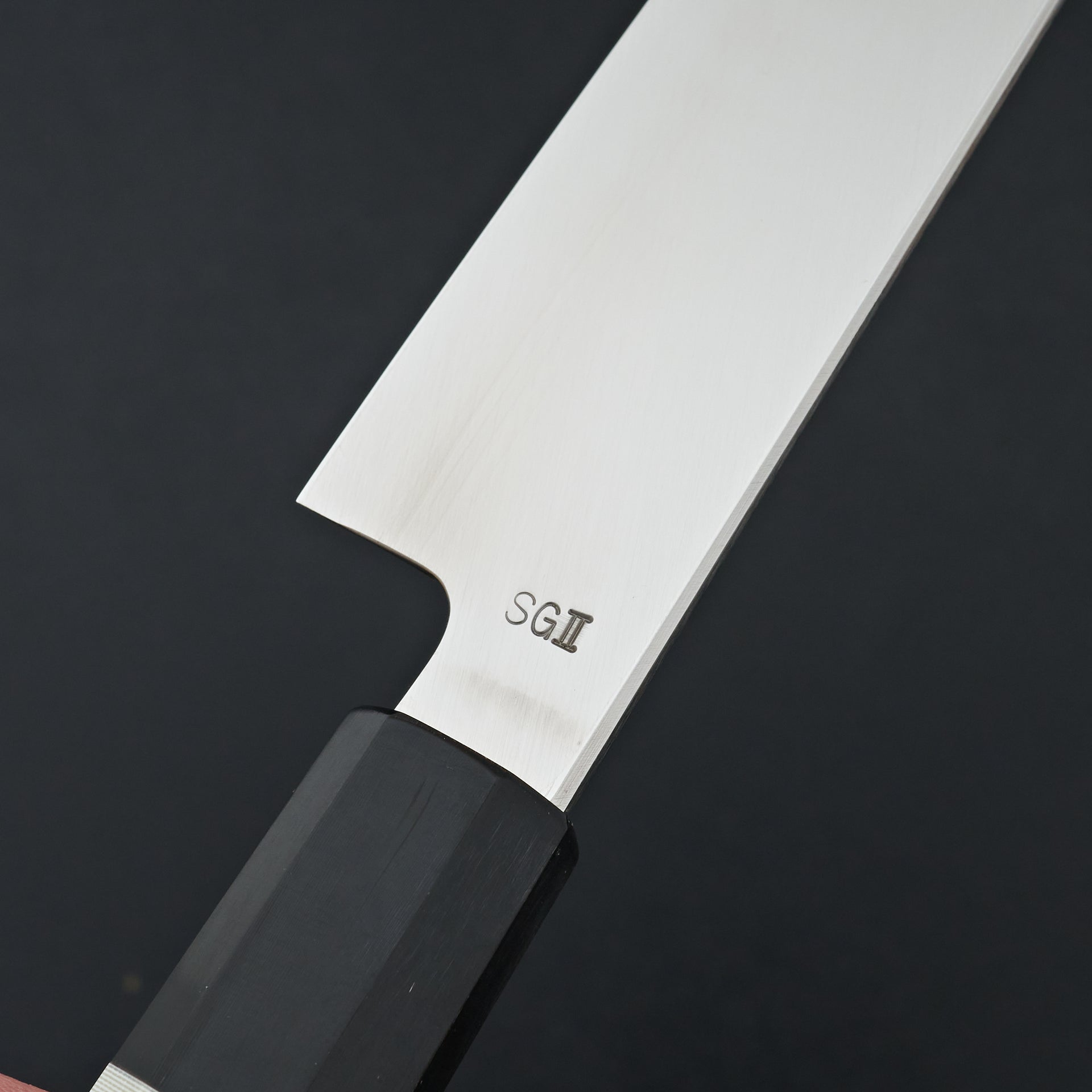 Kawamura Hamono was founded in 1926 in Sakai. Kikumori is praised for their beautiful craftsmanship utilizing traditional techniques specific to their region. This blade is forged using SG2 powdered steel laminated with soft stainless by Master Nakagawa. The blade is mirror finished with beautiful finishing work. The handle is octagonal ebony and white spacer.