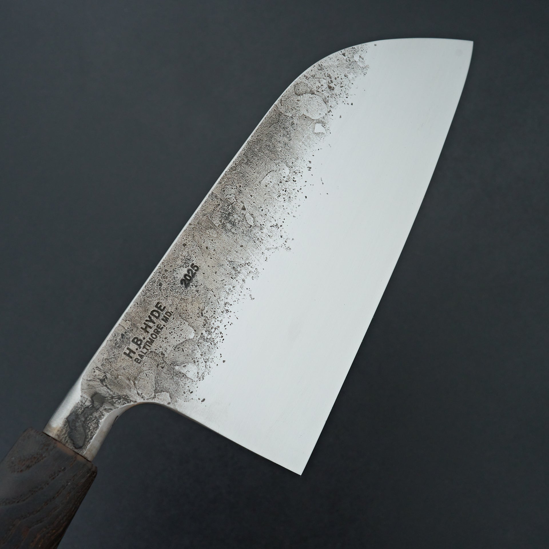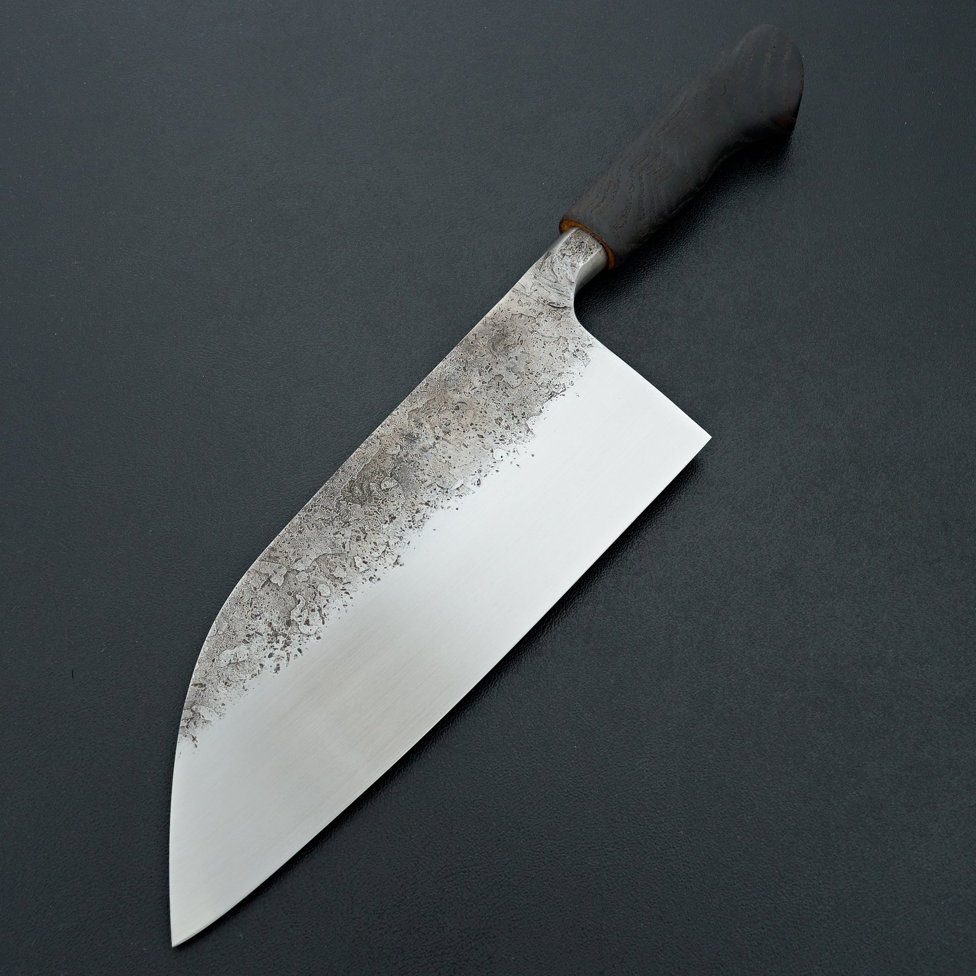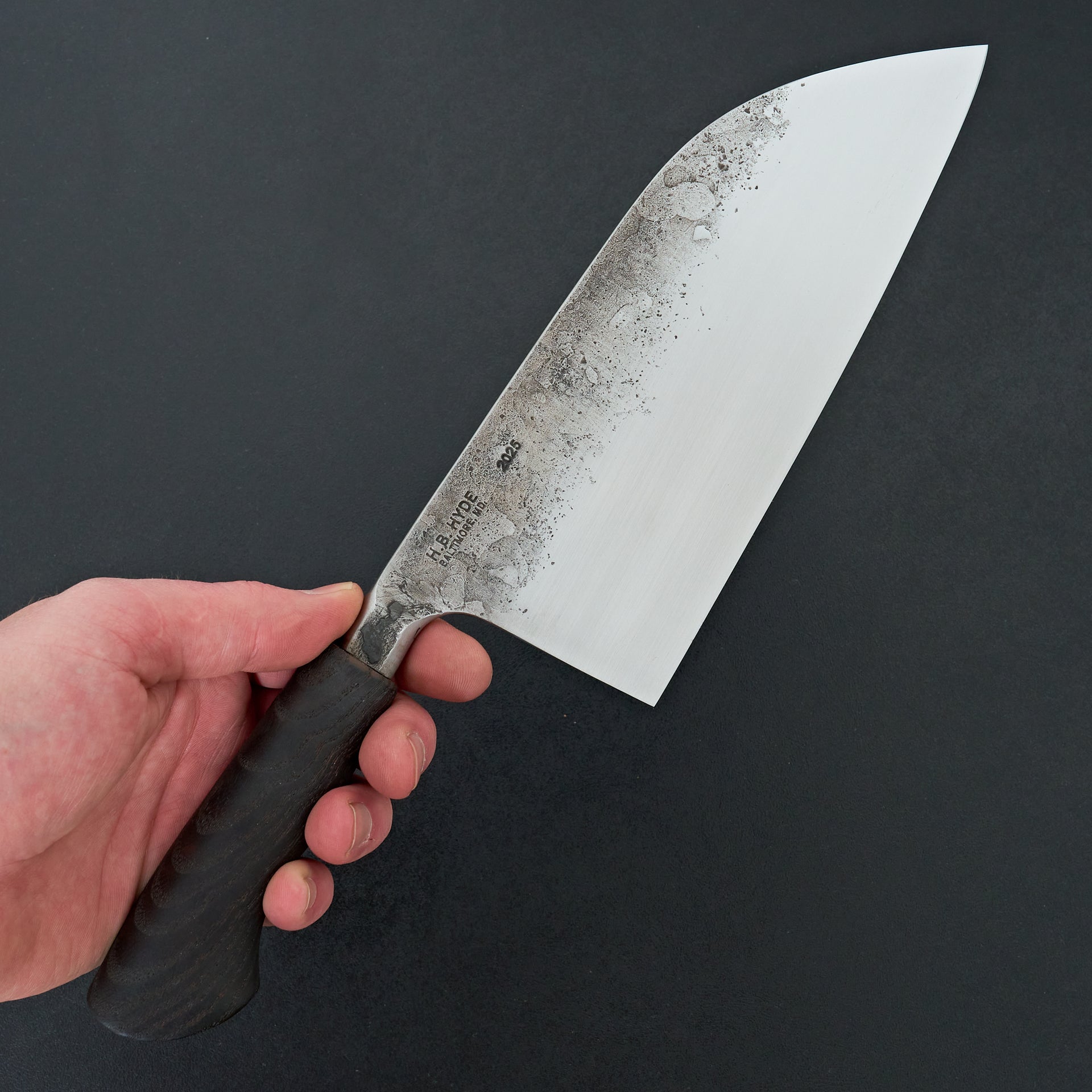 Hyde Handmade Knives are based out of Baltimore, MD by bladesmith Henry Hyde. This blade was hand forged from 125cr1 high carbon steel and left with some natural texture from forging. The octagonal handle is made from charred ash wood. The fit and finish is excellent with rounded spine and choil. This blade has a very tall heel height and a very nice feel in hand. This beast will be super fun for high volume prep work. This is a thin style cleaver and should not be used for chopping bones or harder ingredients.