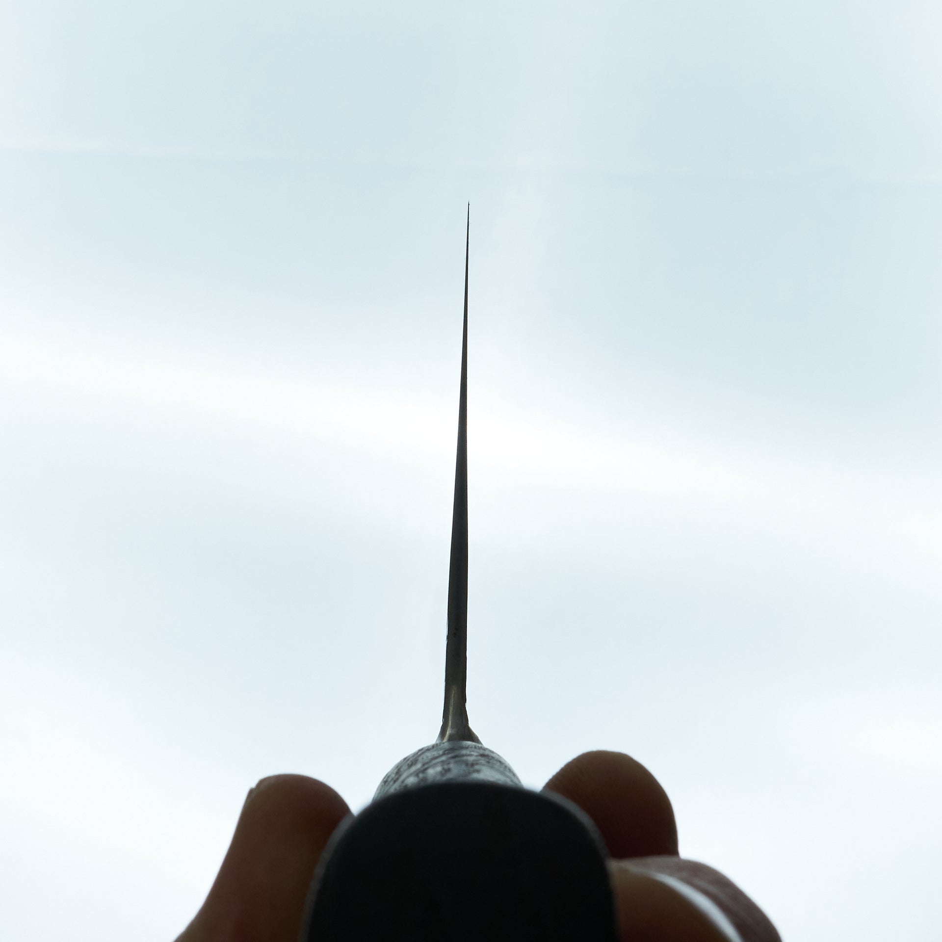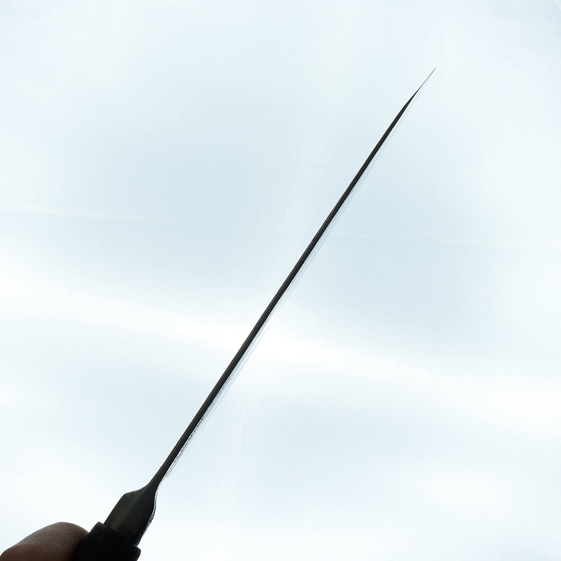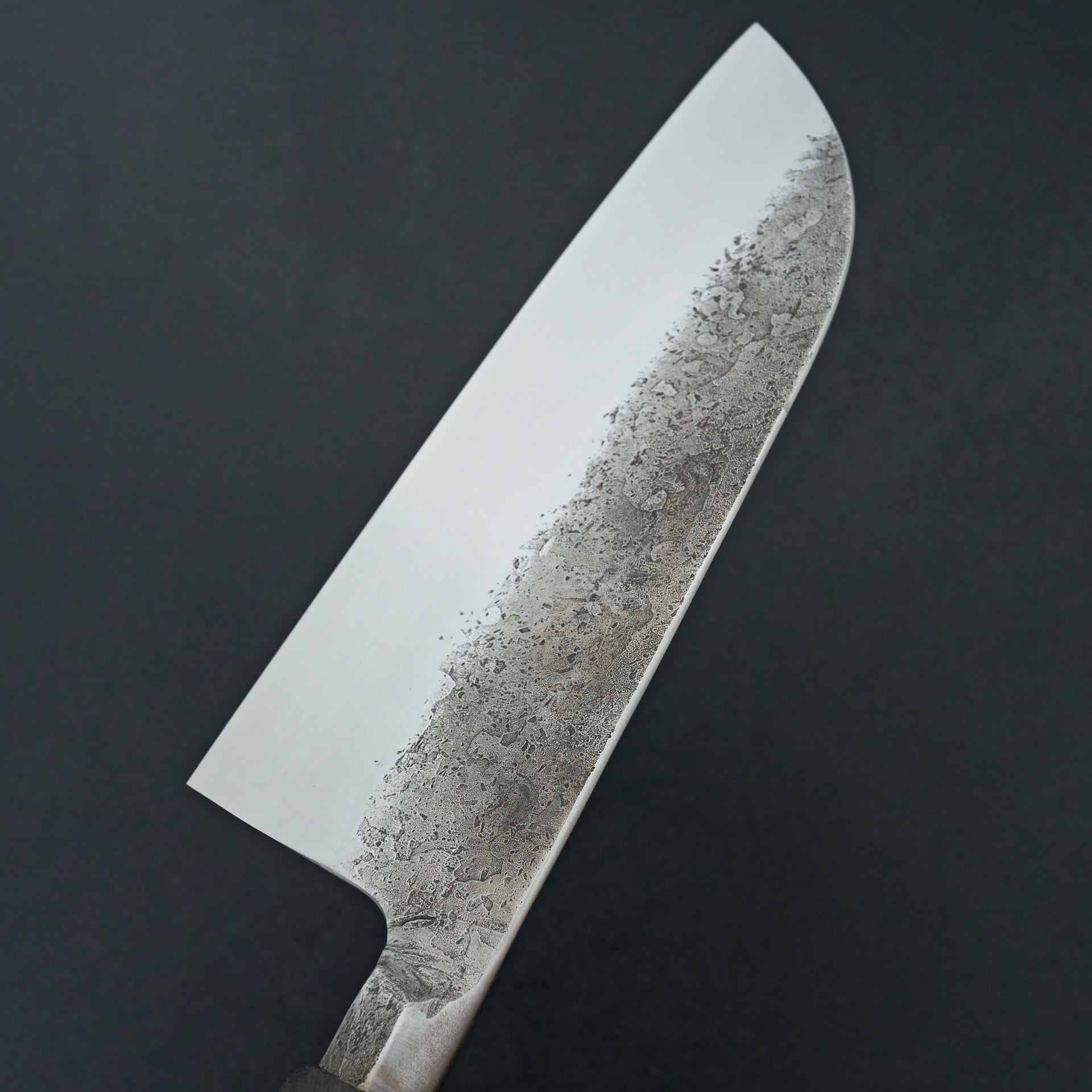 Hyde Handmade Knives are based out of Baltimore, MD by bladesmith Henry Hyde. This blade was hand forged from 125cr1 high carbon steel and left with some natural texture from forging. The octagonal handle is made from charred ash wood. The fit and finish is excellent with rounded spine and choil. This blade has a very tall heel height and a very nice feel in hand. This beast will be super fun for high volume prep work. This is a thin style cleaver and should not be used for chopping bones or harder ingredients.