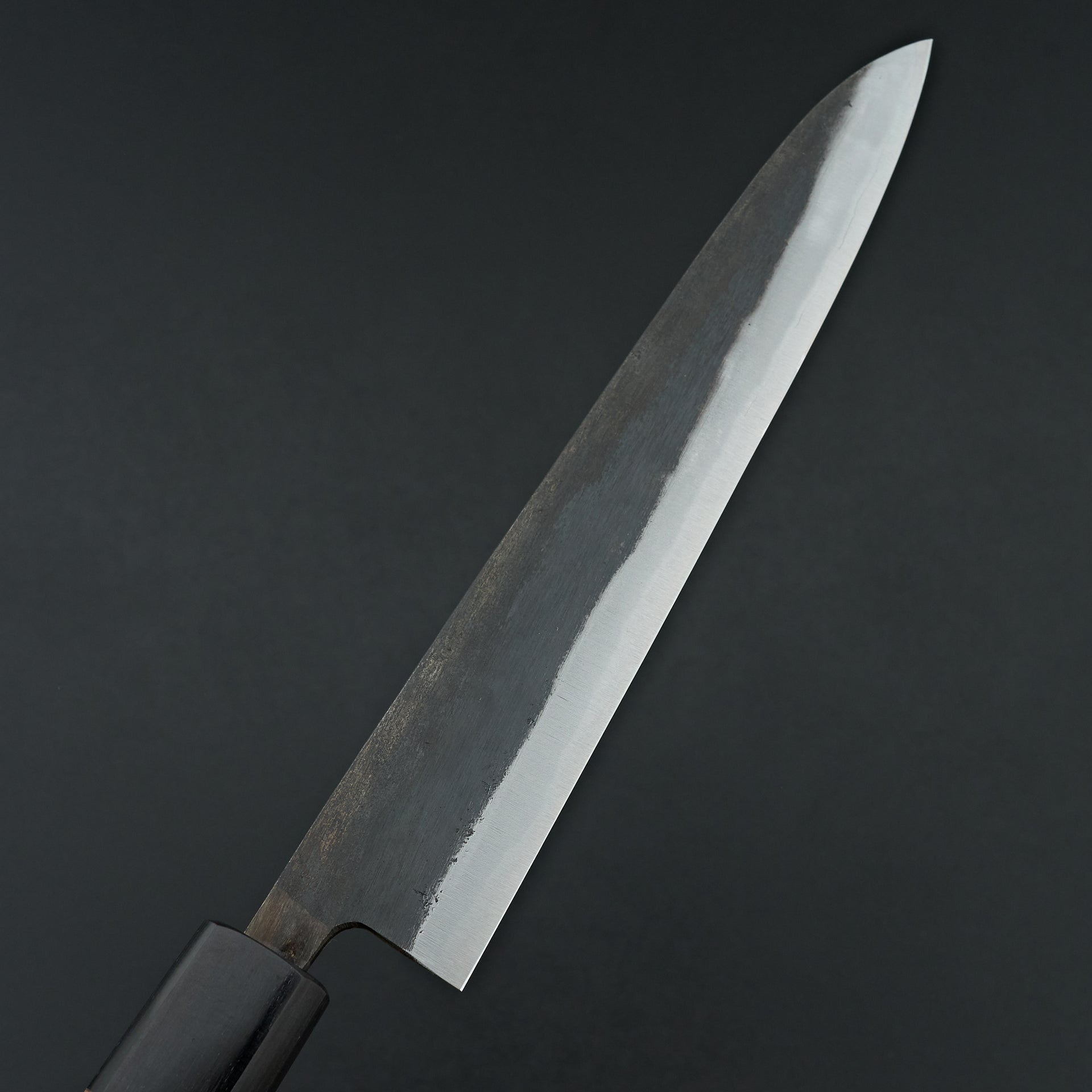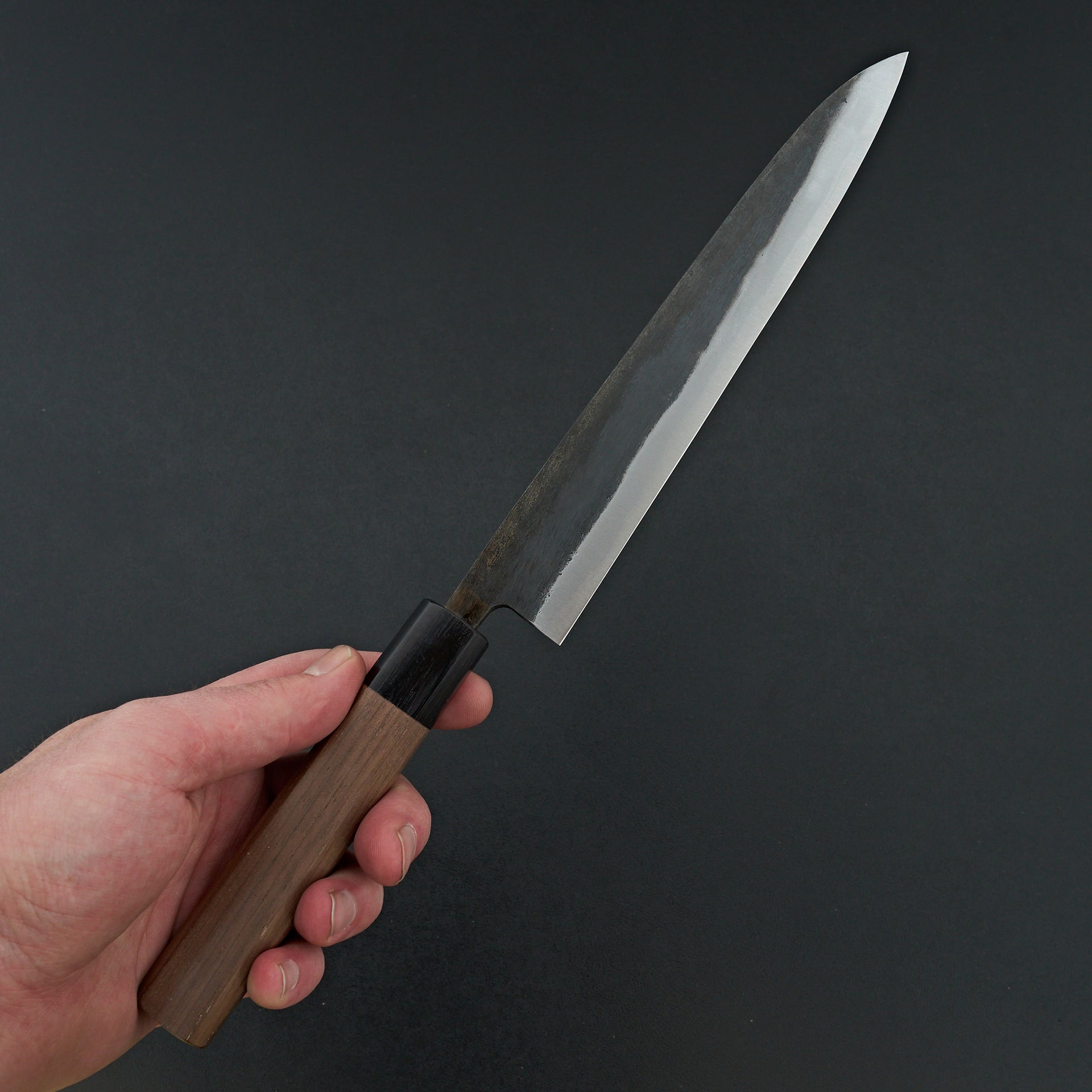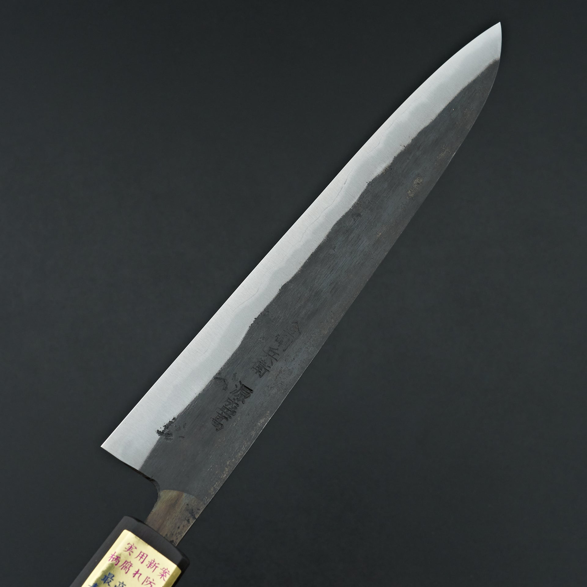 Moritaka knives today are forged with the same mentality and tradition. These knives are forged from Aogami Super steel cladded in soft iron and kurouchi finish. Moritaka forge welds a stainless tang that is a different steel from the blade to ensure longevity and hygiene of the knife for years to come.