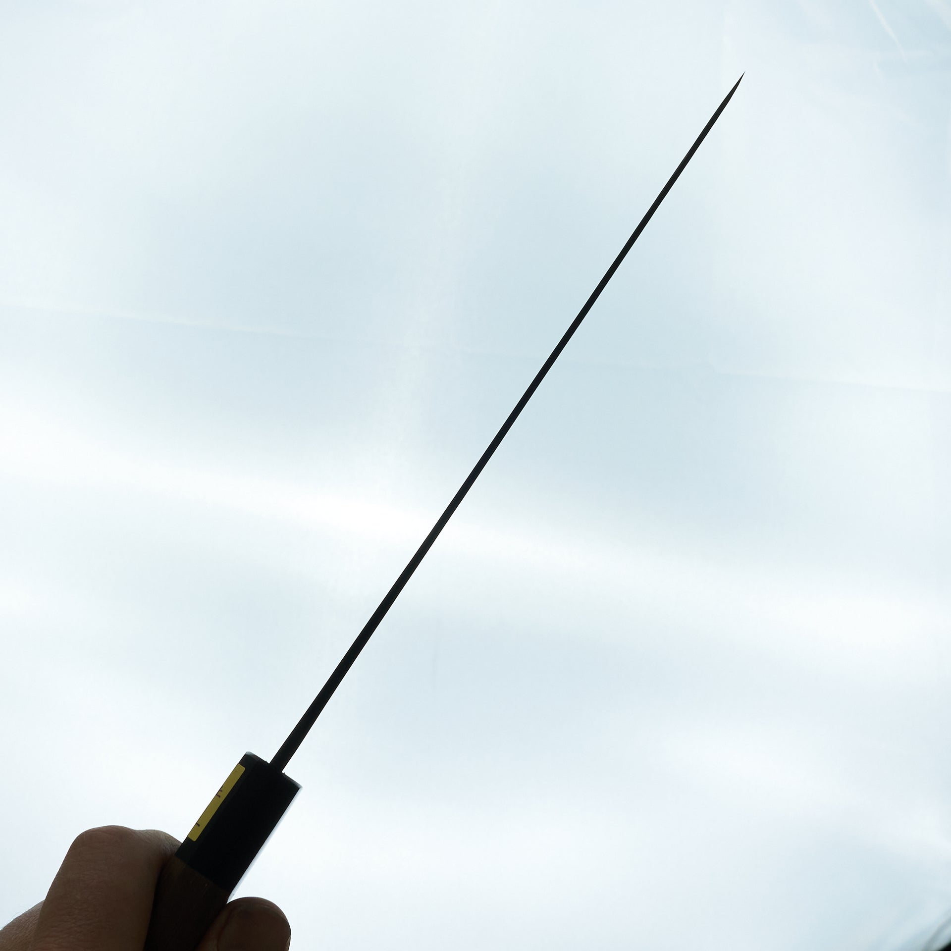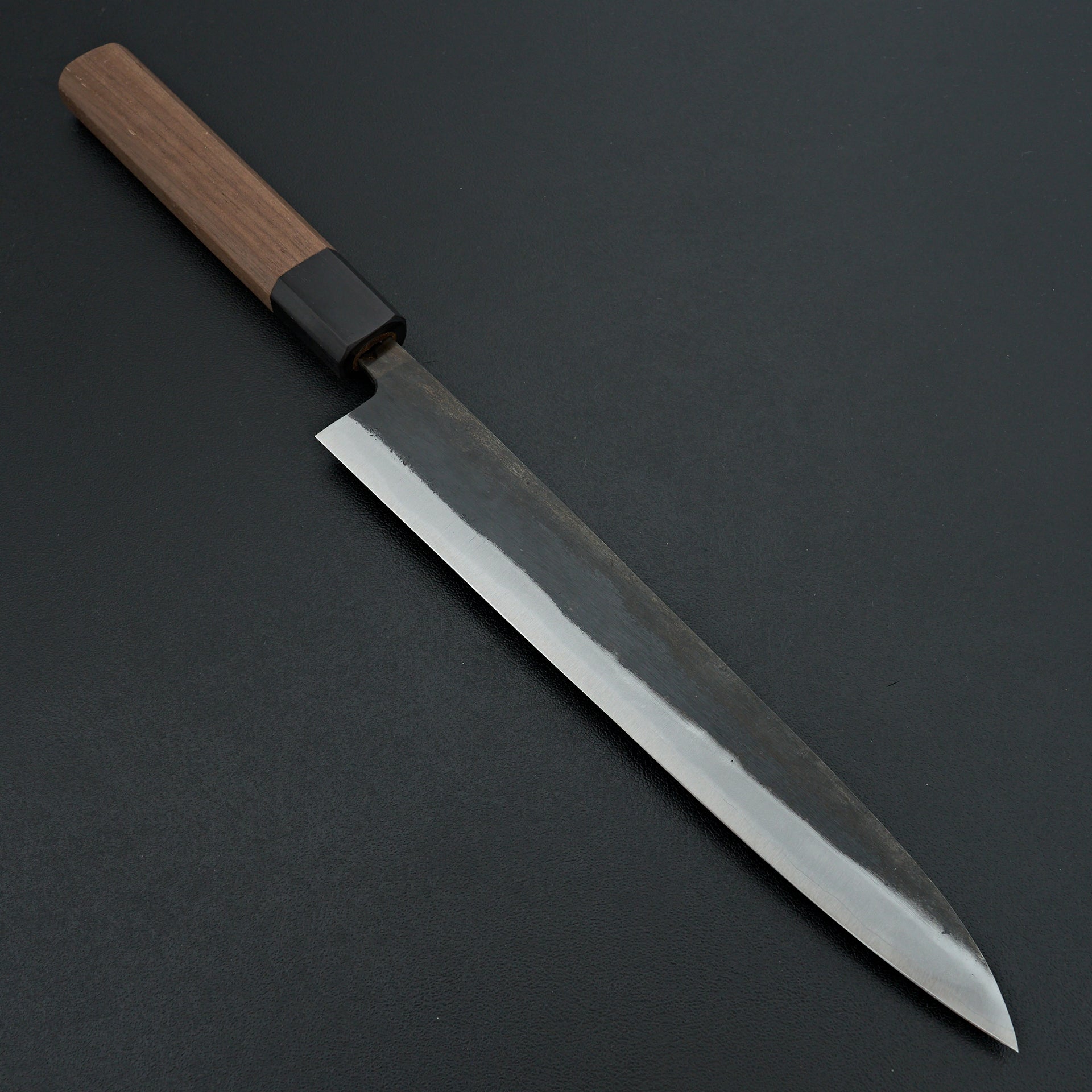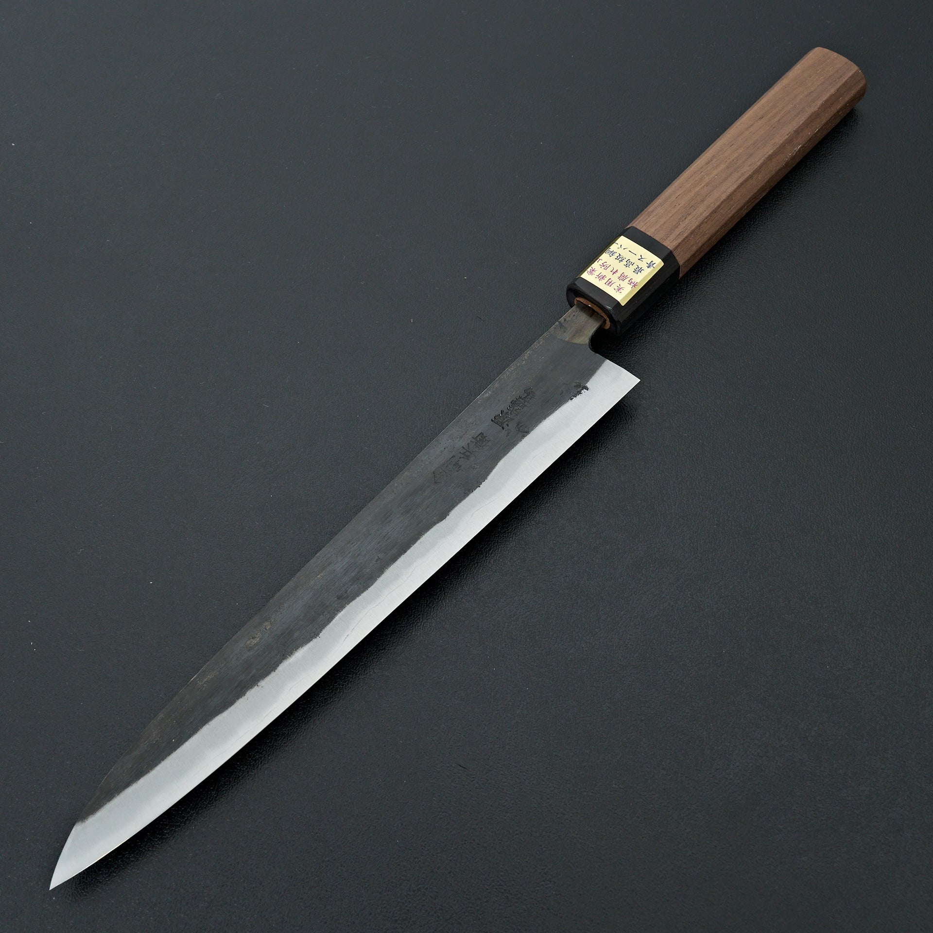 Moritaka knives today are forged with the same mentality and tradition. These knives are forged from Aogami Super steel cladded in soft iron and kurouchi finish. Moritaka forge welds a stainless tang that is a different steel from the blade to ensure longevity and hygiene of the knife for years to come.