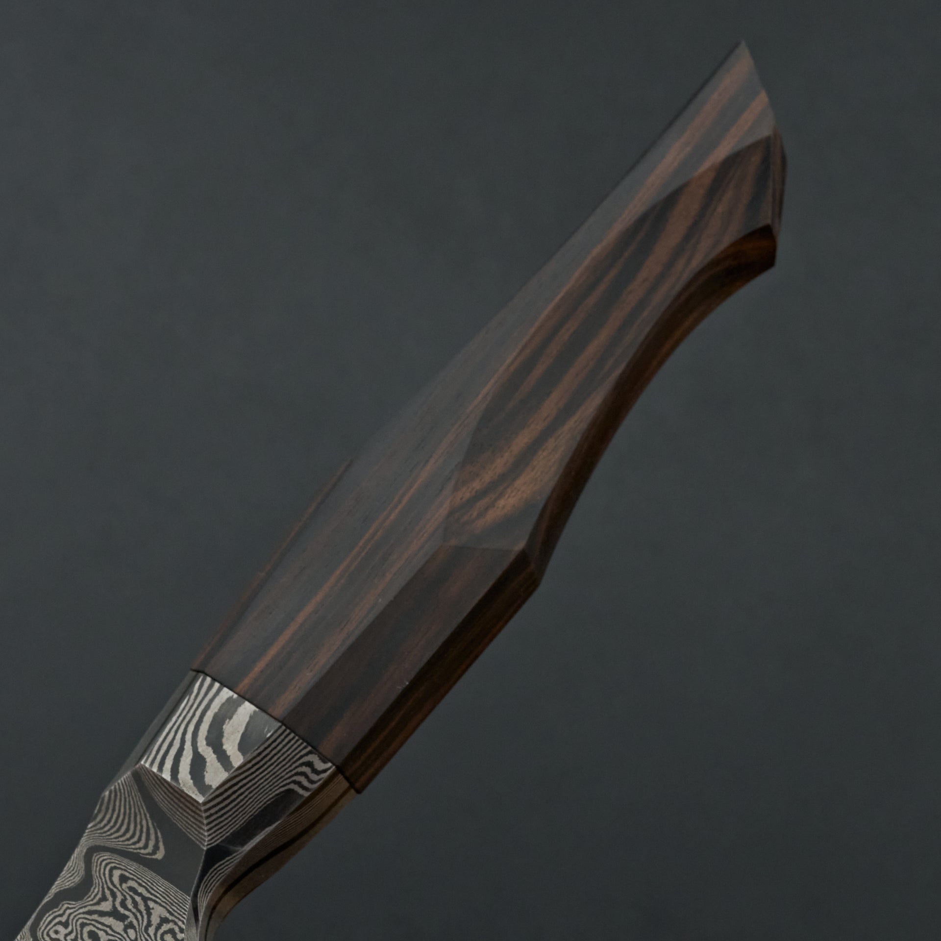 This blade is a hand forged integral damascus chefs knife made from 1084 and 15n20 high carbon steel hardened to about 61hrc. The blade features a full integral bolster which displays the damascus pattern running throughout.  The hybrid western handle is made from makassar ebony sporting a heirloom fit. This knife is very comfortable in hand and has great balance.